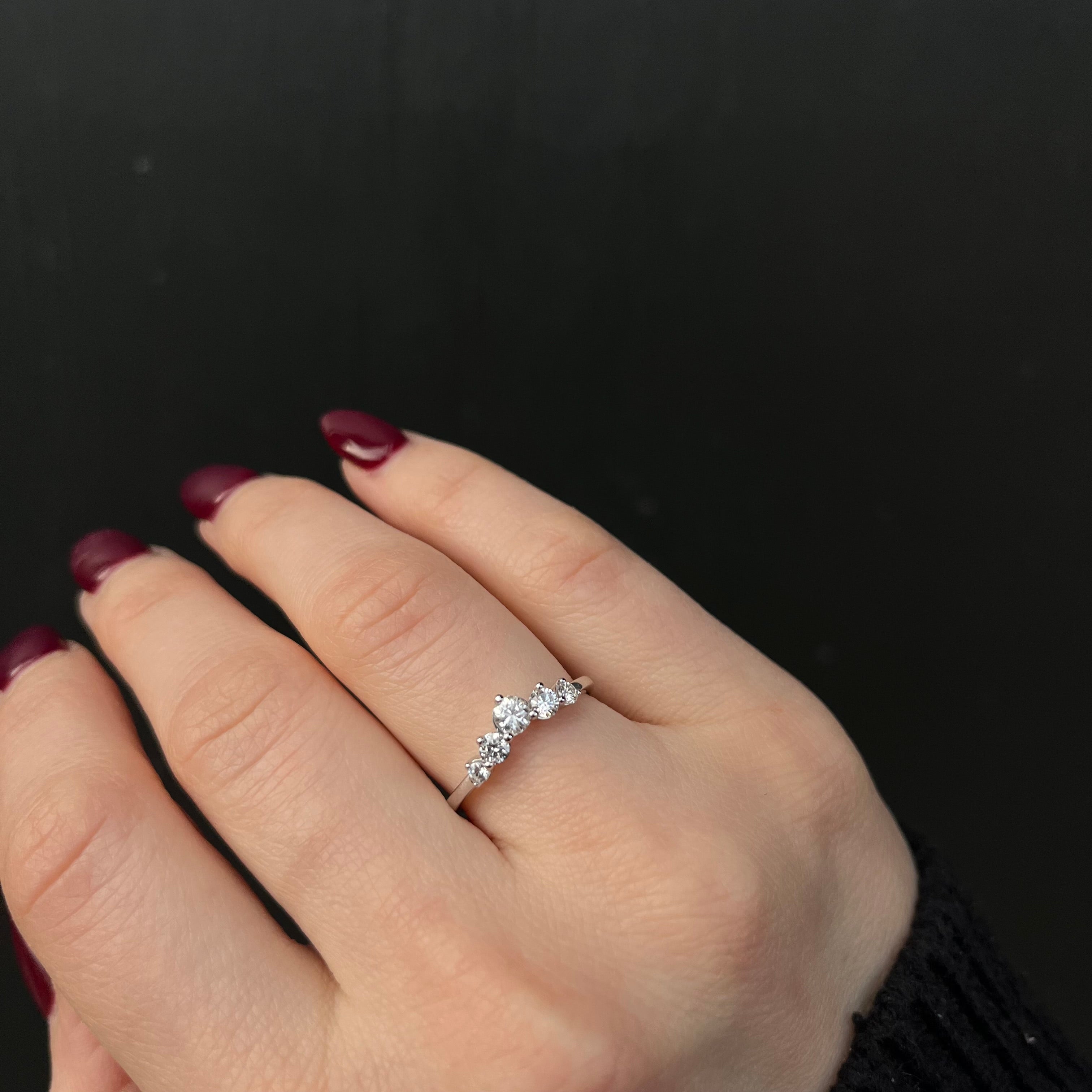 14k white gold diamond band. This glittering diamond band showcases five round brilliant cut diamonds tapering in size from the center. The diamonds form a gentle curve to beautifully pair with an engagement ring or create a statement all on its own.