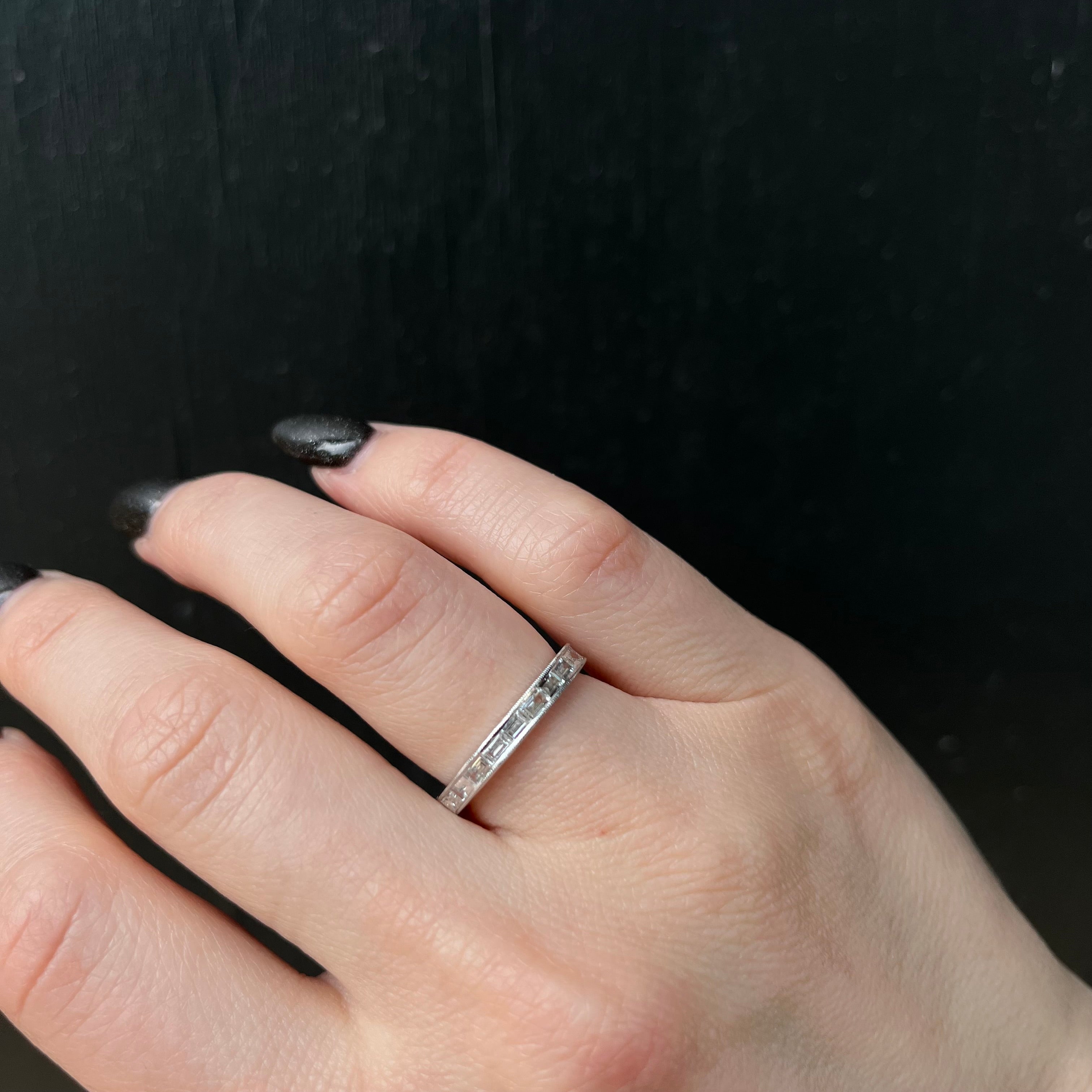 14k white gold and diamond band. Baguette diamonds seamlessly lay side by side in this sleek 14k white gold channel setting. This design lends a chic look to your wedding set or diamond band stack!