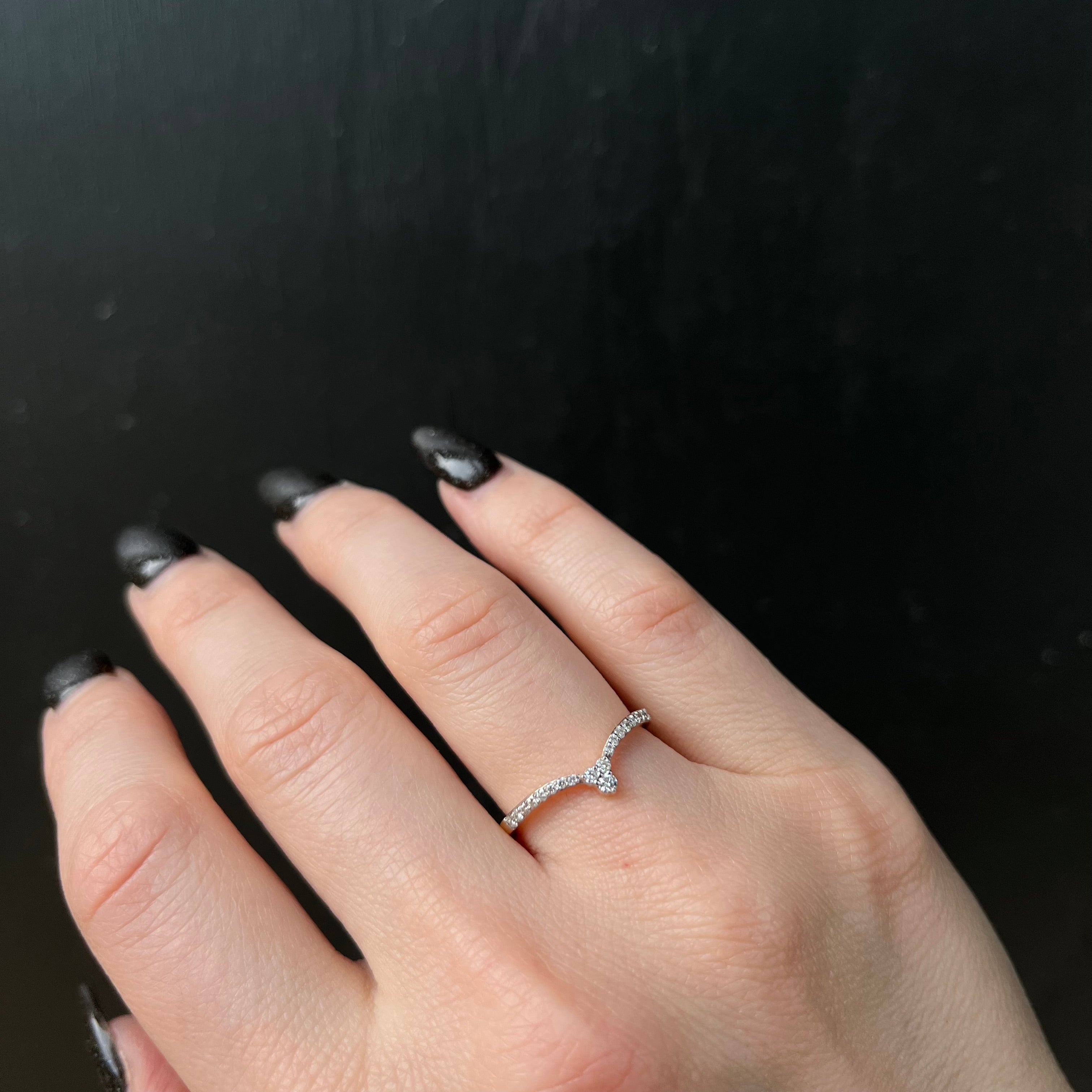 14K yellow gold, white gold, and diamond band with a curve that comes to a point. This lovely band features 0.20 carats of round brilliant cut diamonds that follow a gentle curve into a graceful point. This band could certainly be worn alone but would make the perfect companion to an engagement ring that would pair well with a curved band.