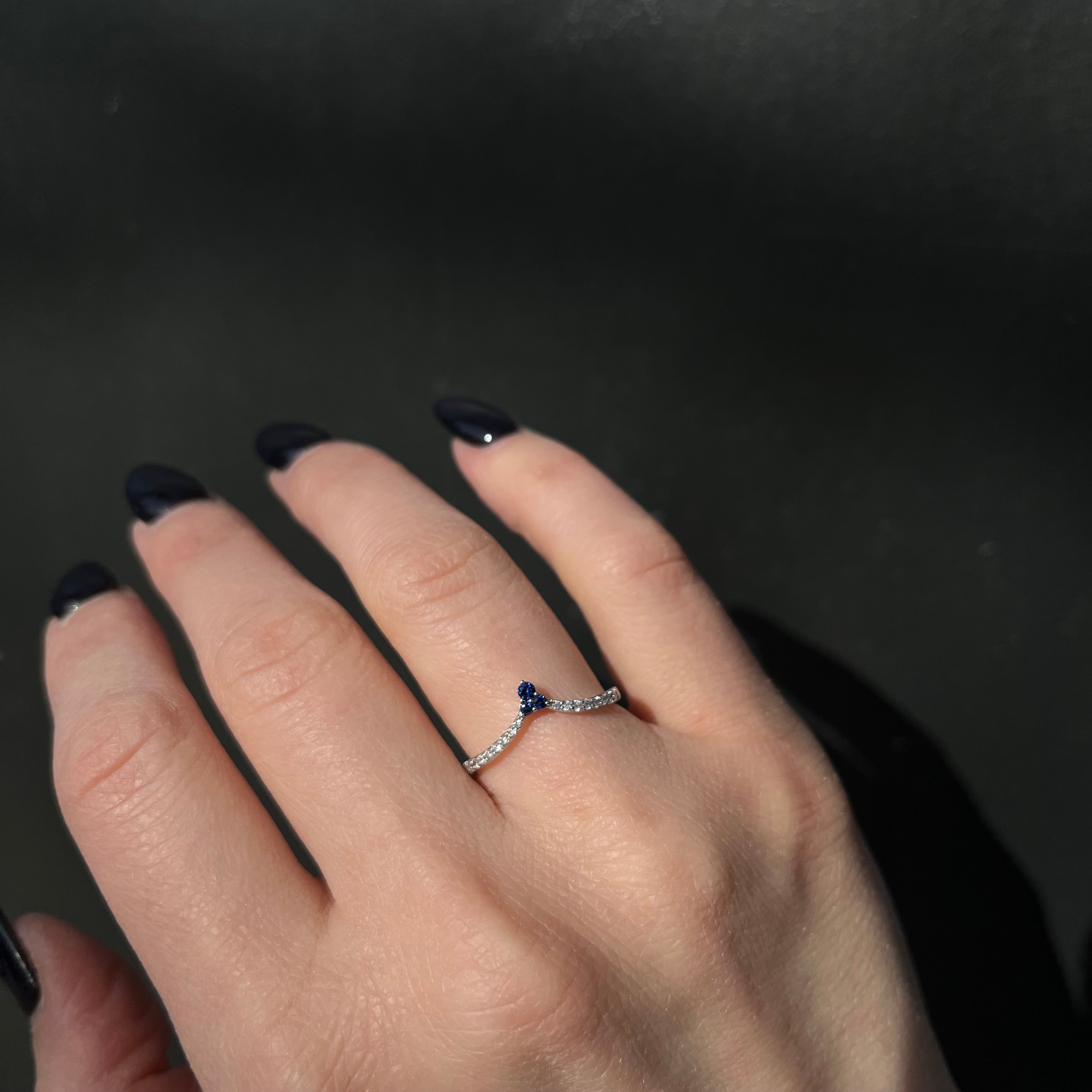 14k white gold, sapphire, and diamond band. This 14k white gold band effortlessly marries the classic allure of diamonds with the regal charm of vibrant blue sapphires, all artfully arranged in a lovely design with a distinctive pointed curve.