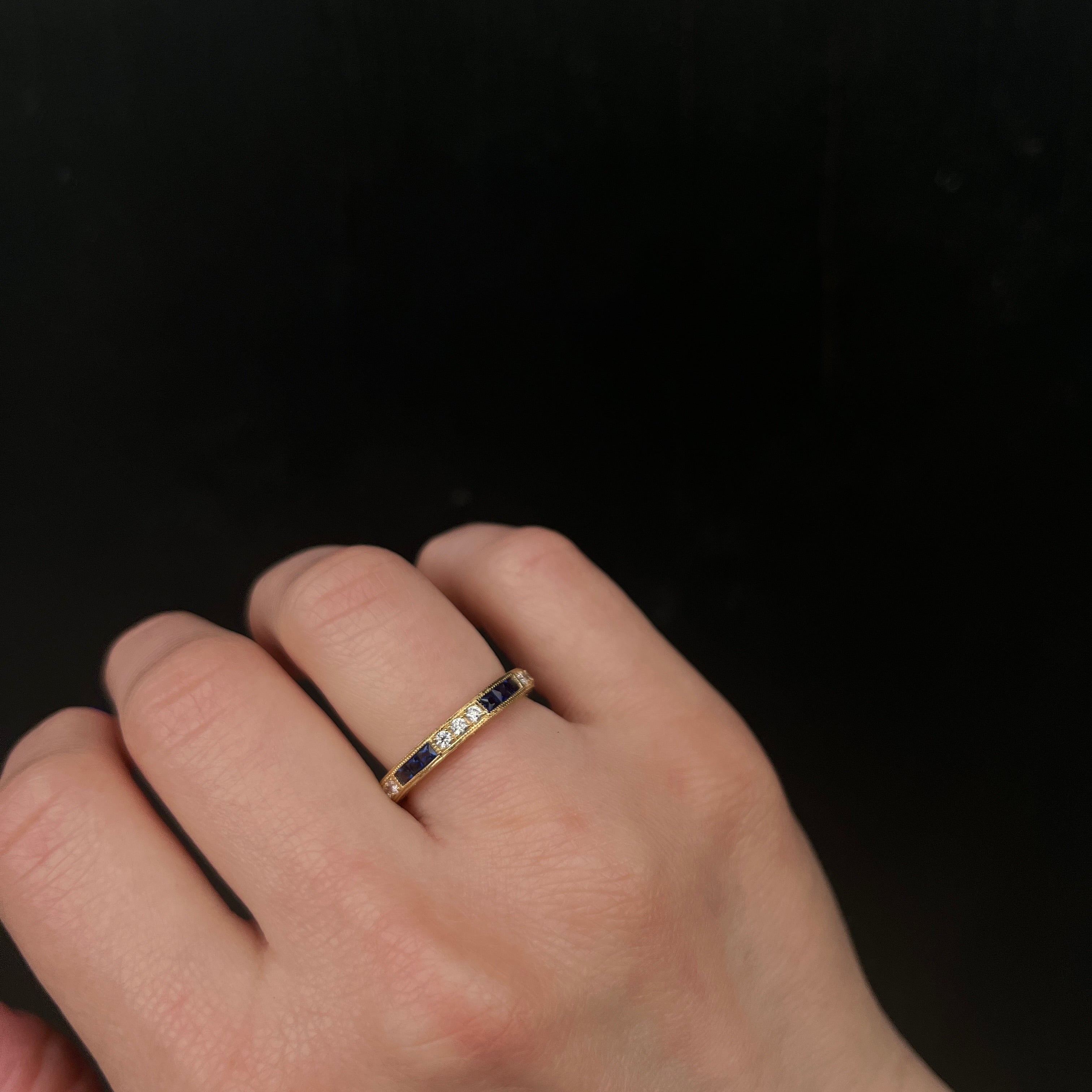 18K yellow gold, diamond, and sapphire ring. This captivating wedding band features alternating rows of three round brilliant cut diamonds and velvety blue French-cut sapphires, adorning three-quarters of the band's circumference. Together, they create a beautiful blend of symbolism and sparkle. Whether as a pair to your engagement ring or a symbol of your commitment, this band is a true treasure that celebrates your unique bond.