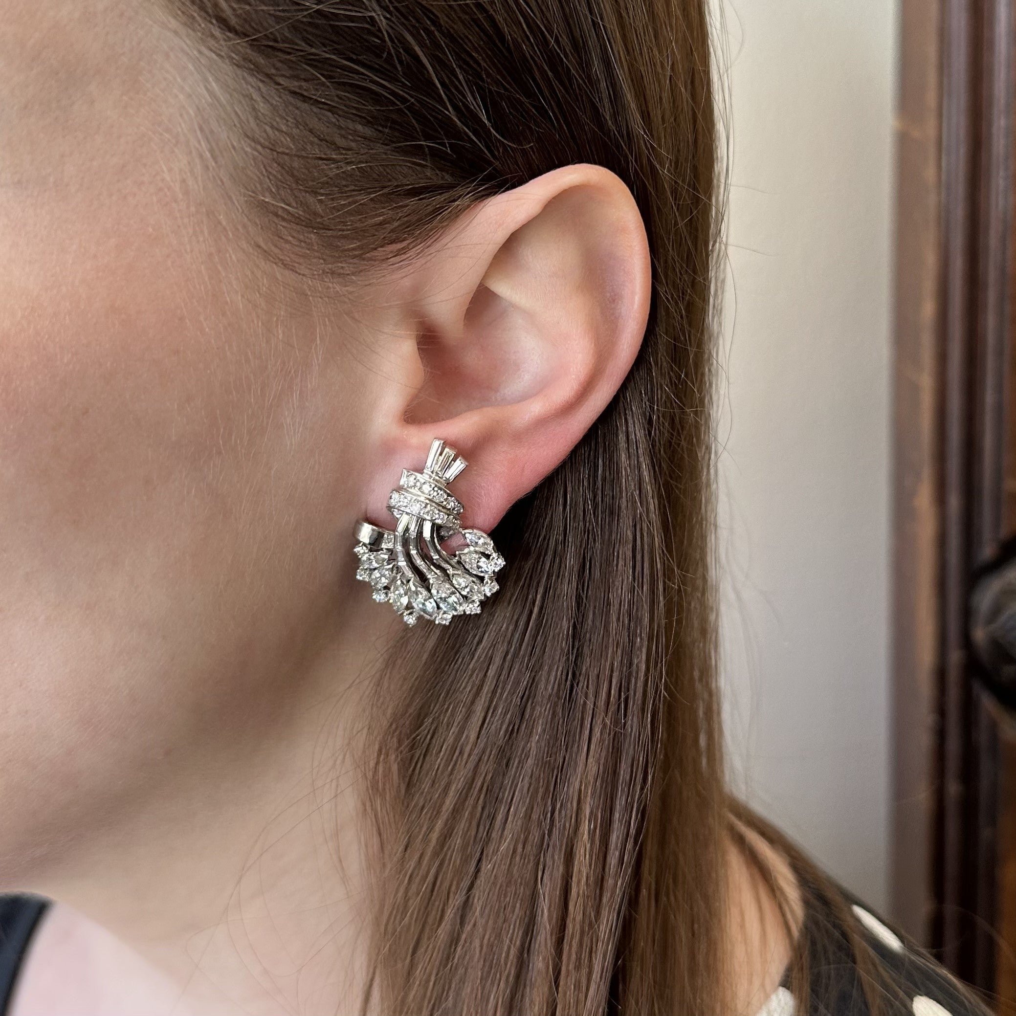 1950s 14k white gold and diamond earrings. These exquisite earrings showcase a beautiful fan design, carefully crafted to bring out the elegance of the wearer. Adorned with a dazzling array of diamonds, these earrings are the perfect accessory for any formal occasion, adding a touch of vintage glamour to any outfit. They make an unforgettable gift for someone special and will surely become a treasured piece in any jewelry collection.