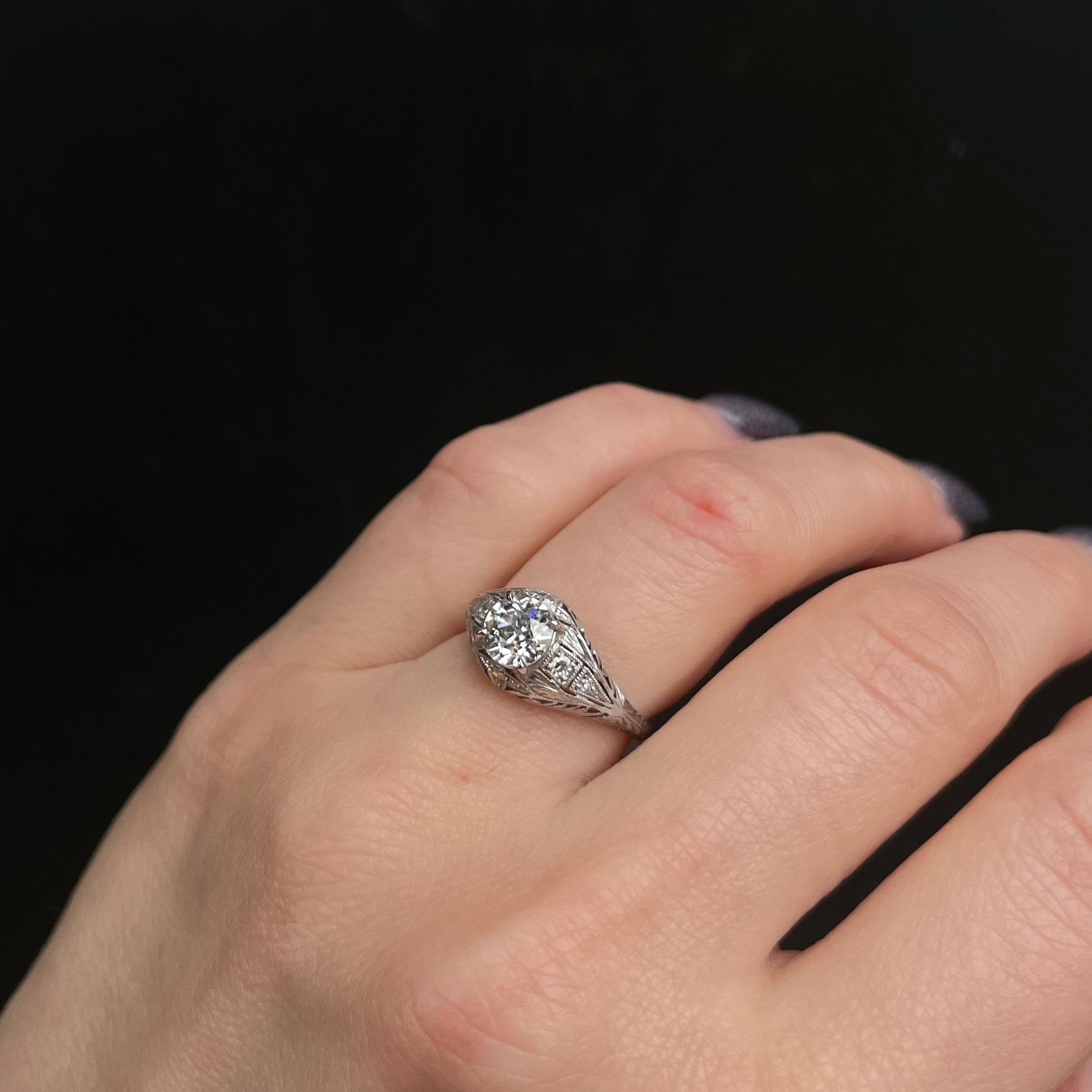 Art Deco platinum and diamond ring. Beautifully designed in platinum, this stunning Art Deco era diamond ring radiates with a 0.92 carat Old European cut diamond resting at the center. The prong-set center is surrounded by six single cut diamonds that perfectly grace the open filigree mounting with milgrain accents.