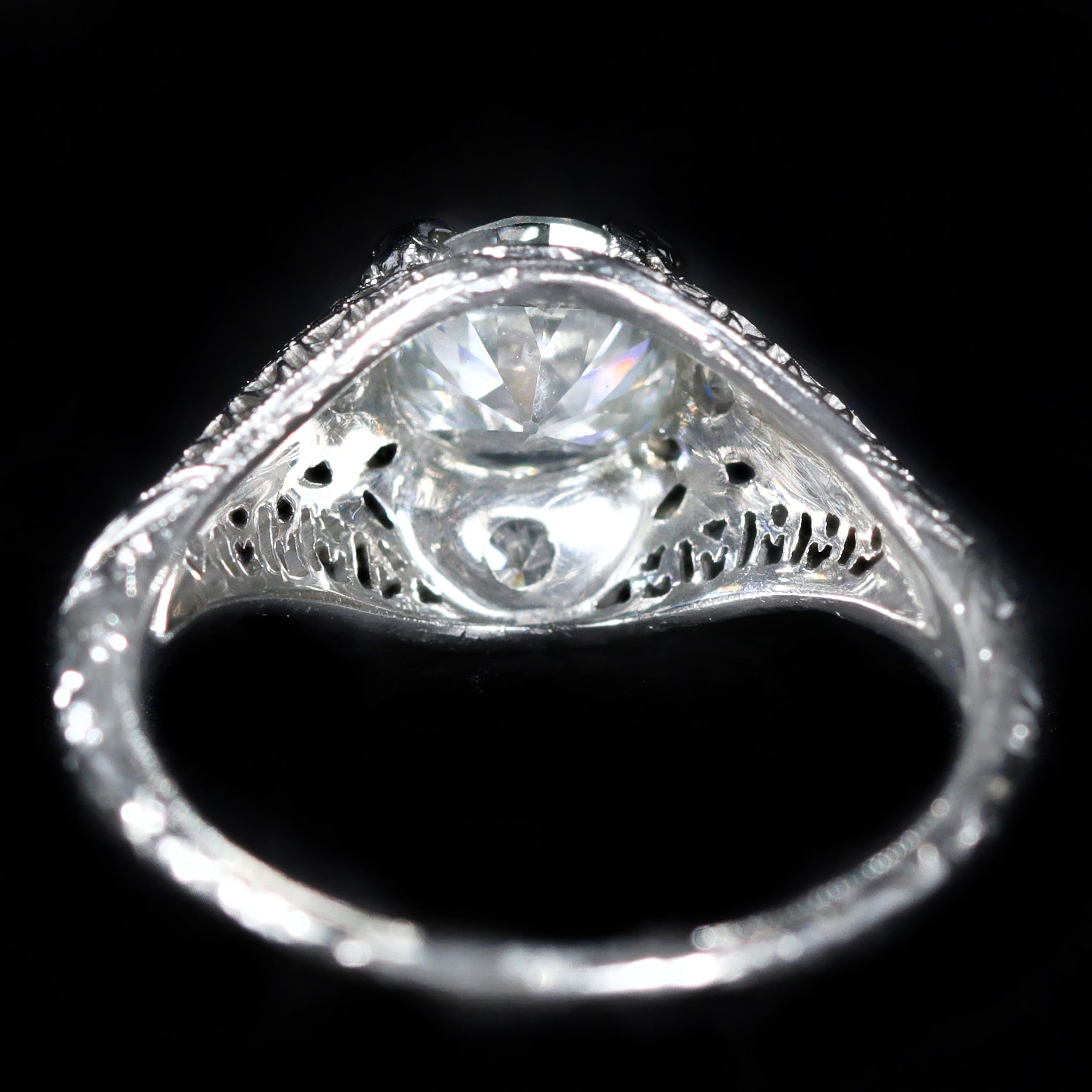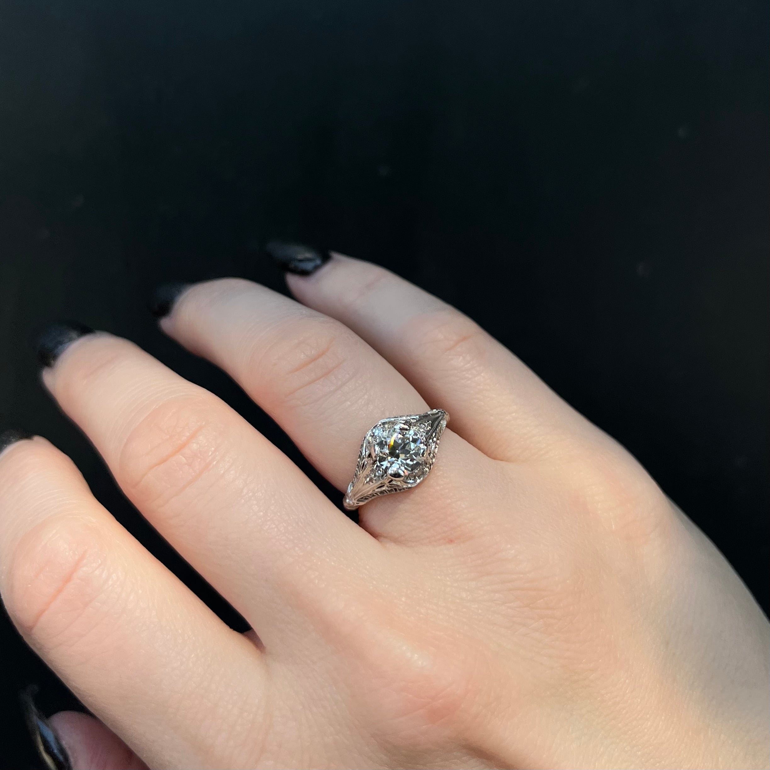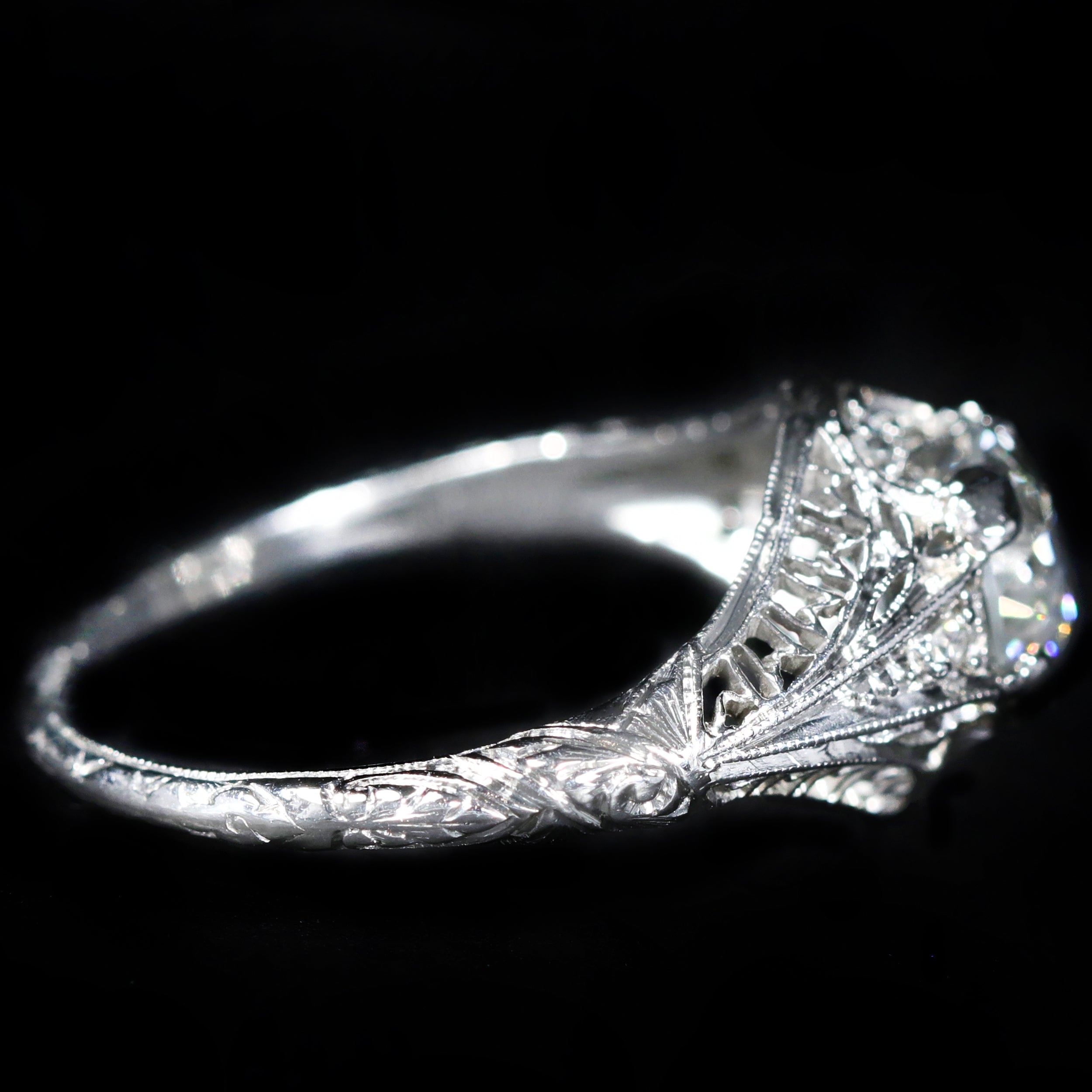 Art Deco platinum diamond ring. Crafted in gleaming platinum, this Art Deco engagement ring is crowned with a glittering Old European cut diamond, weighing approximately 1.10 carats. Gracing the elegant filigree mounting, the center stone is embellished all around with four twinkling single cut diamonds. Delicate milgraining decorates the beautiful wire work detail, accentuated with hand engraving down each side of the band.
