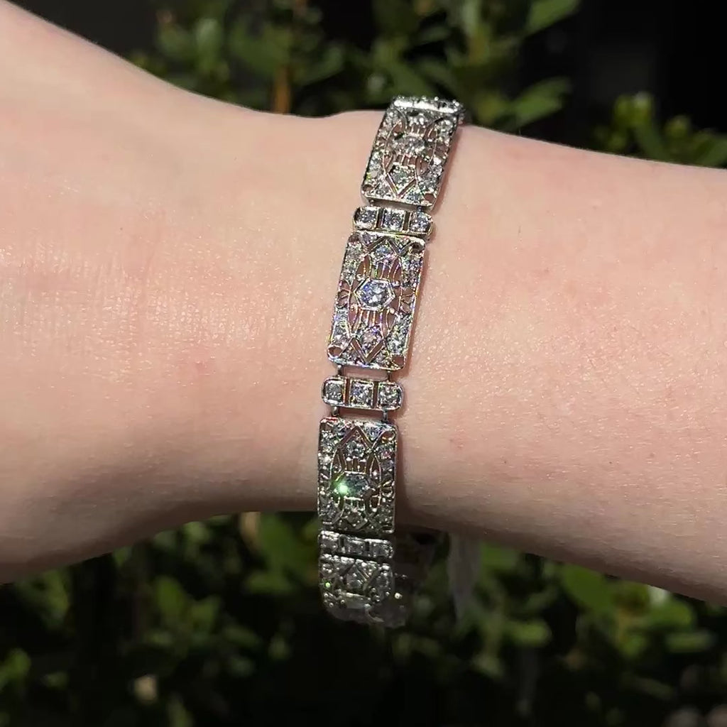 Art Deco, platinum, and diamond filigree bracelet. This stunning diamond confection perfectly embodies the glamour and sophistication of the Art Deco era. Encrusted with 144 diamonds, the artfully rendered bracelet beautifully incorporates the negative space into the overall design. Delicate milgraining and lacy filigree provides the finishing touch to this chic and feminine jewel. Fabricated in gleaming platinum, the bracelet measures 7 inches in length and fastens with a hidden safety clasp for added security.