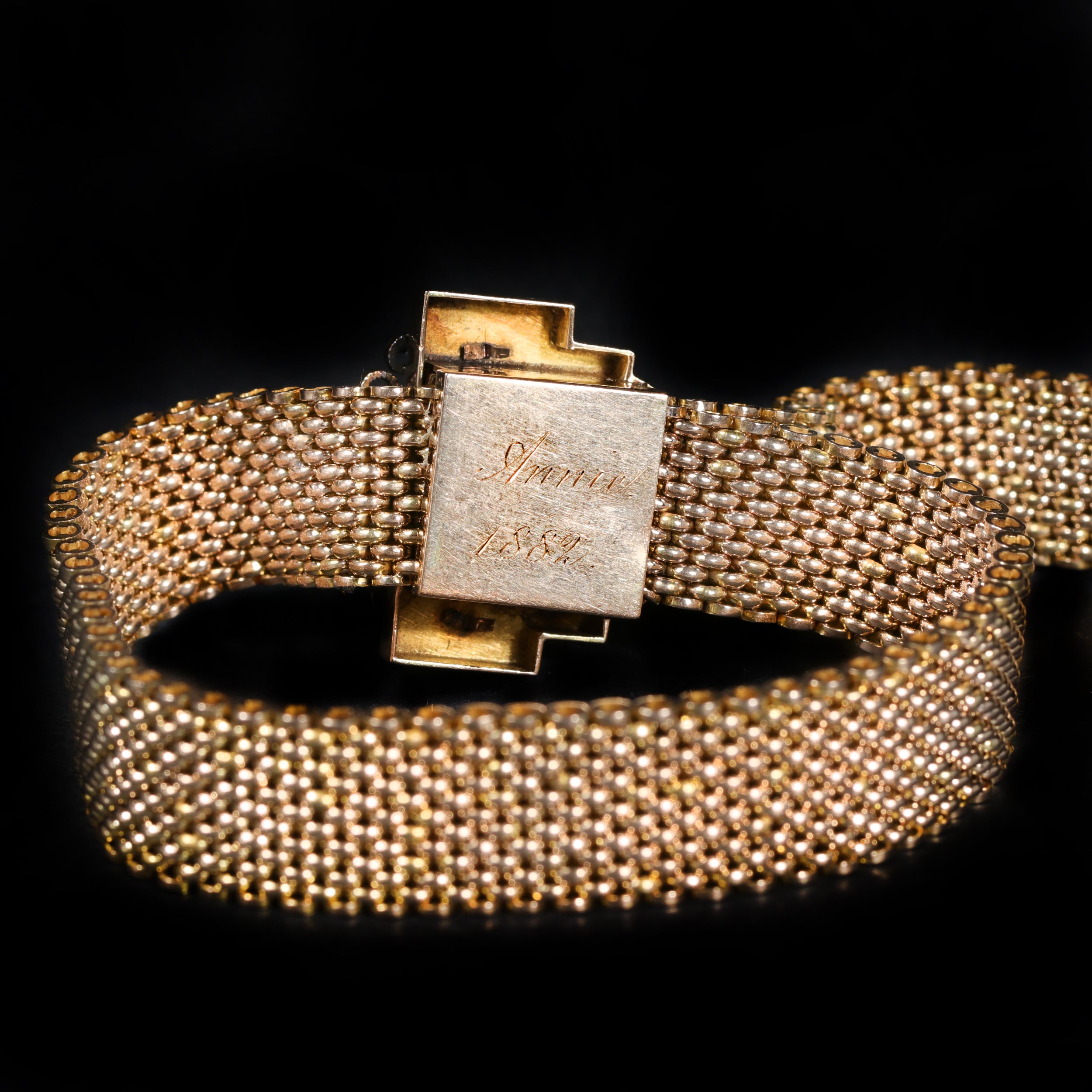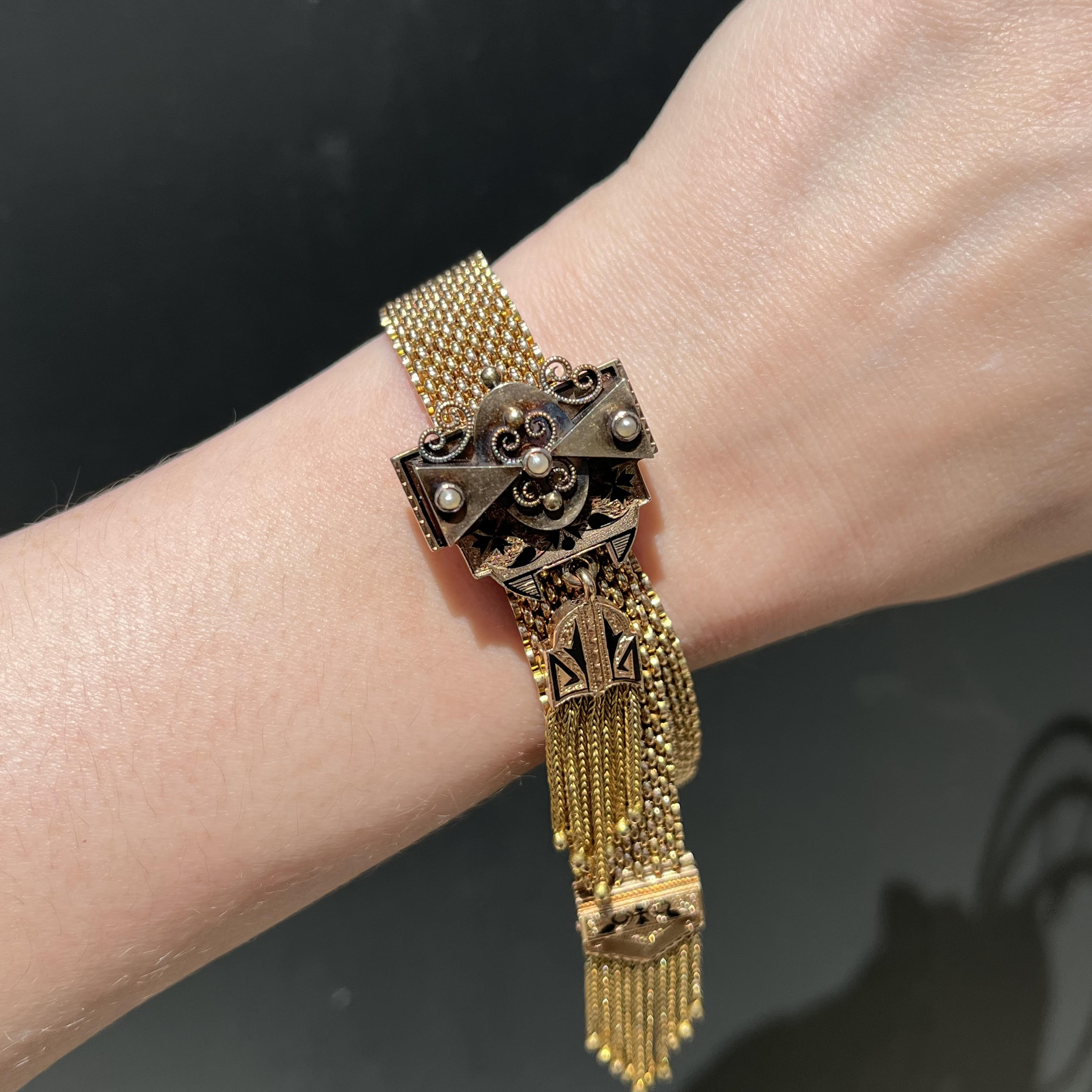 Victorian 14k yellow gold bracelet. This classic Victorian bracelet features intricate weaving of yellow gold, adorned with lustrous pearls and striking black enamel accents. The beautiful mesh links glide through the intricately designed plaque, adjustable to 8 inches, while beautiful tassels swing and sway with every movement. The bracelet is hand-engraved on the reverse with "Annie 1882."