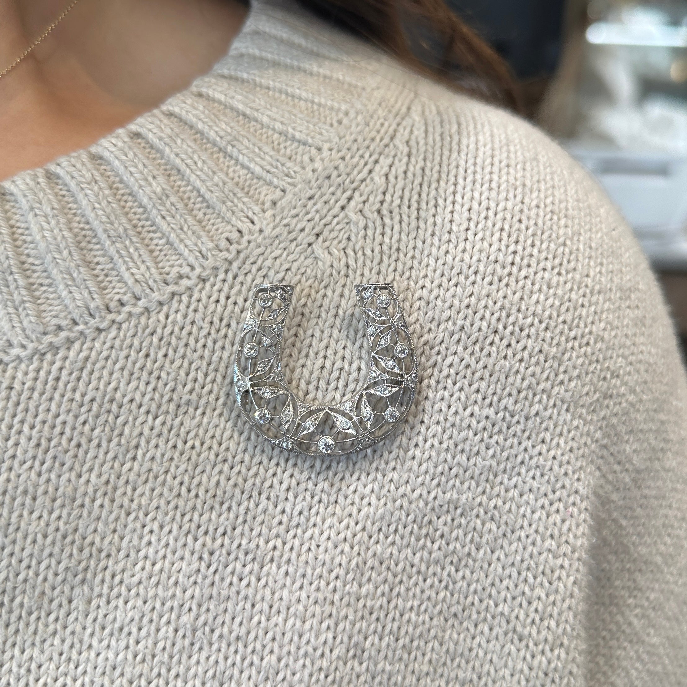 Platinum/14k white gold and diamond brooch. This exquisite Art Deco brooch takes the form of an airy horseshoe. The platinum brooch showcases a beautiful filigree design with intricate large cutouts, creating a delicate and open aesthetic. Sparkling diamonds adorn the entire piece, adding brilliance and sophistication. The brooch measures approximately 1.25 inches in length and width and fastens with a 14k white gold pin.