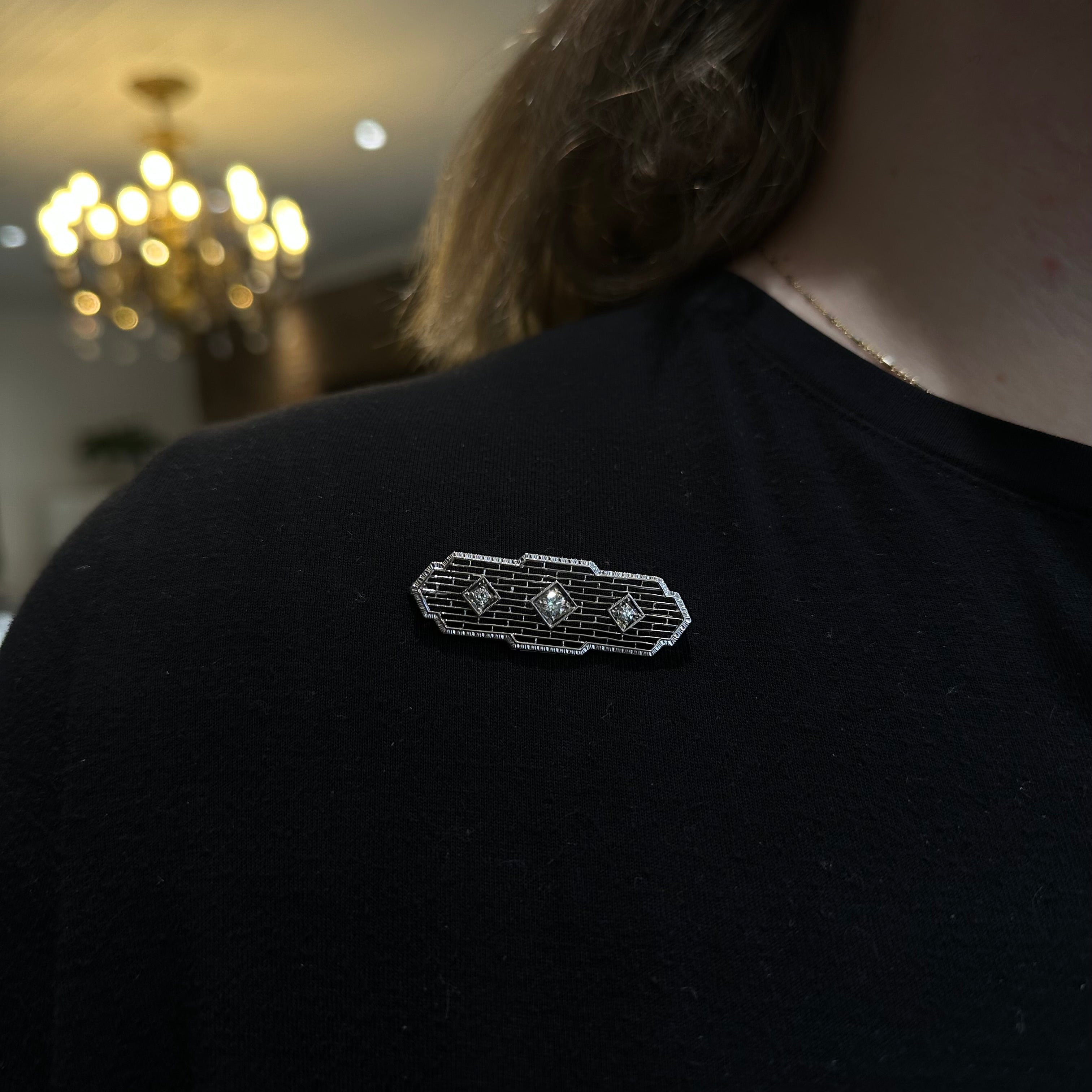 Estate 10k white gold and diamond brooch. Brought to you in bright 10k white gold, this lovely estate brooch features three round brilliant cut diamonds, set amongst a beautiful openwork design. The brooch is trimmed in a border of hand-engraved detail, highlighting the striking geometric negative space design.