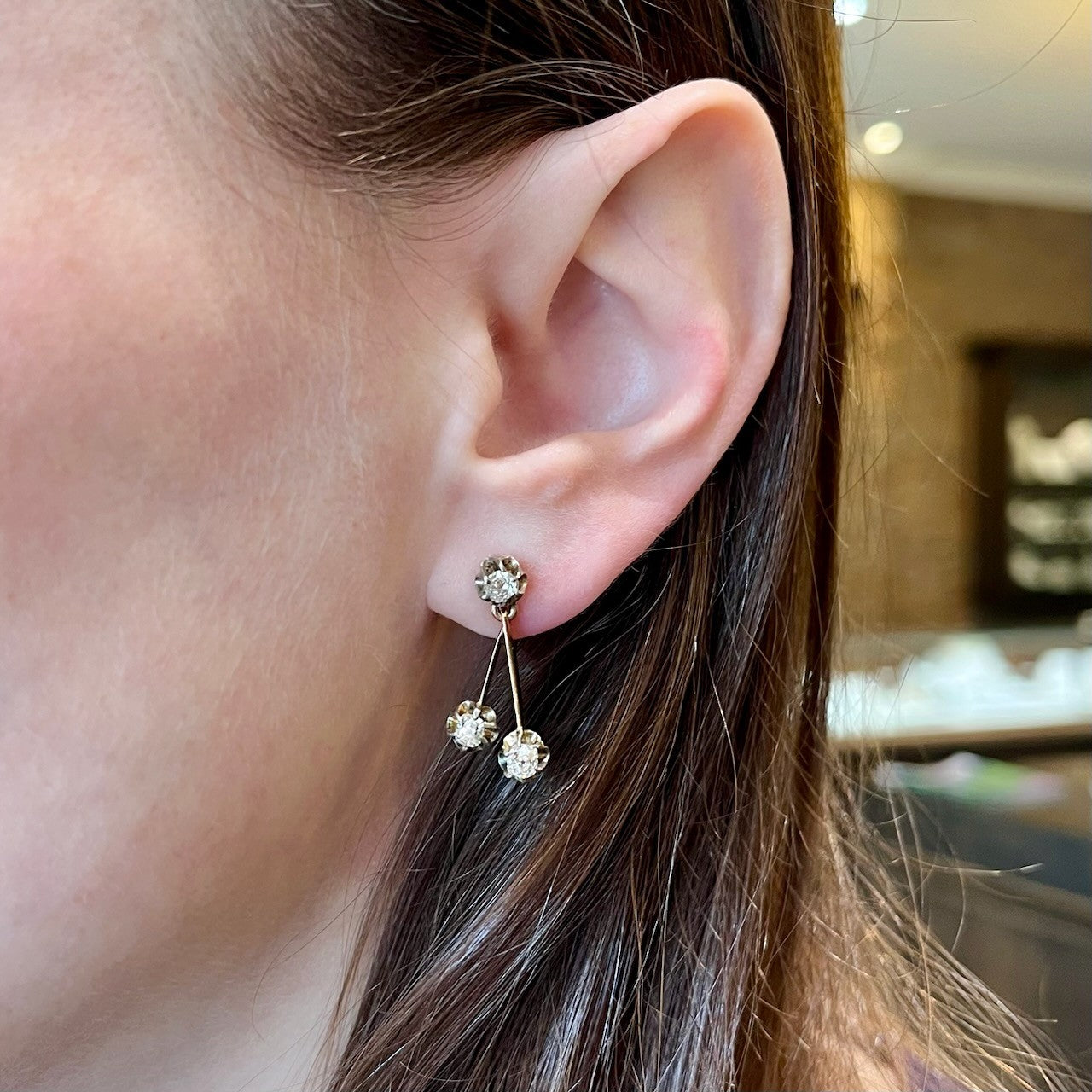 Victorian 14K yellow gold diamond earrings. Bring a little Victorian charm to your jewelry box with these gorgeous diamond earrings! Each earring showcases a captivating trio of Old Mine cut diamonds, totaling approximately 1.20 carats, nestled in delicate buttercup-style settings. Their graceful drop design allows them to swing and sway effortlessly, catching the light and shimmering with every movement. The earrings fasten with a clip on screw back and can be converted to posts upon request.
