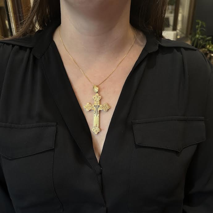 Victorian 14k yellow gold cross pendant. Beyond its captivating appearance, this Victorian pendant is a relic of bygone era, rich in history and symbolism. The cross, including the bail, measures approximately 3 inches in length and 1 5/8" inches wide. The cross is elaborately adorned with flowing scroll work, granulation, and bead work so distinctive of the Etruscan Revival period.