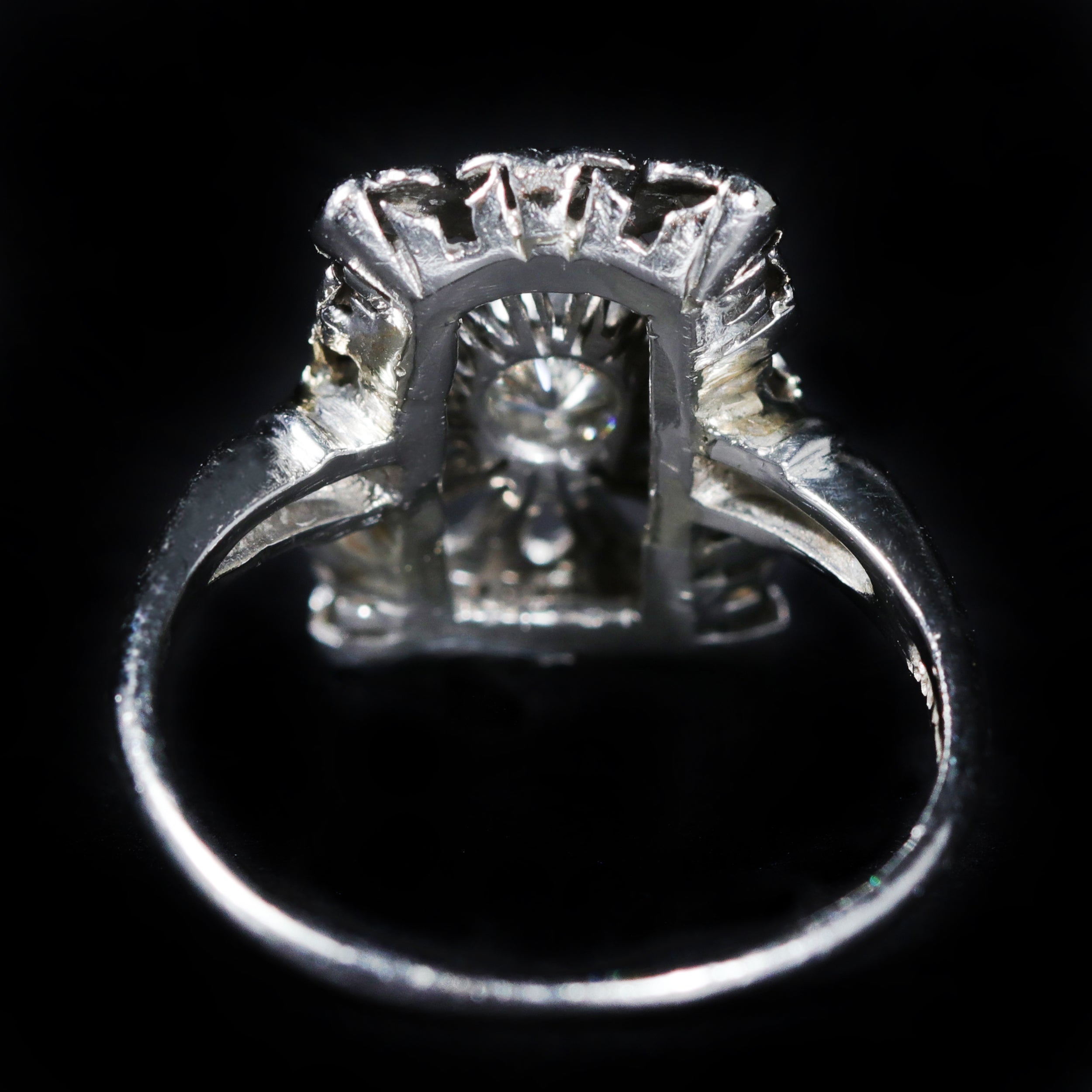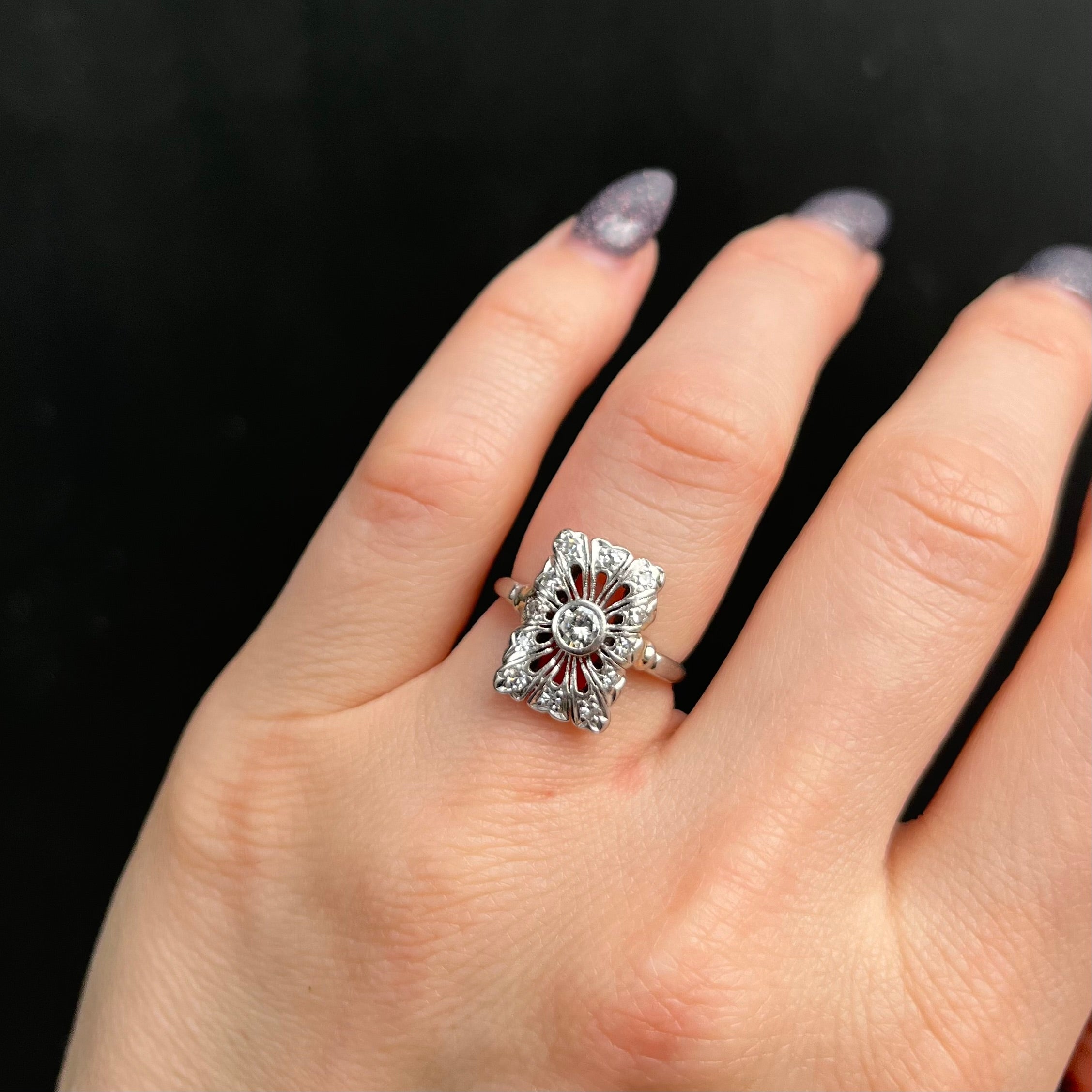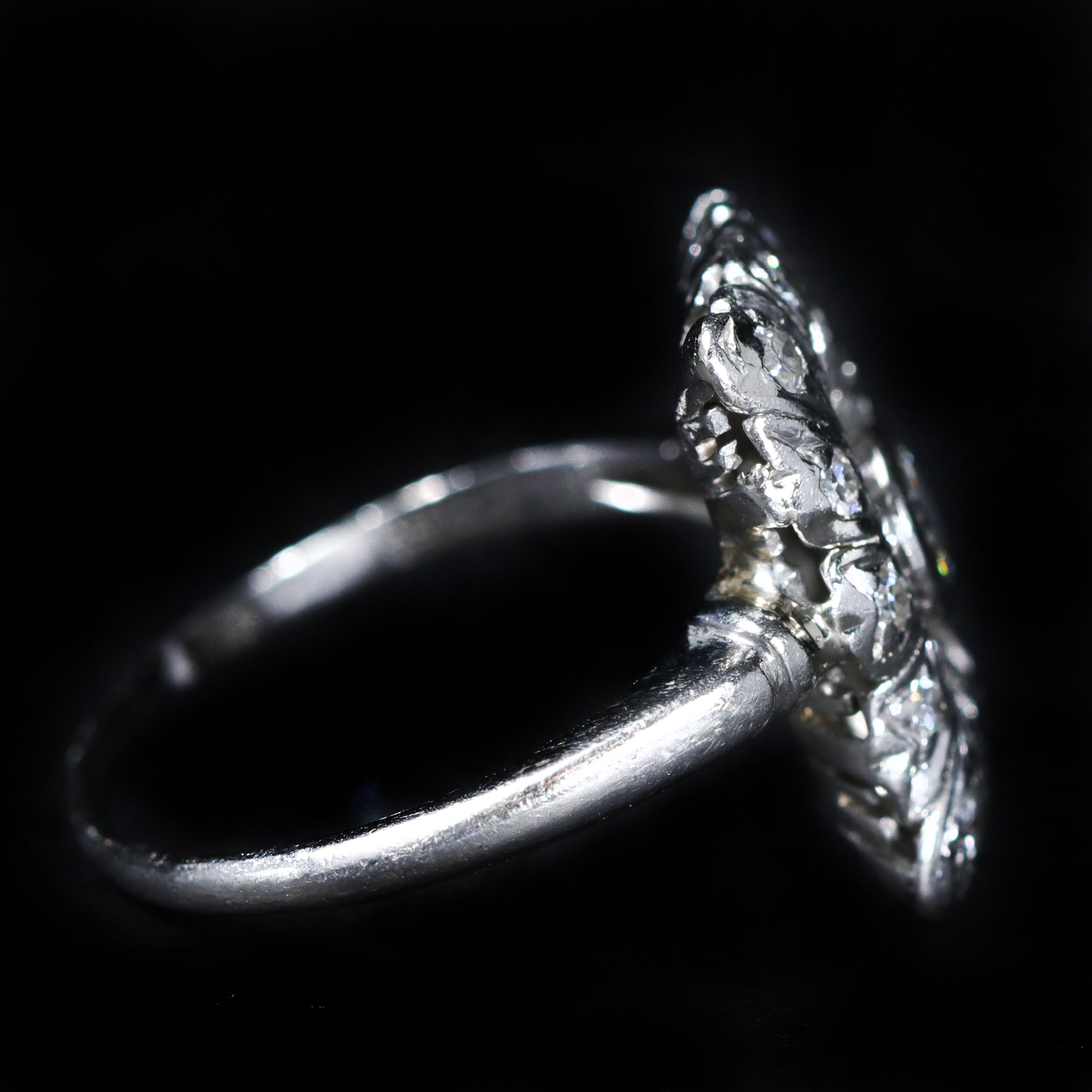 Art Deco platinum and diamond ring. This exquisite Art Deco ring is truly captivating with its distinctive shape and design. At its center gleams a sparkling transitional cut diamond, encircled by smaller diamonds arranged in a petal motif that fans out in a rectangular pattern. Each petal is intricately adorned with open filigree work, adding a vintage touch and enhancing the ring's overall elegance with its delicate detailing.