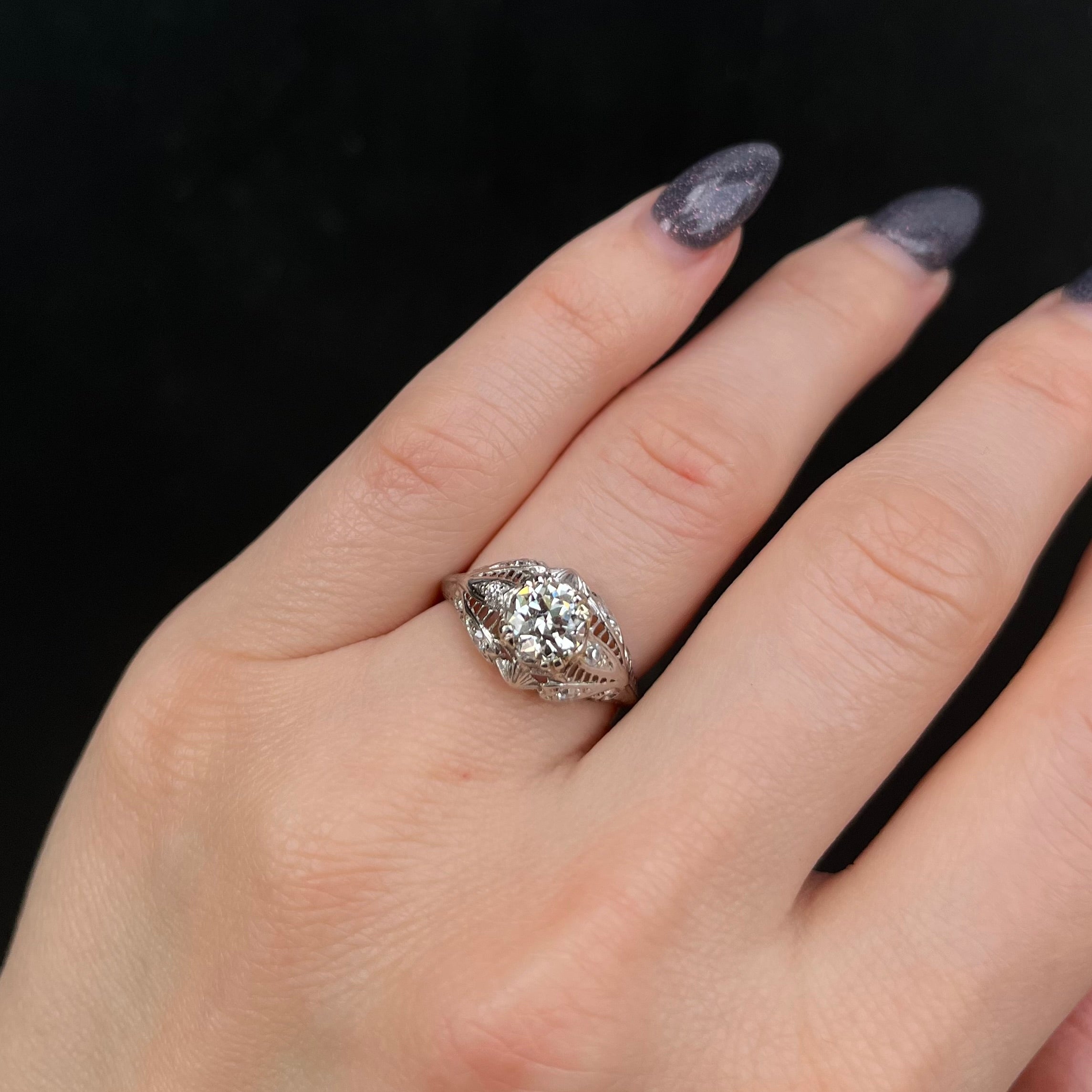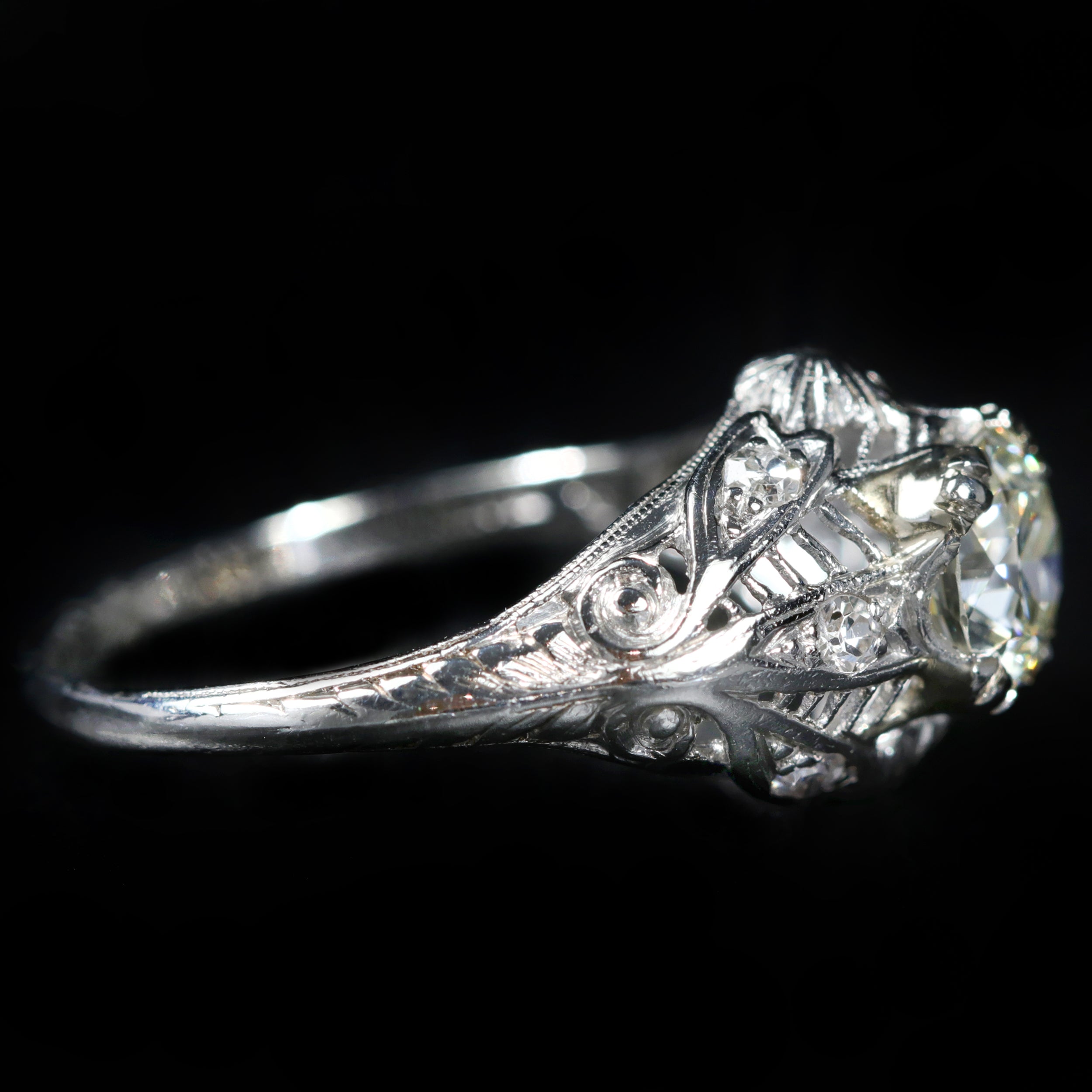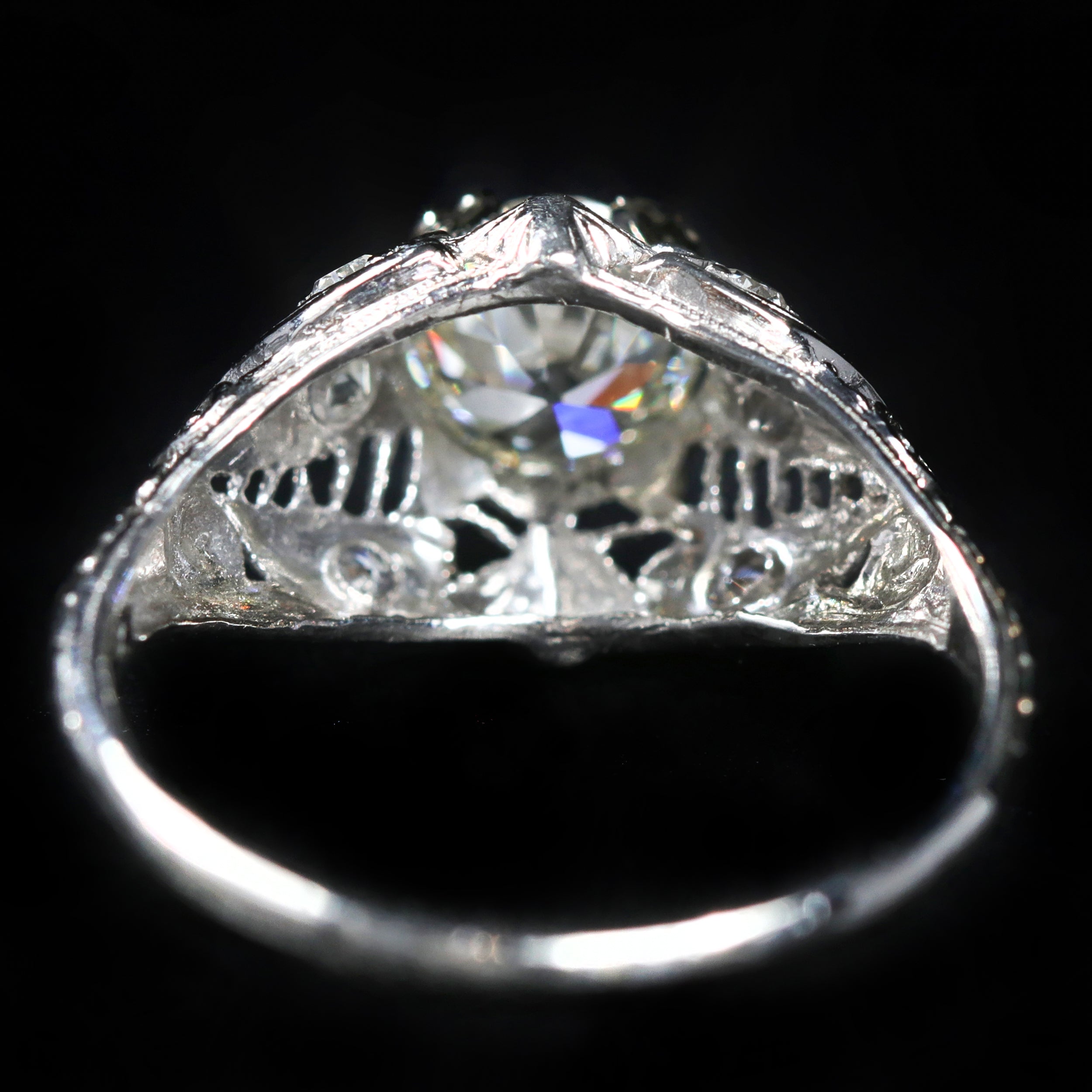 Art Deco platinum and diamond ring. This distinctive and stunning Art Deco jewel radiates front and center with a dazzling Old European cut diamond, bearing a GIA Diamond report. The scintillating stone is elegantly embellished all around with glittering diamond set ribbons further accentuated with decorative piercing, delicate milgraining, and exquisite hand engraving.