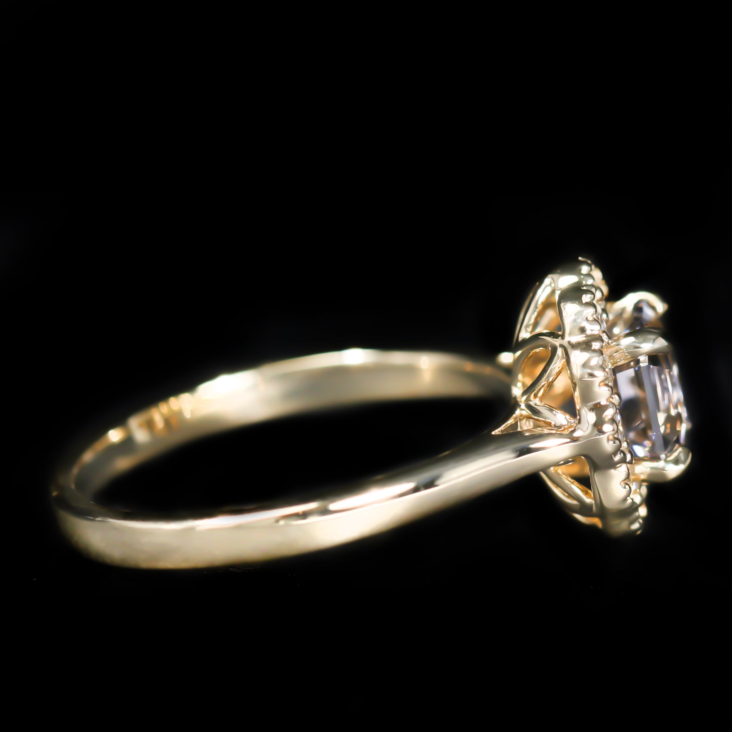 14k yellow gold, spinel, and diamond ring. This exquisite 14k yellow gold ring features an asscher cut spinel, sparkling with beautiful muted lavender hues. Set in four prongs, the spinel is framed by a scalloped diamond halo, further enhanced by delicate milgrain borders that lend a vintage-inspired feel to the design.