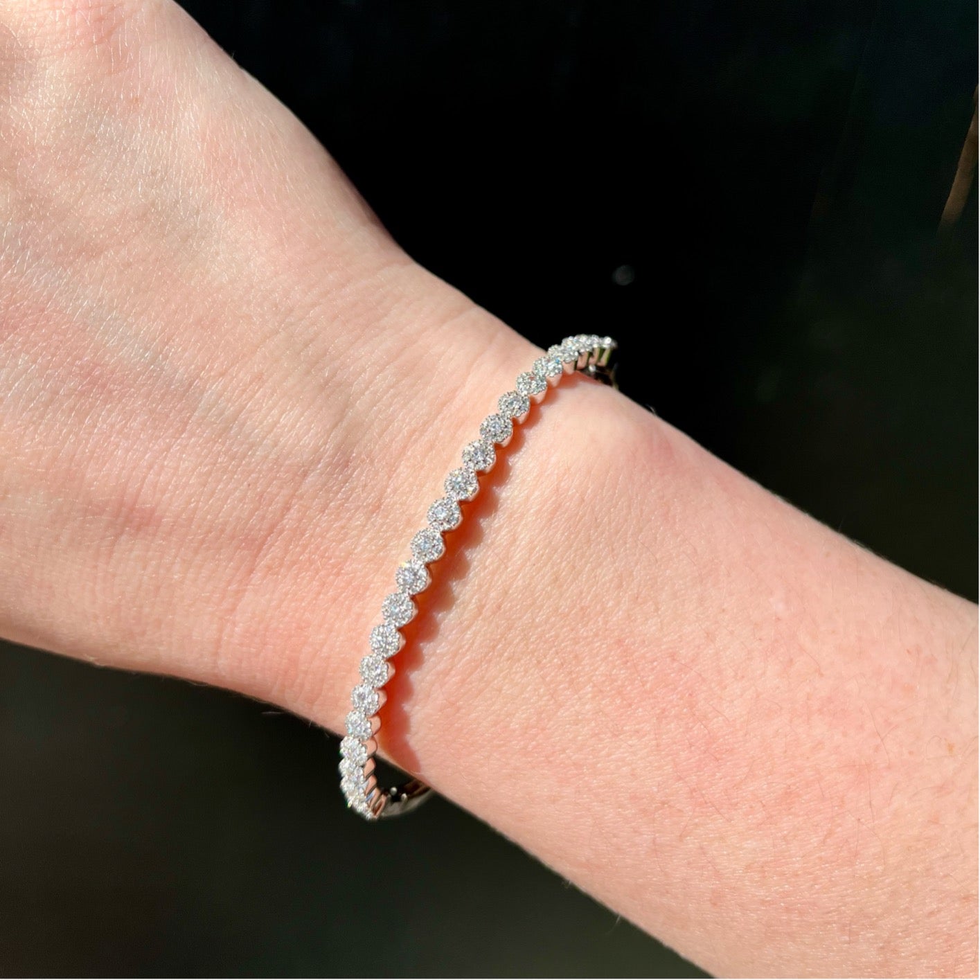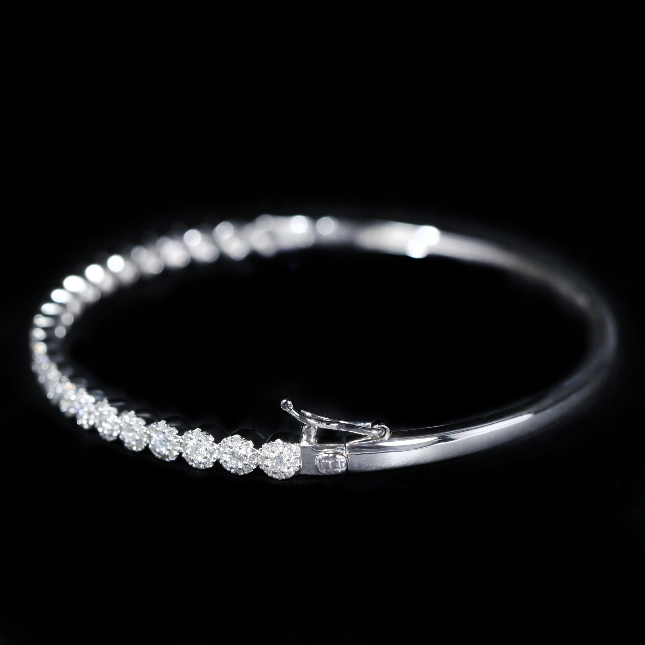 14k white gold and diamond bangle bracelet. Over 200 round brilliant cut diamonds come together to create this classic diamond bangle, featuring clusters of brilliant diamonds that adorn the top half of the piece. The bangle fastens with a clasp and safety latch, a comfortable fit for a 7 inch wrist.