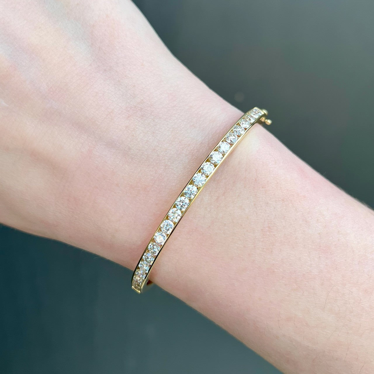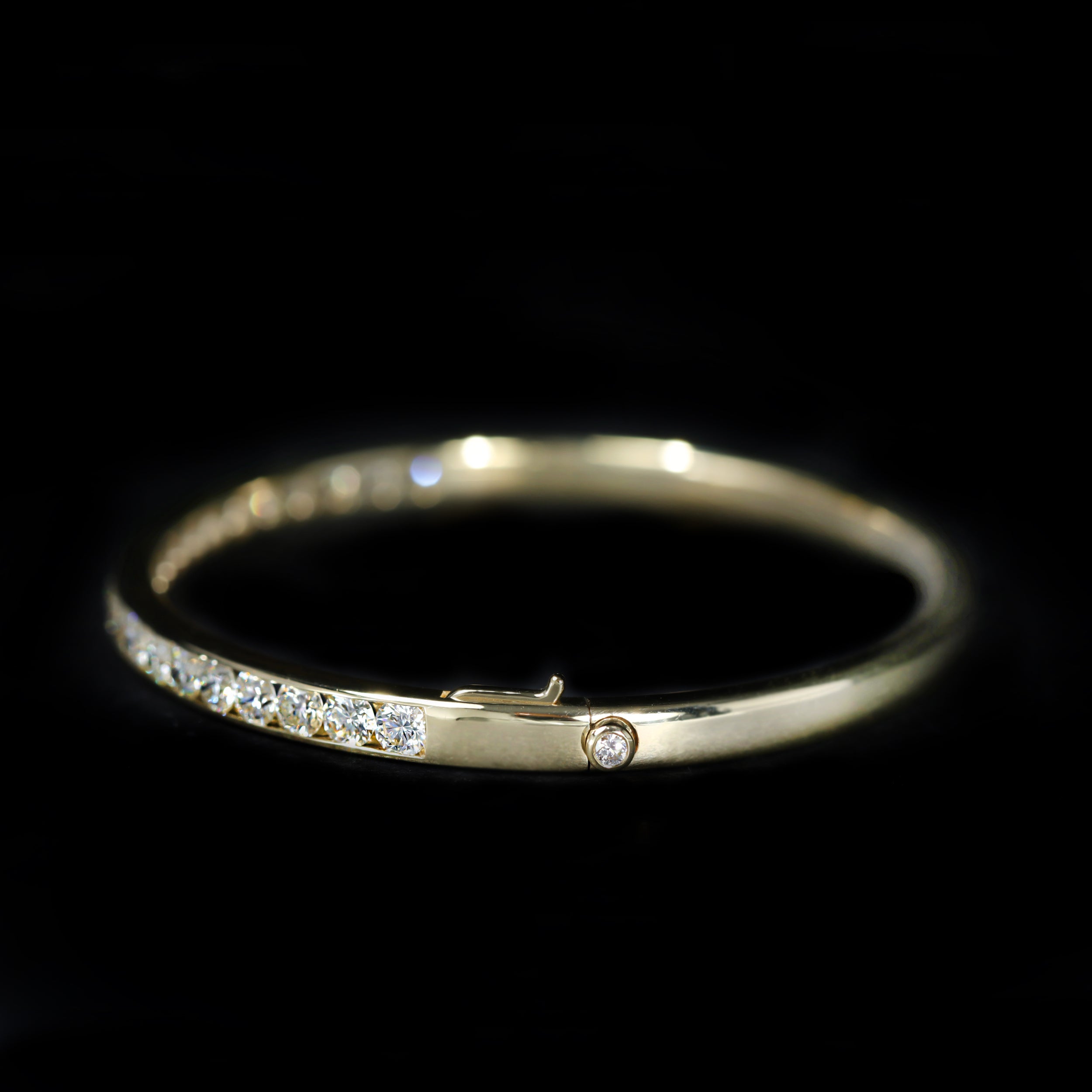 18K yellow gold and diamond bracelet. This elegant hinged bangle bracelet features approximately 2.86 carats total weight in round brilliant cut diamonds. Twenty-two sparkling diamonds are seamlessly channel set across the top half of the bracelet, offering a continuous line of shimmering brilliance. A bezel-set diamond accents the classic tongue clasp, which secures with a safety latch for added peach of mind. The bracelet comfortable fits a 7-inch wrist. Classic, refined, and easy to wear—this piece is the perfect blend of luxury and timeless design.