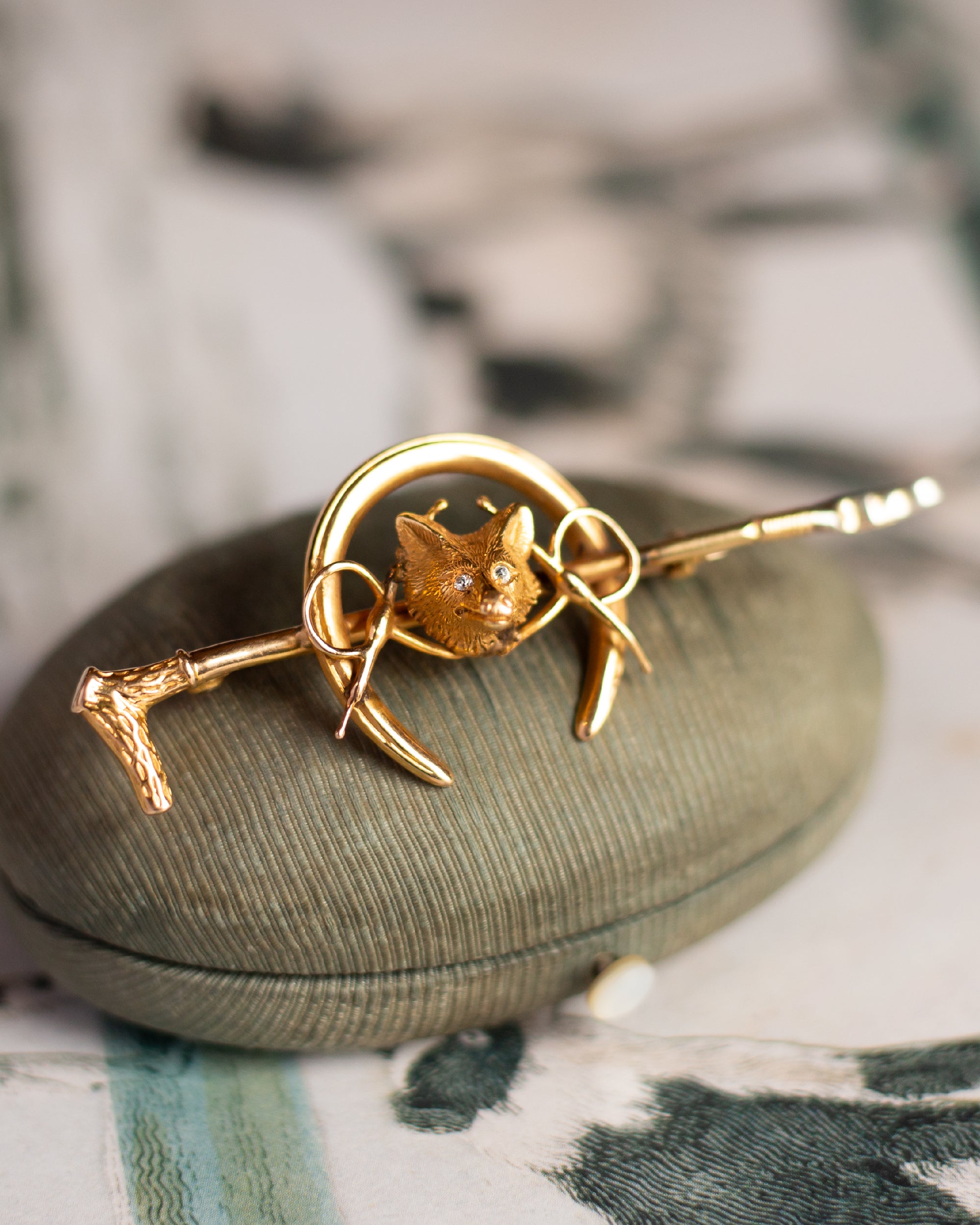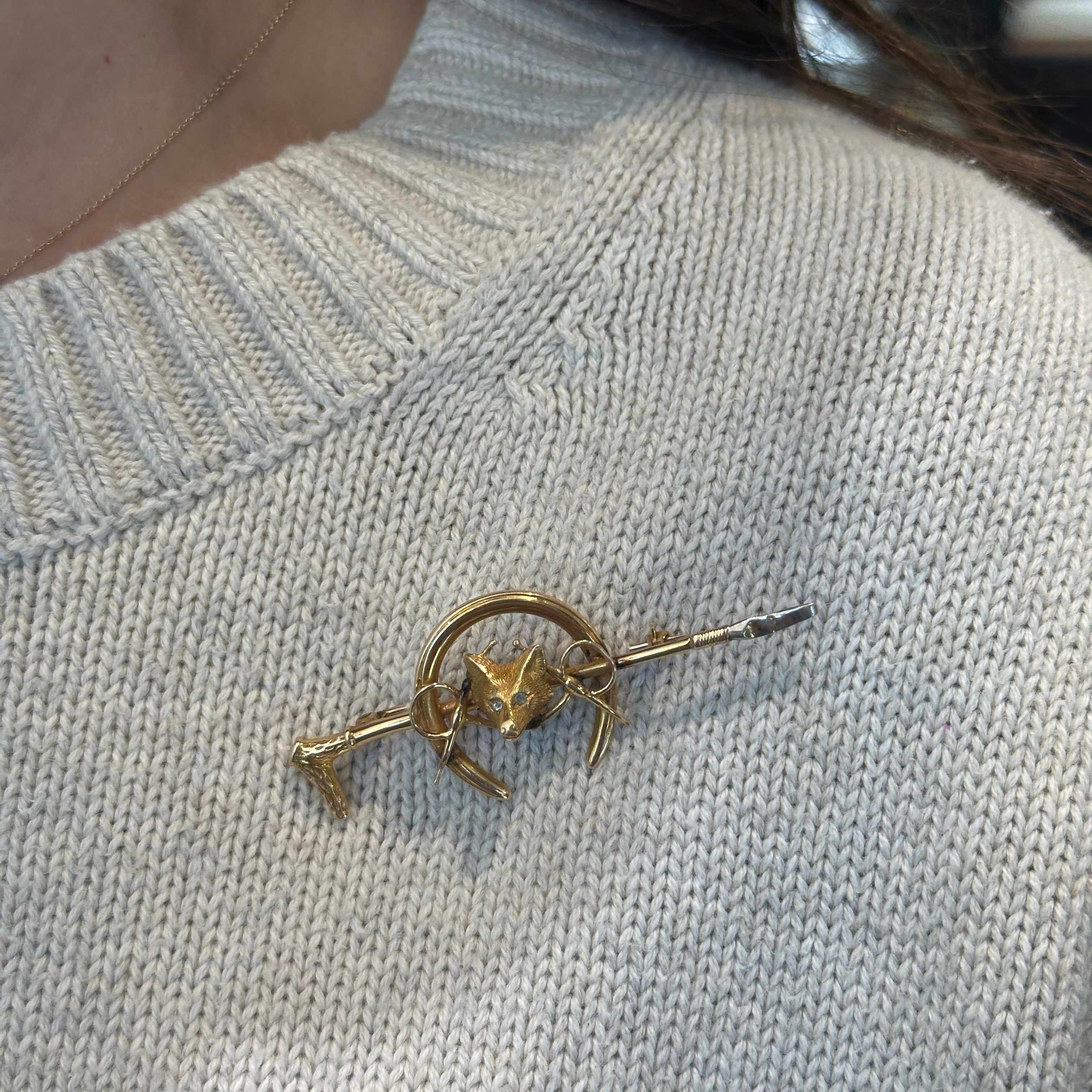 Estate 14k two-tone gold and diamond stock pin. This beautifully crafted piece captures the essence of equestrian tradition and style. The unique stock pin features a combination of iconic hunt motifs, including a finely detailed hunt whip, horseshoe, snaffle bit, and fox head, each symbolizing elements of the hunt and equestrian world.