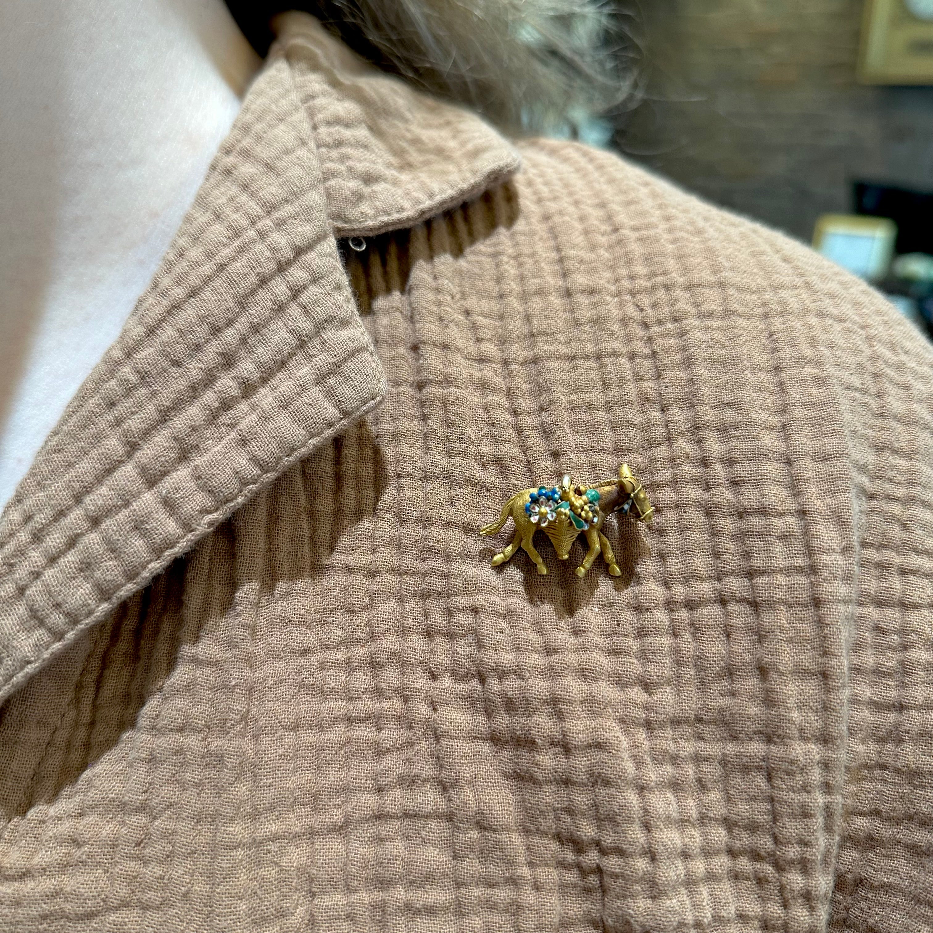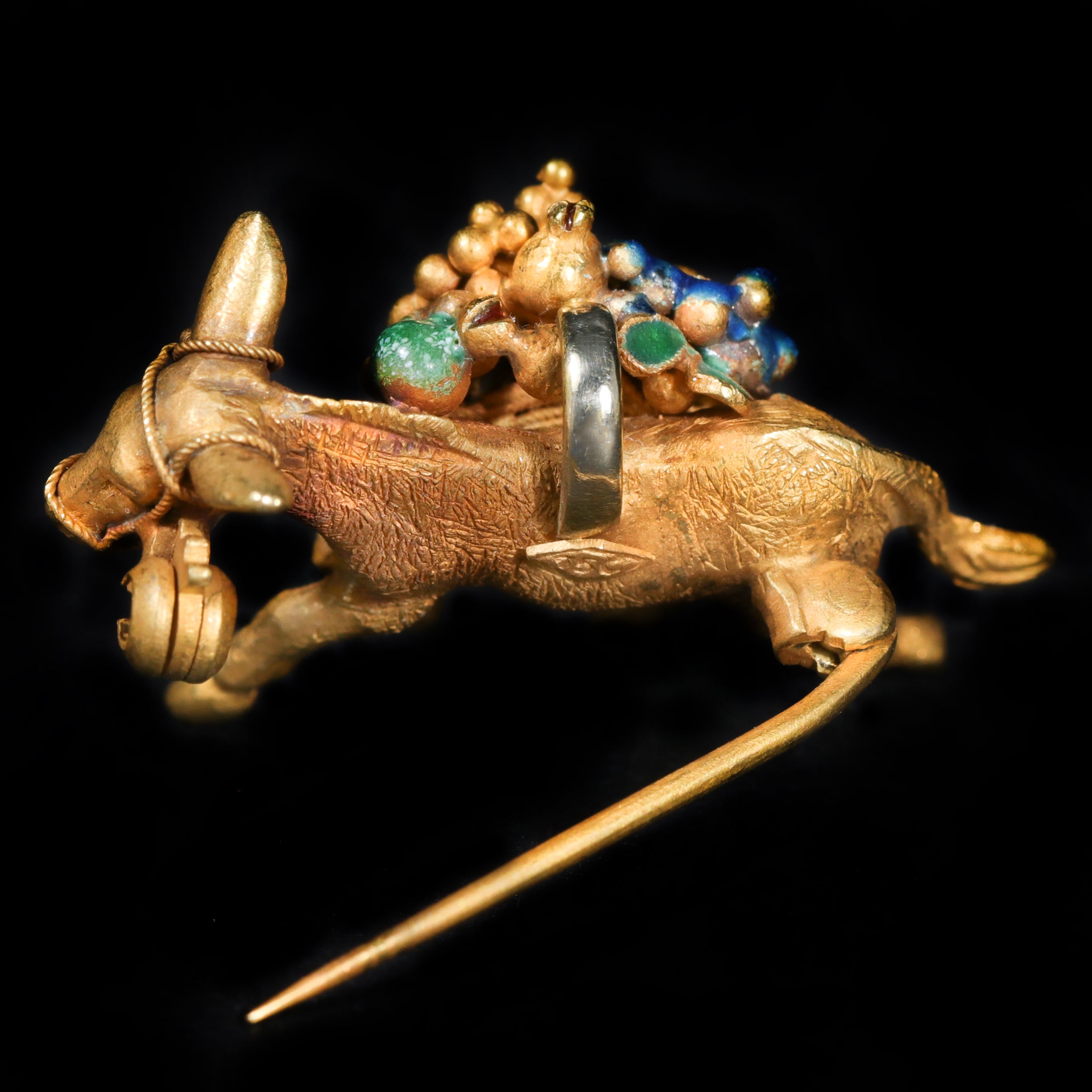 Estate 18K yellow gold donkey and enamel brooch. A charming gem that will surely capture the heart of any animal lover! Meticulously crafted in rich 18K yellow gold, this enchanting brooch depicts a lively donkey in motion, with a finely detailed mane, tail, and coat that bring this gentle creature to life. The donkey's basket is a vibrant explosion of colorful enamel flowers, each painted with bright, cheerful hues that add a whimsical touch. The bridle and basket are adorned with intricate gold wirework, twisted to resemble delicate rope reflecting the artist's exceptional craftsmanship and attention to detail.