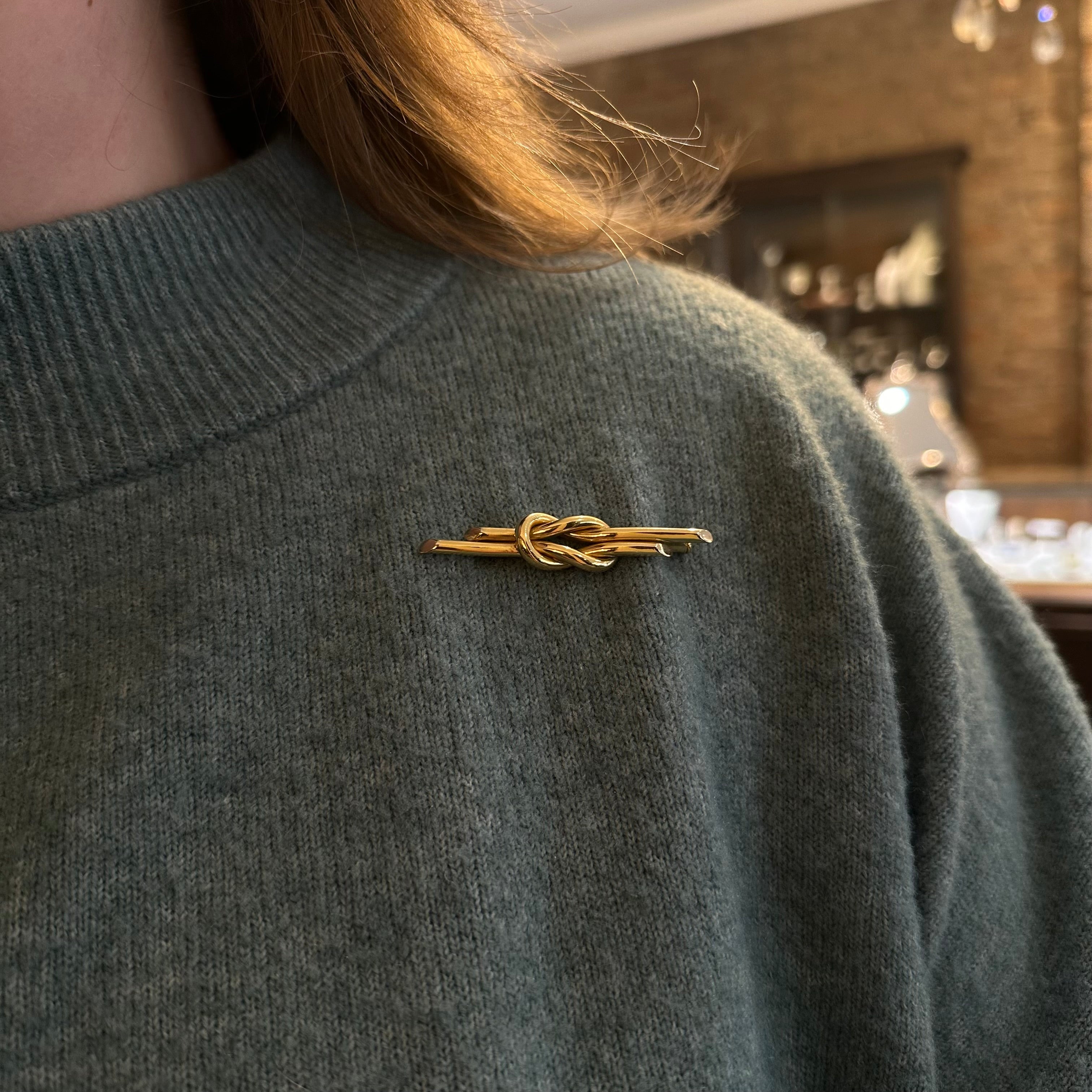 Estate 18k yellow gold brooch. This fabulous pin depicts a 3-dimensional knot made in warm 18k yellow gold. On the back side, the pin fastens with a simple hinged pin with locking catch. This timeless treasure would look stunning worn day or night!