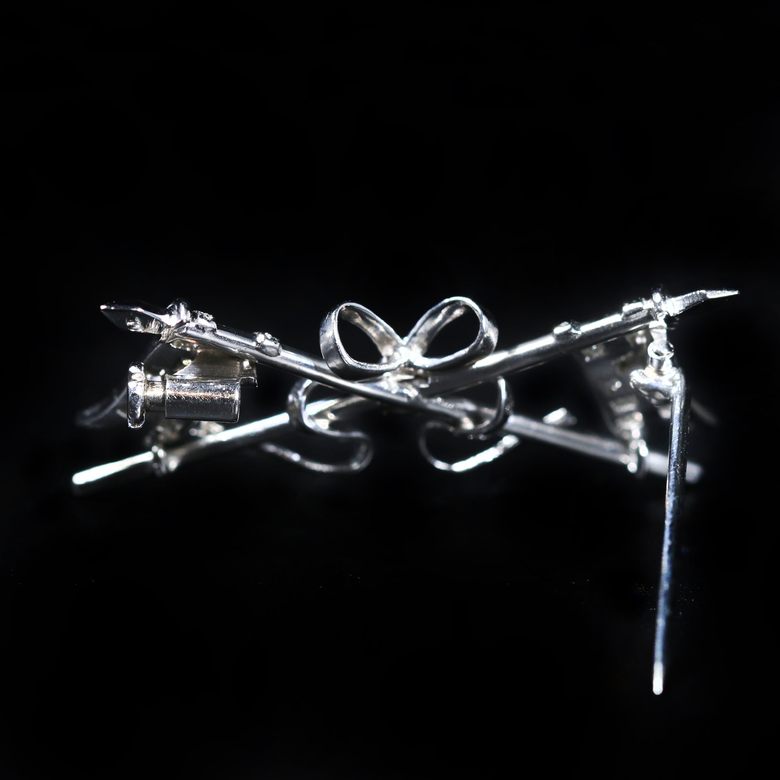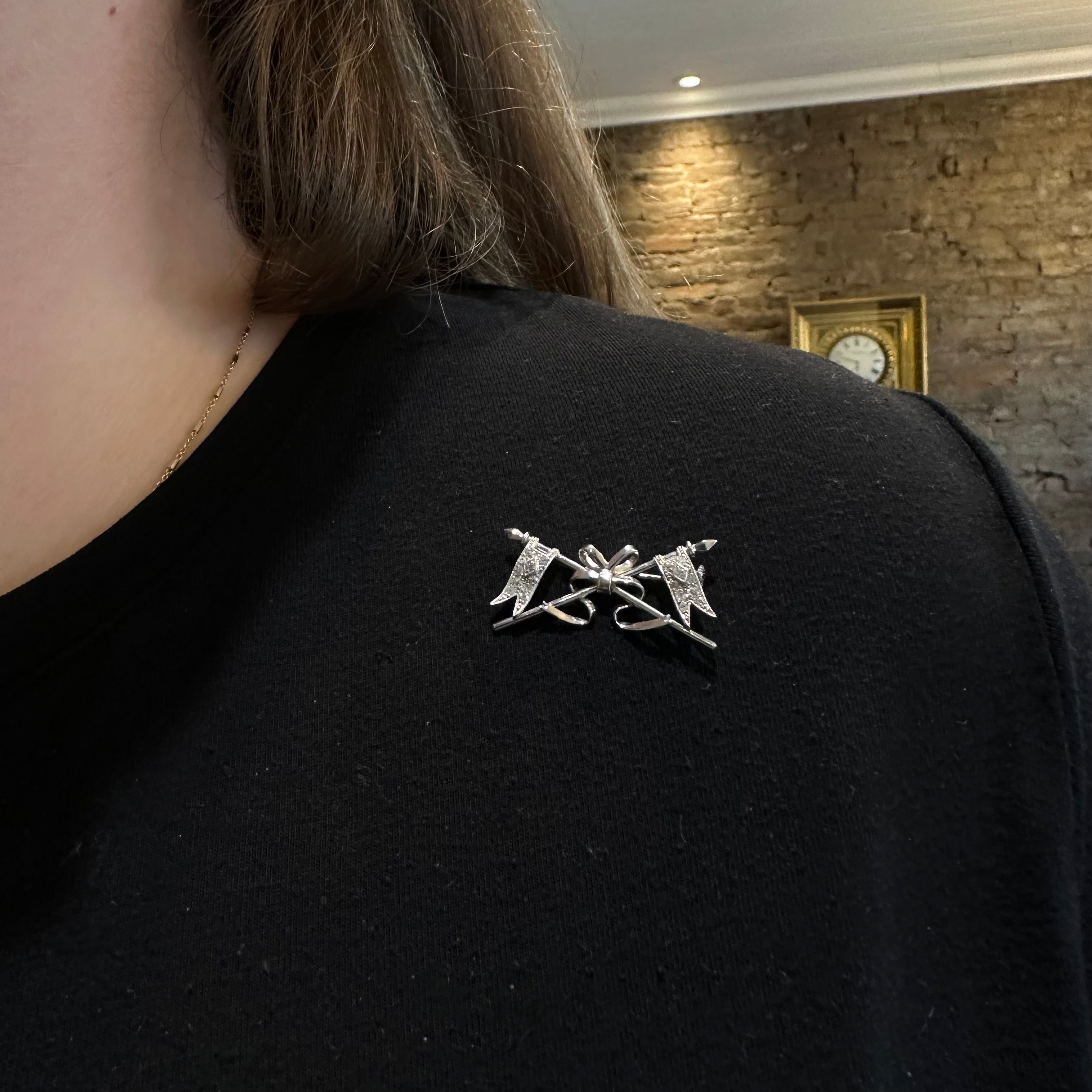 Estate platinum diamond brooch. A beautiful symbol of pride and honor, this diamond-set brooch features a pair of crossing swallow-tailed pennons, each hanging from a knight's lance. At the center, a ribbon connects the crossed lances.