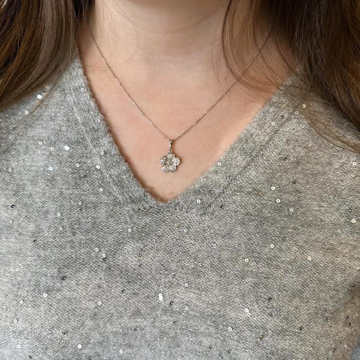 Estate 14k white gold and diamond pendant. This rare, ravishing, and romantic estate jewel, crafted in gleaming 14k white gold, blossoms with thirty-two sparkling round brilliant cut diamonds. The flower pendant drops from a classic tapered bail.