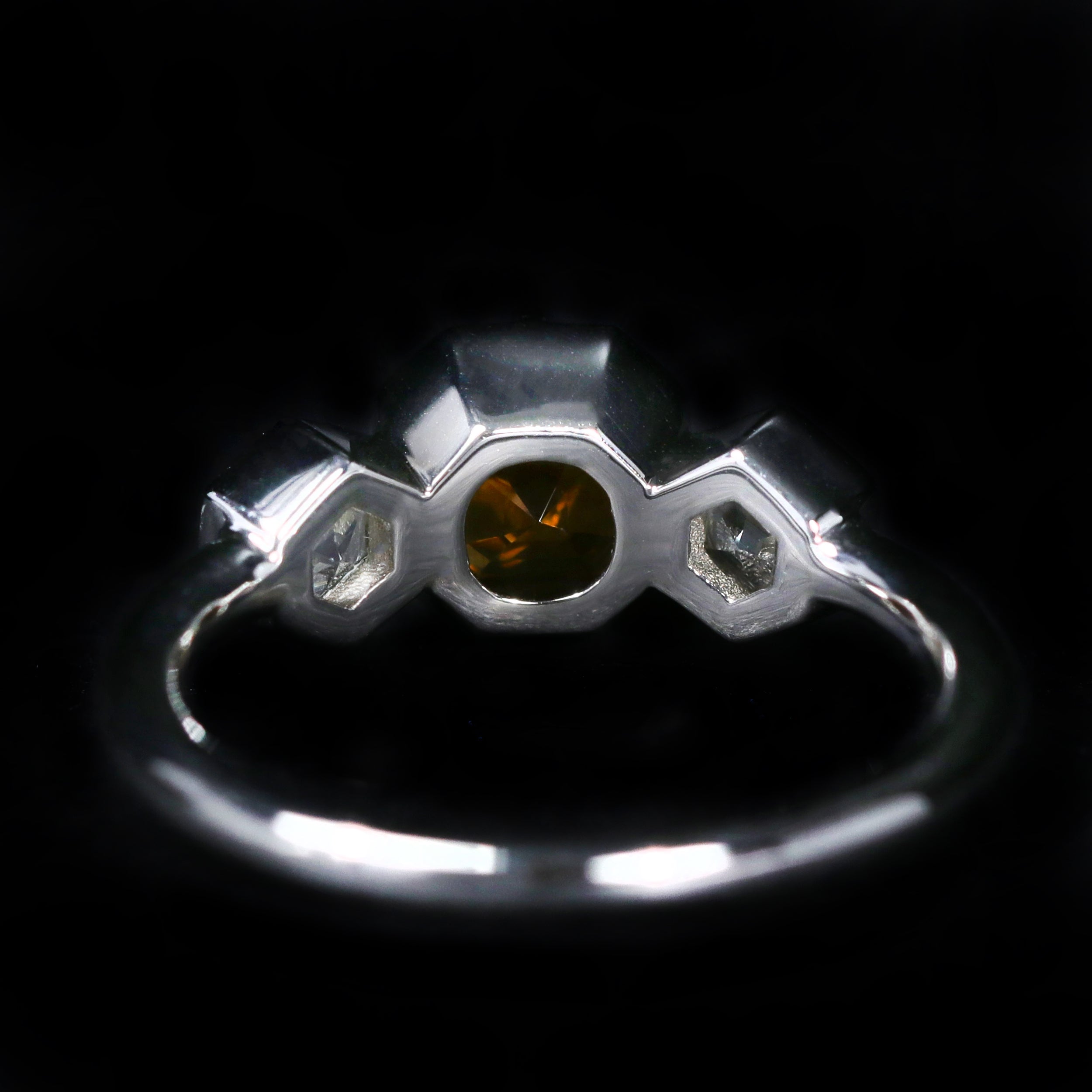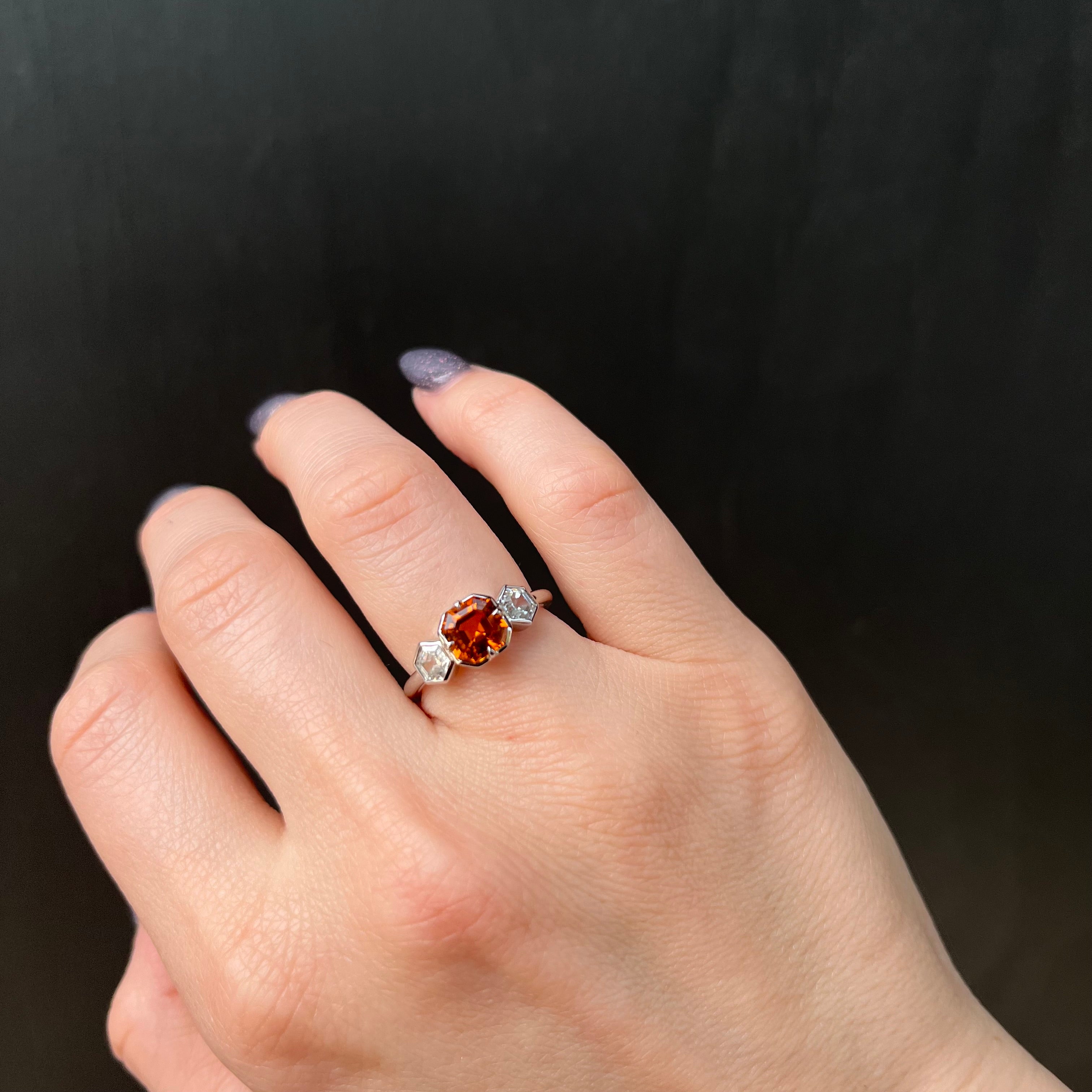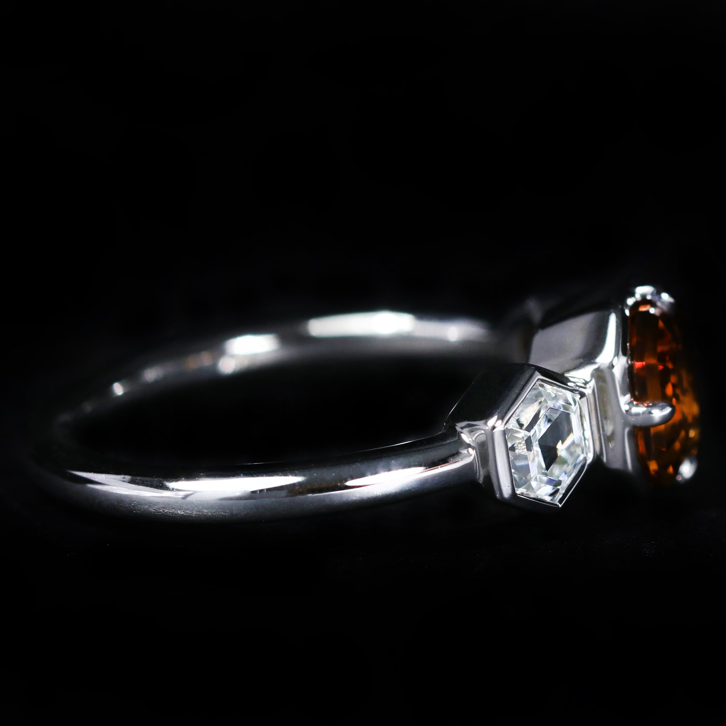 14k white gold, citrine, and zircon ring. This breathtaking three-stone design, rendered in gleaming 14k white gold, highlights a striking emerald-cut citrine imbued with golden orange hues. The citrine glimmers between two sparkling hexagon-cut colorless zircons.