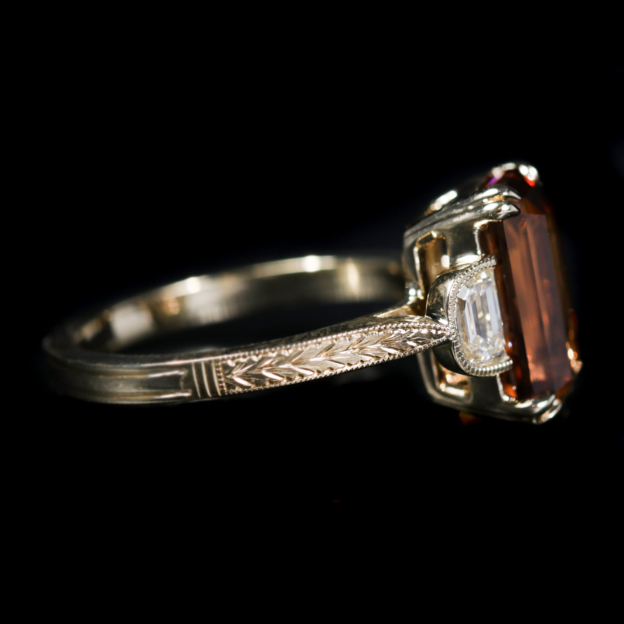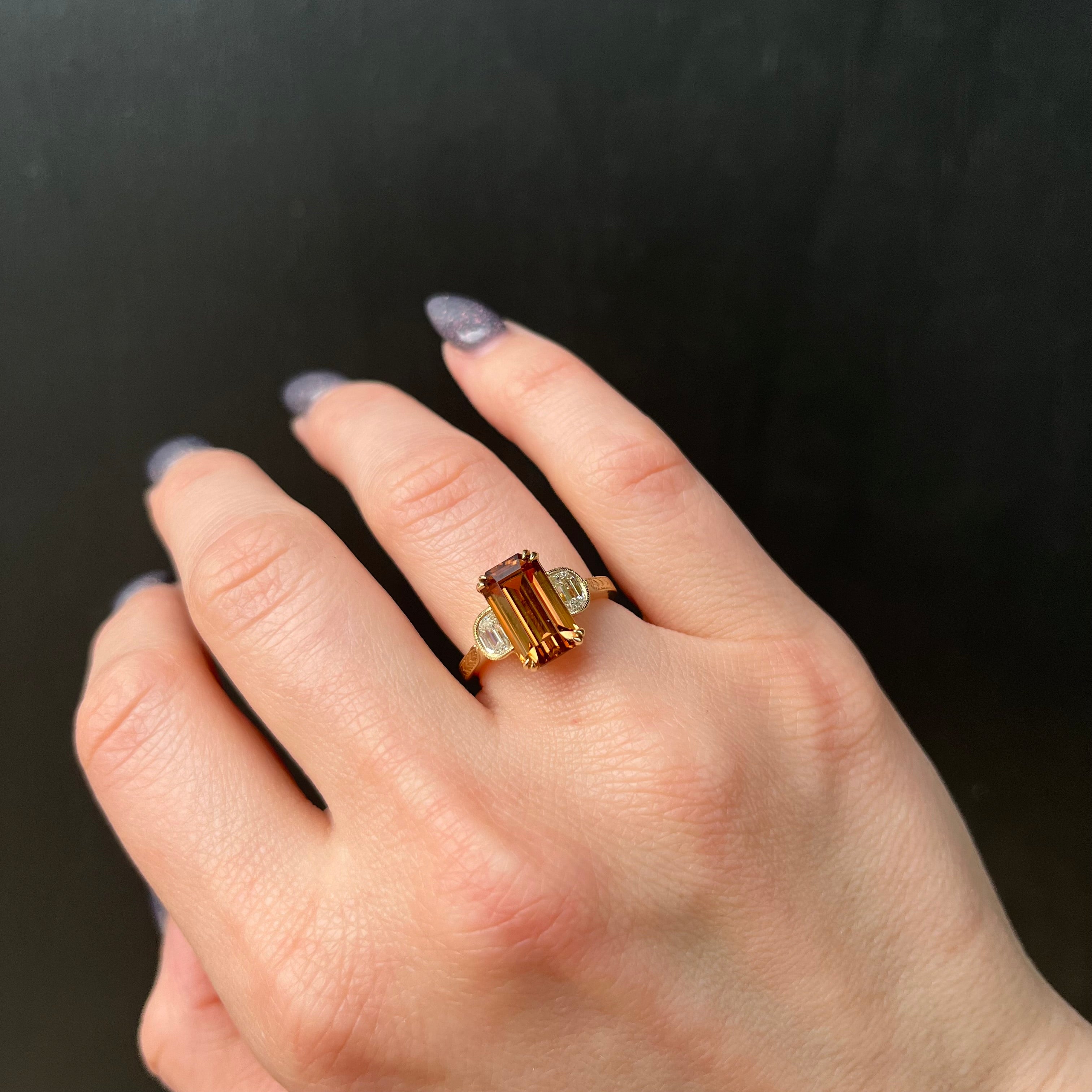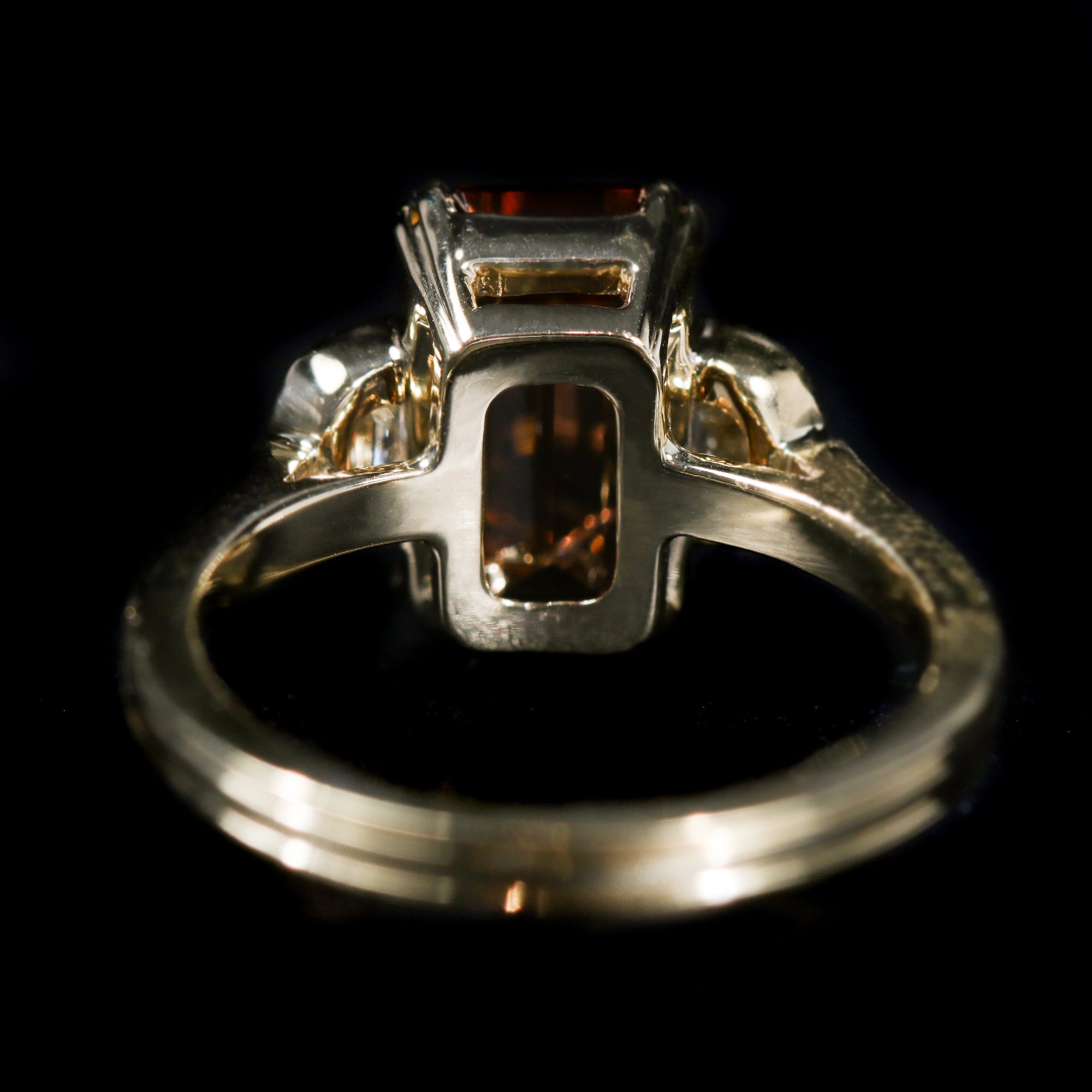 14K yellow gold, brown zircon, and diamond ring. Expertly crafted in rich yellow gold, this contemporary jewel highlights a striking emerald-cut brown zircon. The prong-set gemstone glows with gorgeous cinnamon hues, accented on either side by a glistening half moon shaped diamond.