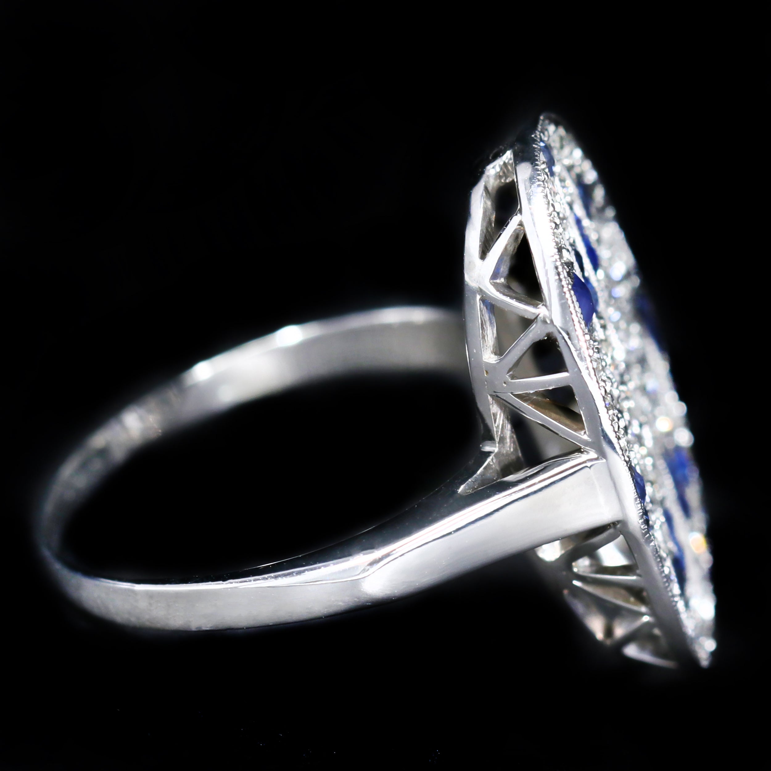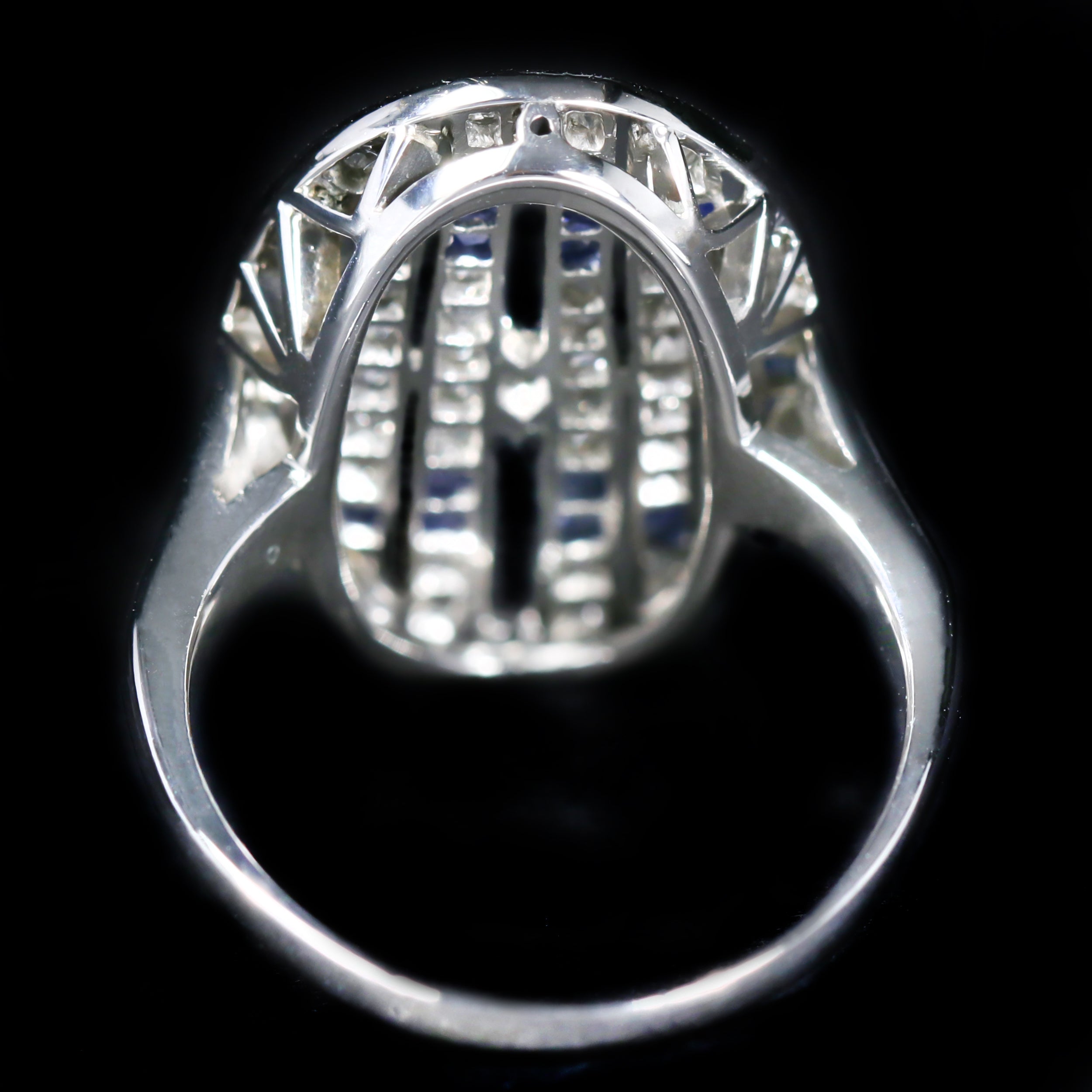 • Stones: 17 French Cut Sapphires (Synthetic and Natural) (approx. 0.10 carats total weight); 52 Single Cut Diamonds (approx. 0.40 carats total weight, I1 clarity, I/J color)