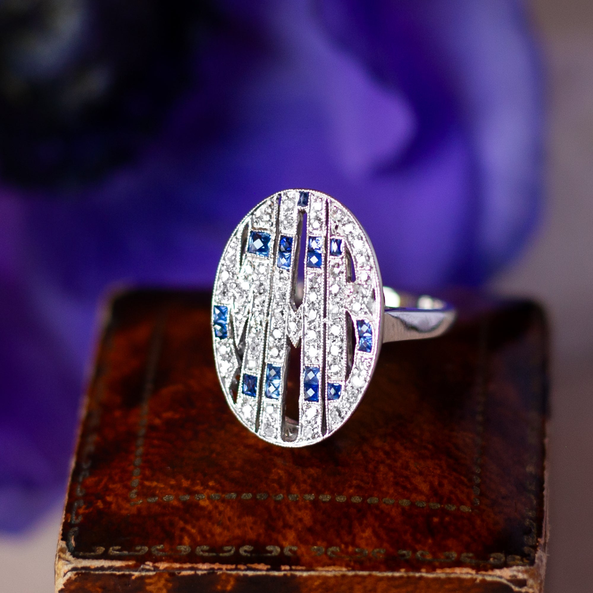 Estate 14k white gold, diamond, and sapphire ring. A truly unique piece, this elegant ring is set with blue sapphires—both synthetic and natural—and sparkling single cut diamonds. The flat, oval-shaped centerpiece is adorned with a beautifully intricate monogram featuring the letters 'M', 'M', and 'B'. As is often the case with antique and monogrammed jewelry, the interpretation of the letters may vary, adding a layer of intrigue and personal connection to the piece.