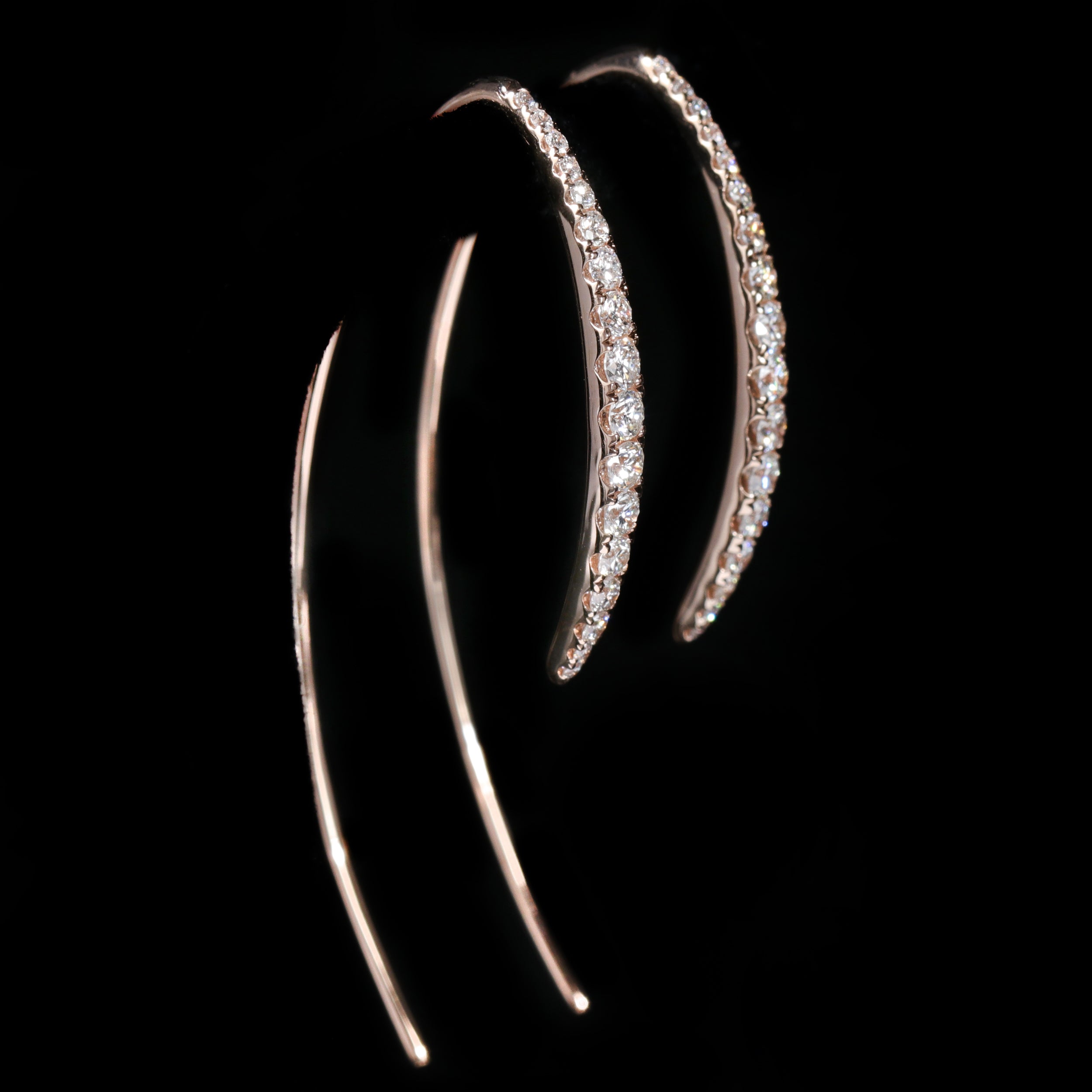 14K rose gold and diamond earrings. These threader earrings offer a modern, minimalist take on everyday sparkle. Chic and effortless, each earring features a line of round brilliant cut diamonds set along the front. Lightweight and easy to wear, they bring just the right amount of shimmer to any look.