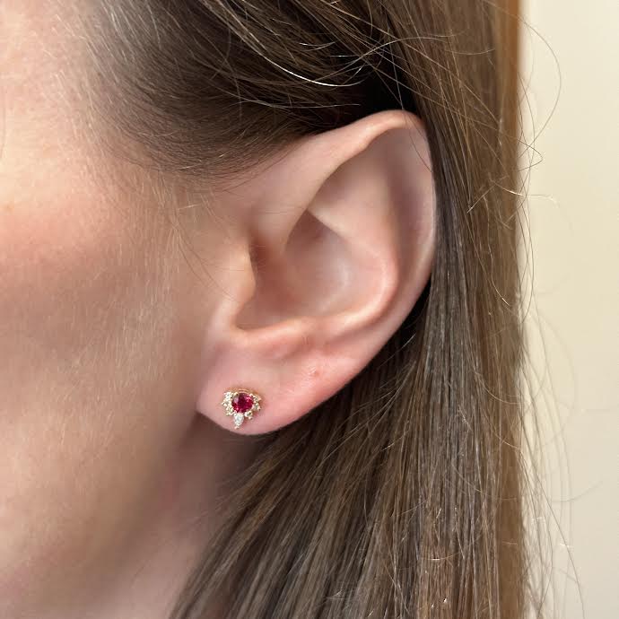 14K yellow gold ruby and diamond earrings. Crafted in warm yellow gold, these elegant earrings highlight a captivating round ruby infused with vivid cherry-red hues. Cascading gracefully alongside the ruby, a series of sparkling diamonds artfully graduate in size culminating in a striking marquise diamond. With their sophisticated silhouette and understated allure, these earrings serve as the perfect complement for any occasion, seamlessly enhancing your ensemble with a touch of timeless glamor.