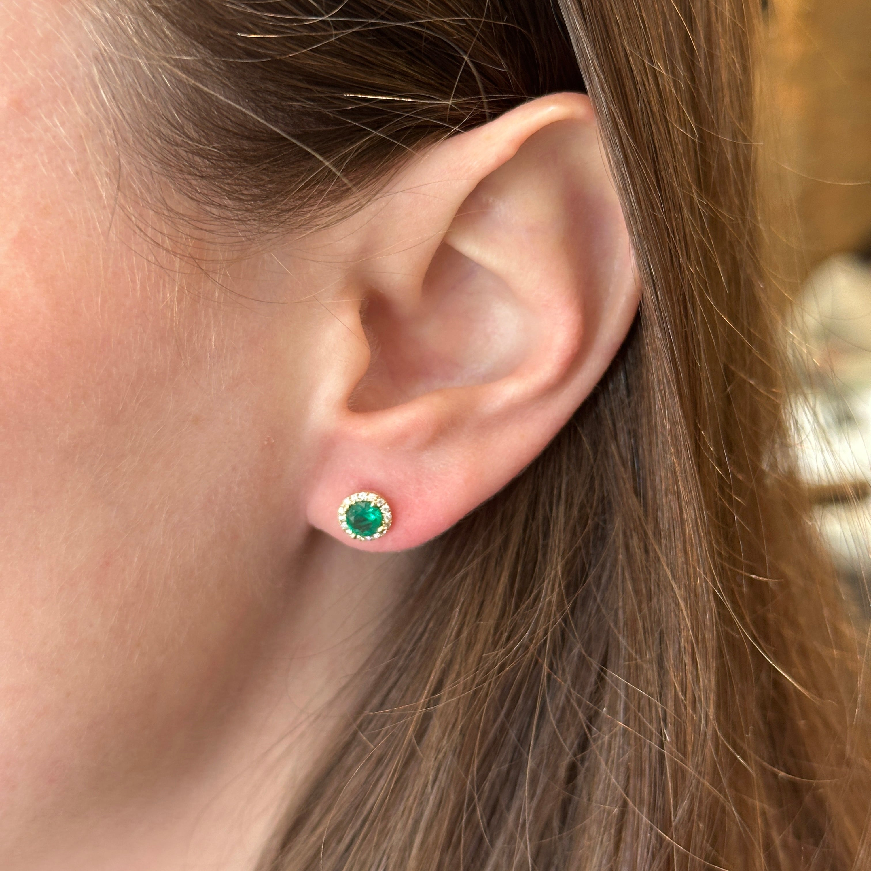 14k yellow gold, emerald, and diamond earrings. These elegant stud earrings feature stunning round cut emeralds. Each vibrant green emerald is beautifully surrounded by a halo of sparkling round brilliant cut diamonds, creating a timeless look and a perfect choice for any occasion.