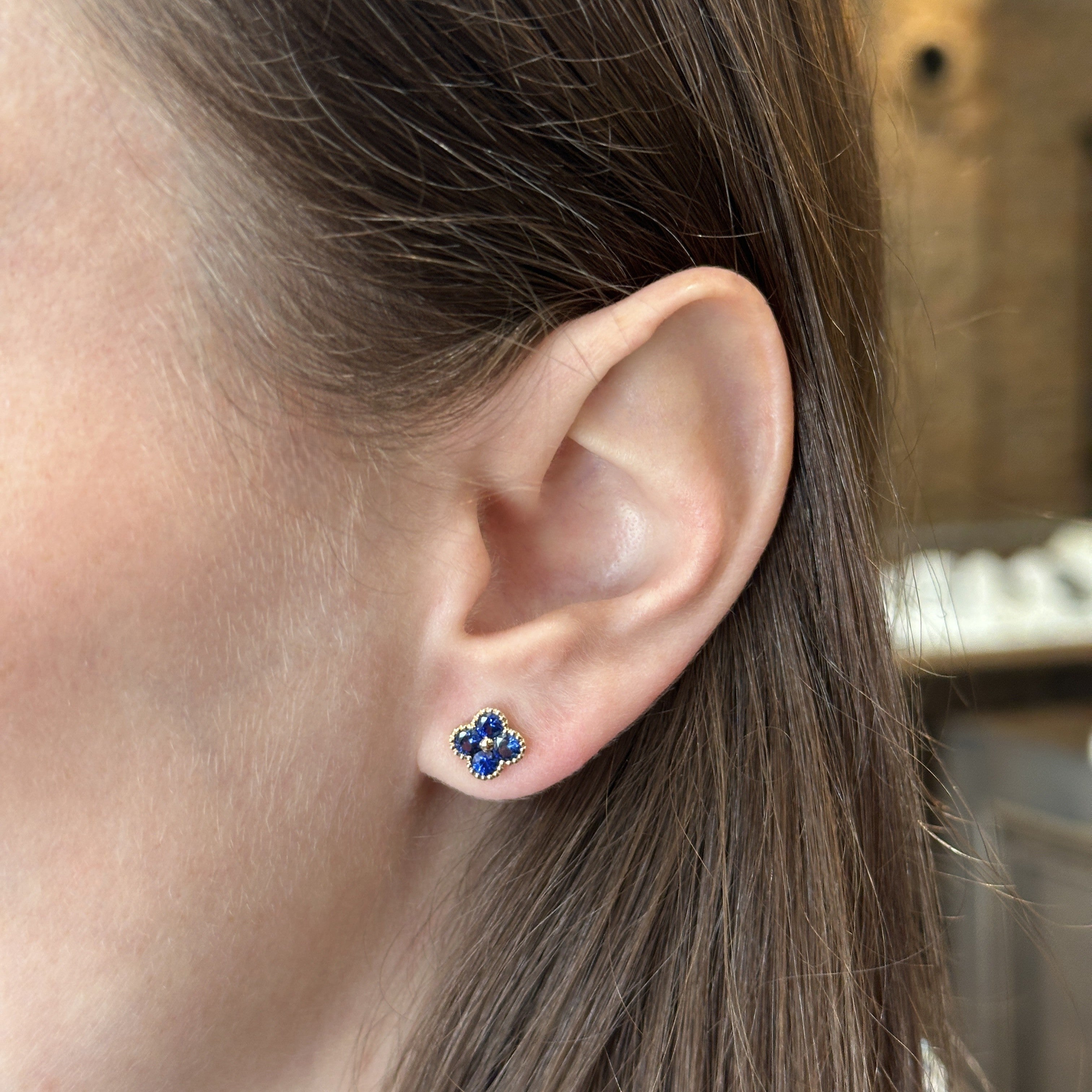 14K yellow gold and sapphire earrings. These charming studs showcase four shimmering sapphires in each ear, arranged in a classic quatrefoil design. The sapphires are securely set in a luxurious 14K yellow gold setting, accented by a delicate milgrain border. The studs are equipped with a friction back, ensuring a secure and comfortable fit.