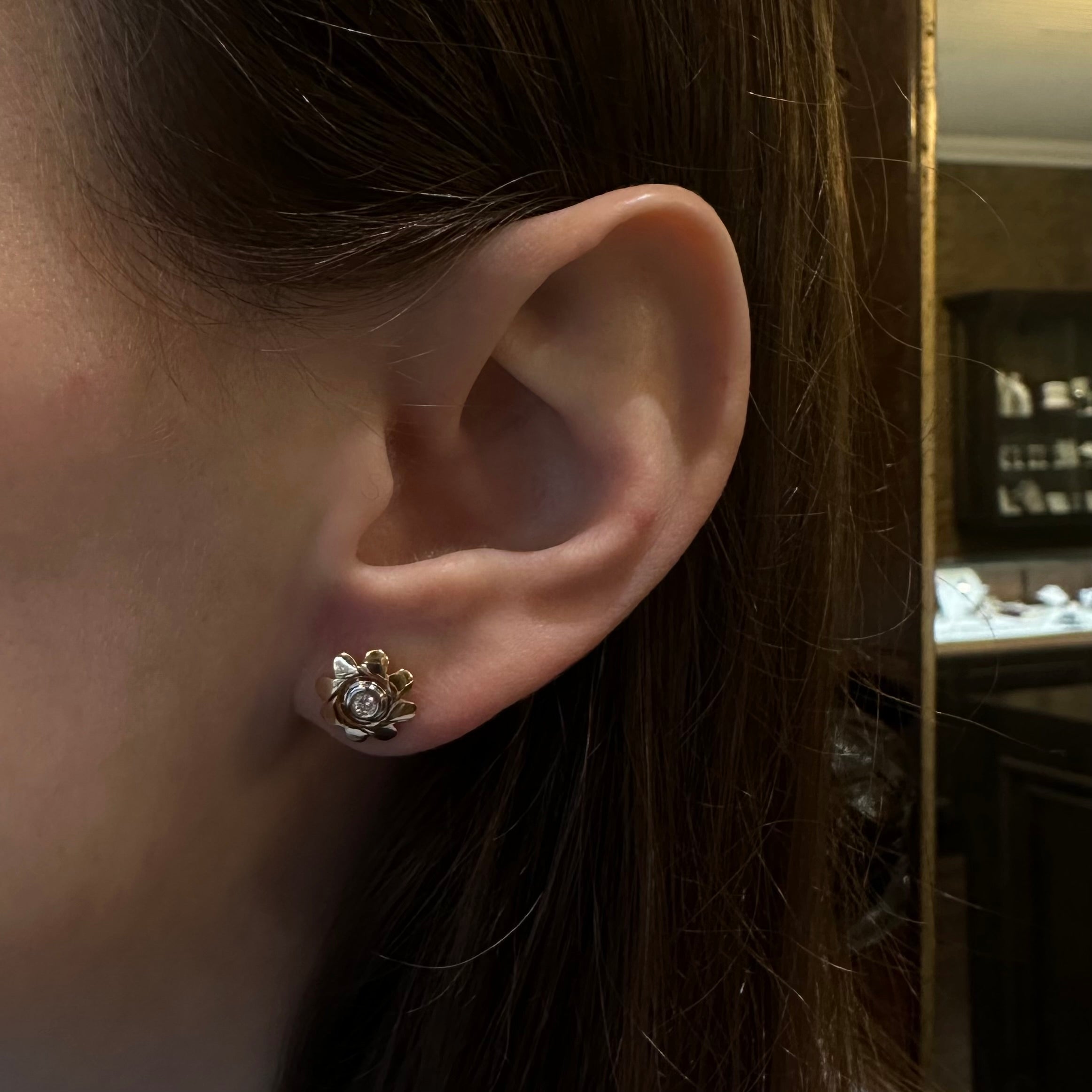 14k two-tone gold and diamond earrings. These beautiful blossom stud earrings twinkle with a round brilliant cut diamond set in beautifully polished white gold bezels. The earrings feature a post and friction style back closure.