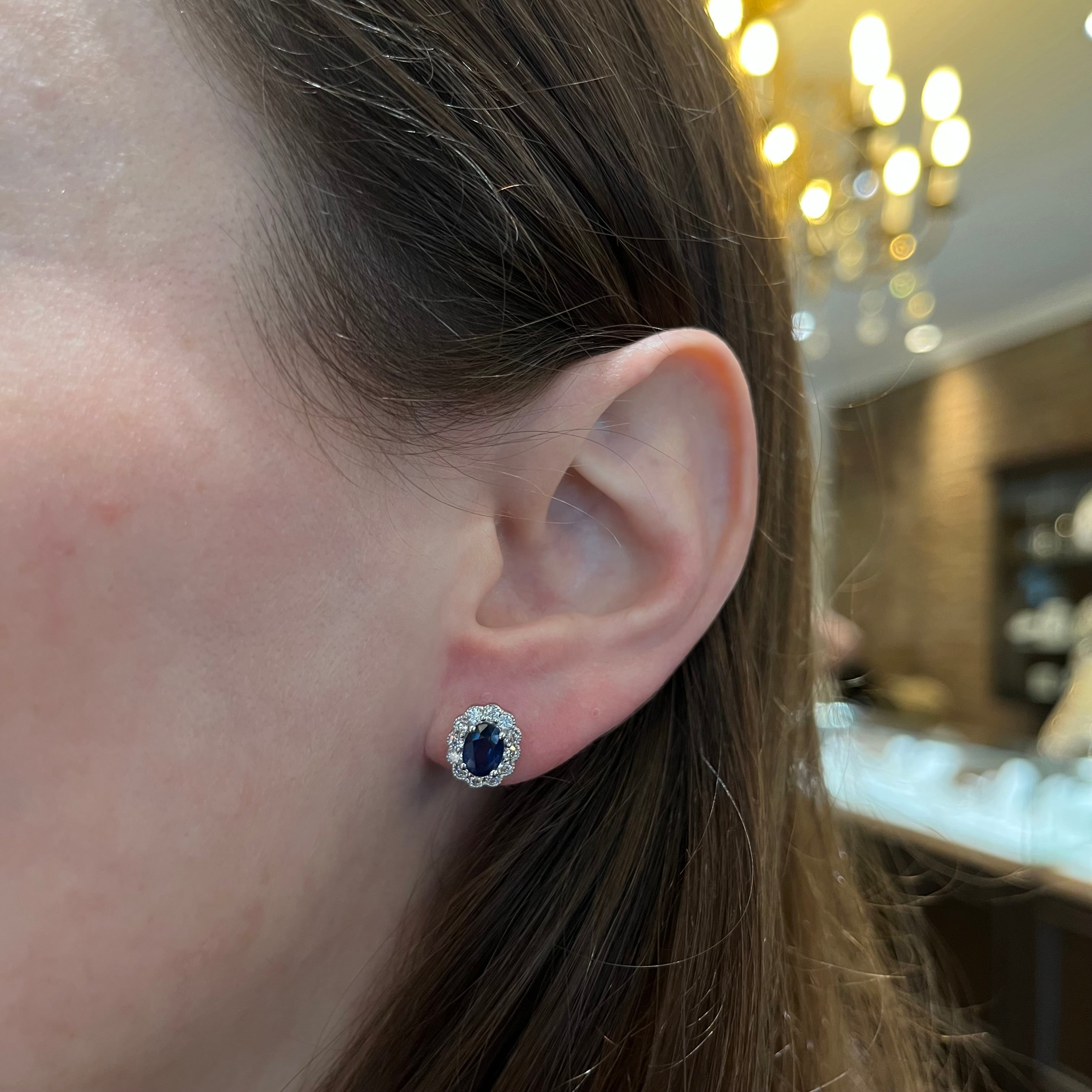 18K white gold, sapphire, and diamond stud earrings. These absolutely stunning oval-shaped sapphires, together weighing 1.75 carats, display a velvety blue hue. Set in a classic scalloped-style stud mounting, 0.54 carat total weight in round brilliant cut diamonds surrounds the sapphires, accented by delicate milgrain detail. The stud earrings secure comfortably with friction style backs.