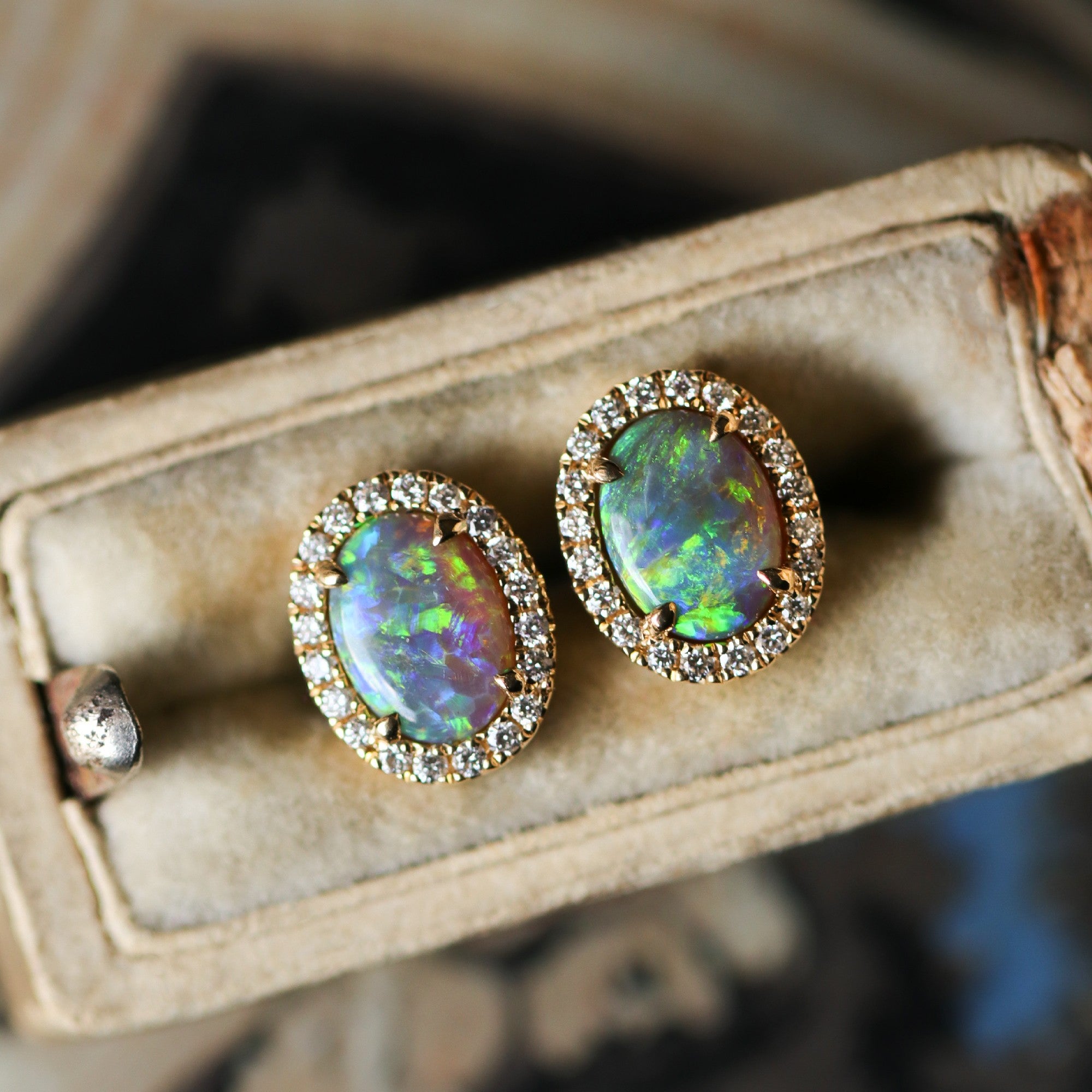 18K yellow gold, black opal, and diamond earrings. These 18K yellow gold stud earrings feature oval cabochon black opals, prized for their rich play-of-color and natural depth. The opals are set in four prongs and framed by halos of round brilliant cut diamonds, adding contrast and sparkle that enhance the their vibrant flashes of blue, green, orange, yellow, and pink. The earrings secure with posts and friction backs for comfortable, everyday wear. Elegant and rare, these studs offer a timeless setting for one of the world’s most captivating gemstones.