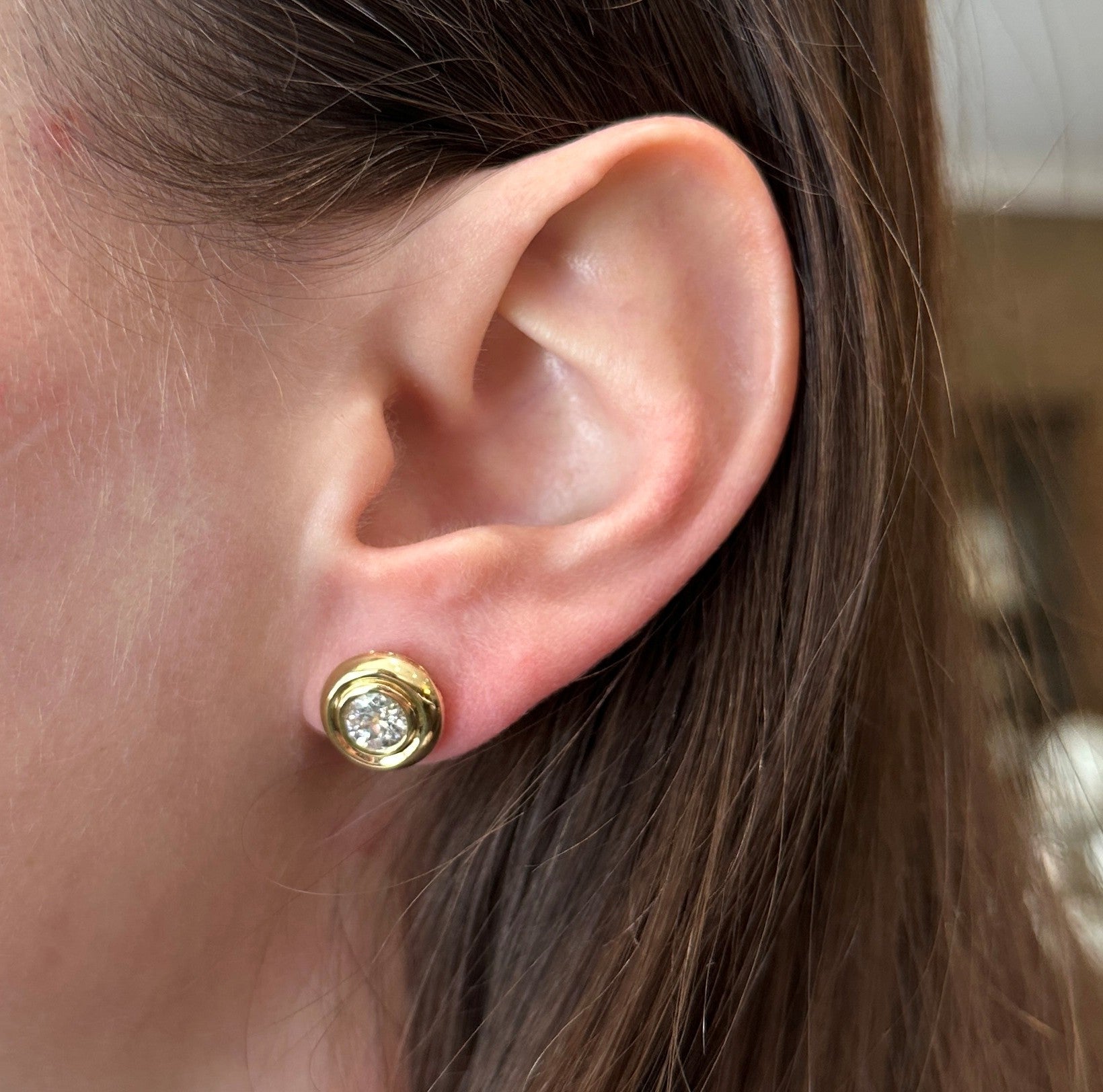 18K yellow gold and diamond earrings. Crafted in rich 18K yellow gold, these diamond stud earrings dazzle with Old European cut diamonds, each framed in a substantial gold bezel that enhances their presence and gives the studs a larger, more impactful look. Striking yet refined, these are the perfect everyday statement studs—classic with a confident twist.