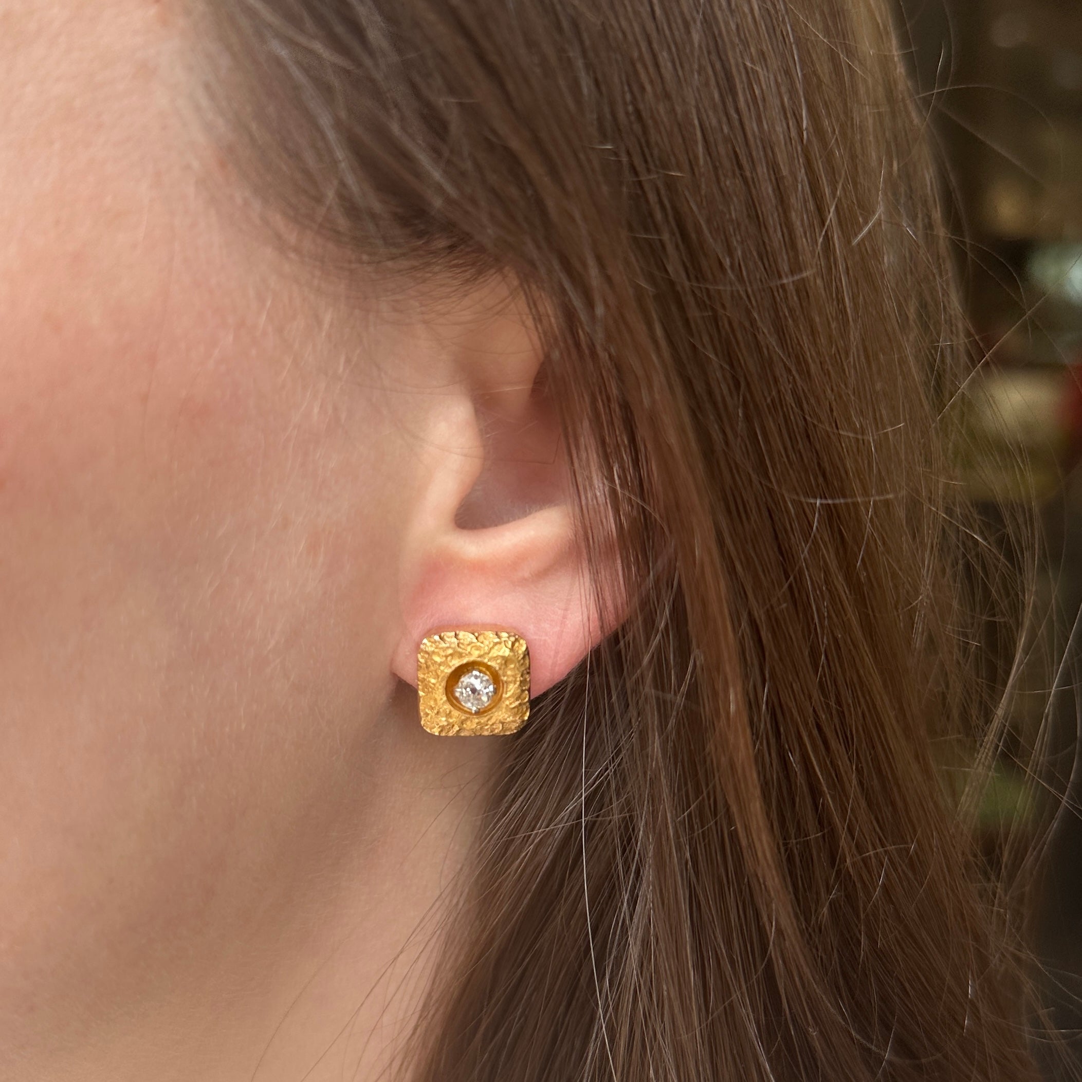Estate 14K yellow gold and diamond earrings. These 14K yellow gold earrings combine bold texture with antique sparkle in a striking, sculptural design. Each square-shaped stud features softly rounded edges and a richly textured nugget-style surface. At the center of each earring, a prong-set Old Mine cut diamond adds a touch of vintage charm with its warm, romantic faceting. Finished with friction backs for secure wear.