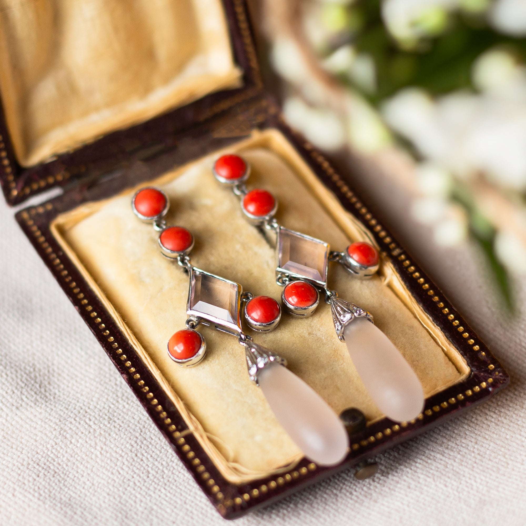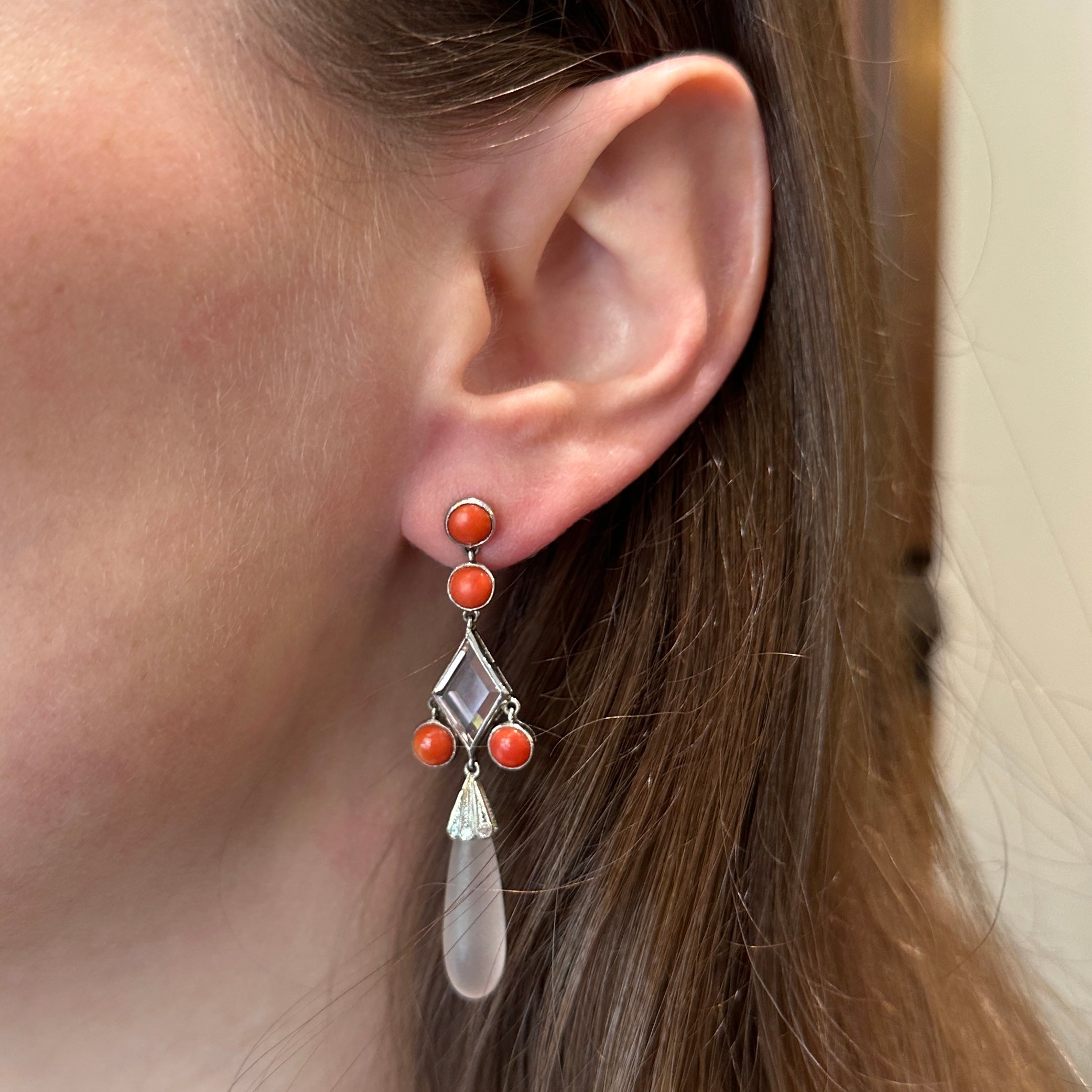 Estate platinum, diamond, coral, and rose quartz earrings. These exquisite statement earrings feature bezel-set coral cabochons at the top, adding a vibrant touch to the piece. Below, kite-shaped portrait cut rose quartz stones dangle gracefully, offering a soft, ethereal pink hue that beautifully contrasts with the bright coral. The earrings are further adorned with diamond-set caps that top an articulating pair of rose quartz drops, each with a sophisticated matte finish. This combination of textures and colors, along with the luxurious platinum setting, creates a truly one-of-a-kind accessory that captures attention with its unusual design and refined craftsmanship.