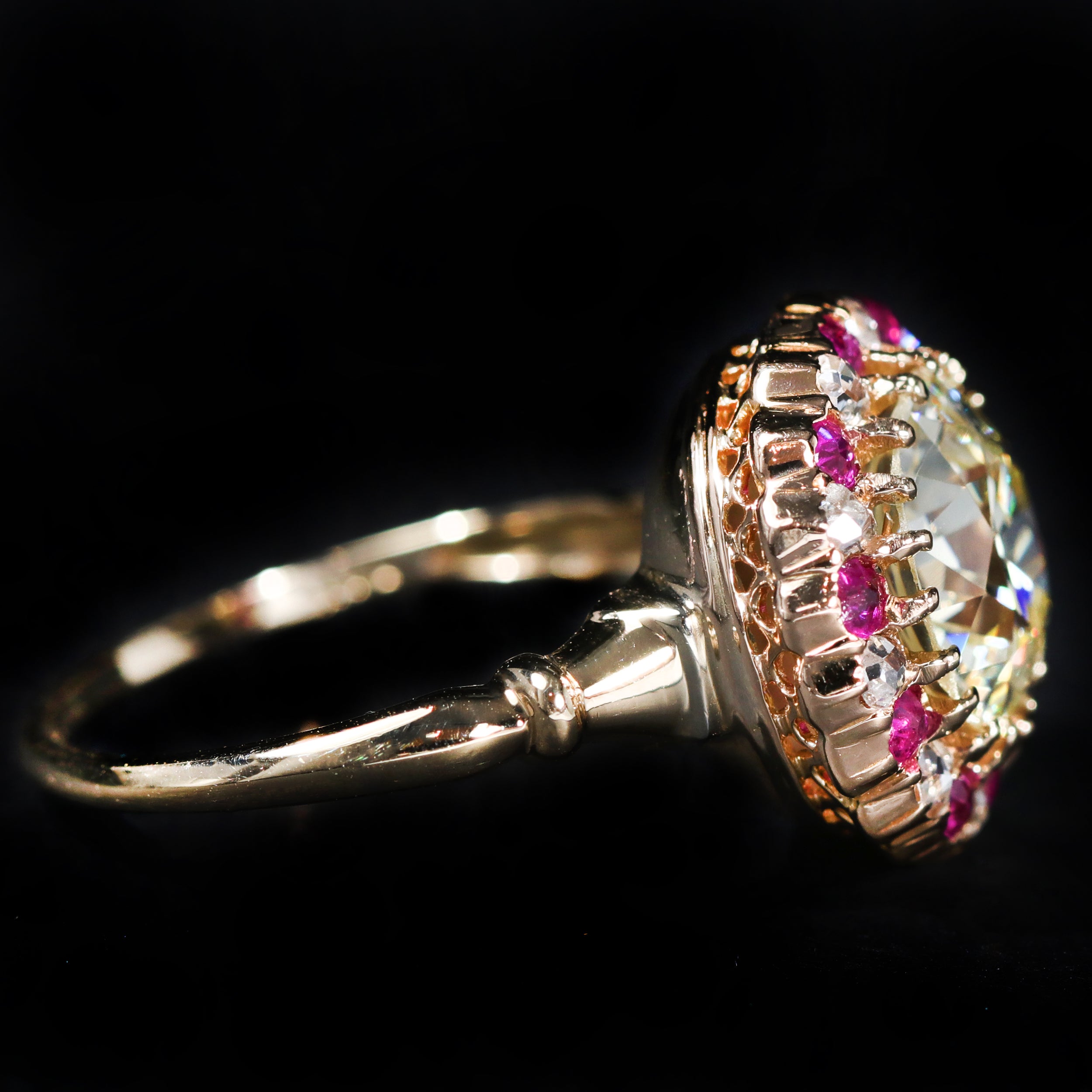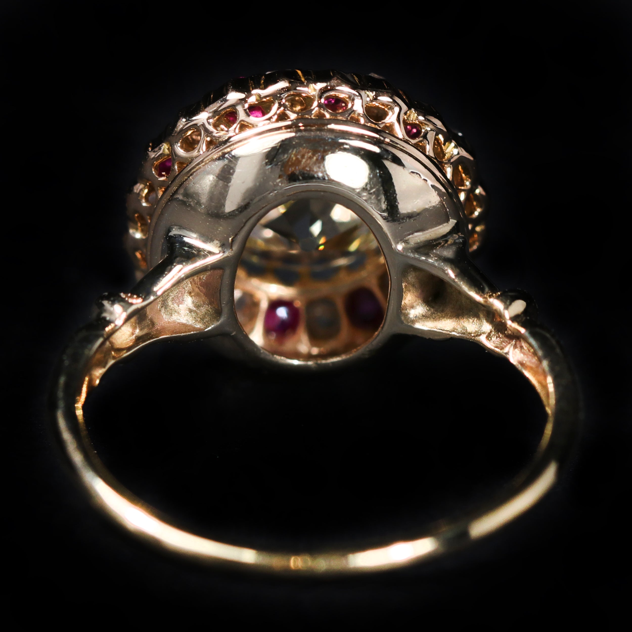Estate 14k yellow gold, diamond, and ruby ring. An extraordinary profusion of sparkle, color, and exquisite detail combine to create this marvelous estate jewel. At the center is a gorgeous Old European cut diamond, scintillating within multiple prongs. The diamond is surrounded by a sparkling array of rose cut diamonds and rubies, all presented in 14k yellow gold.