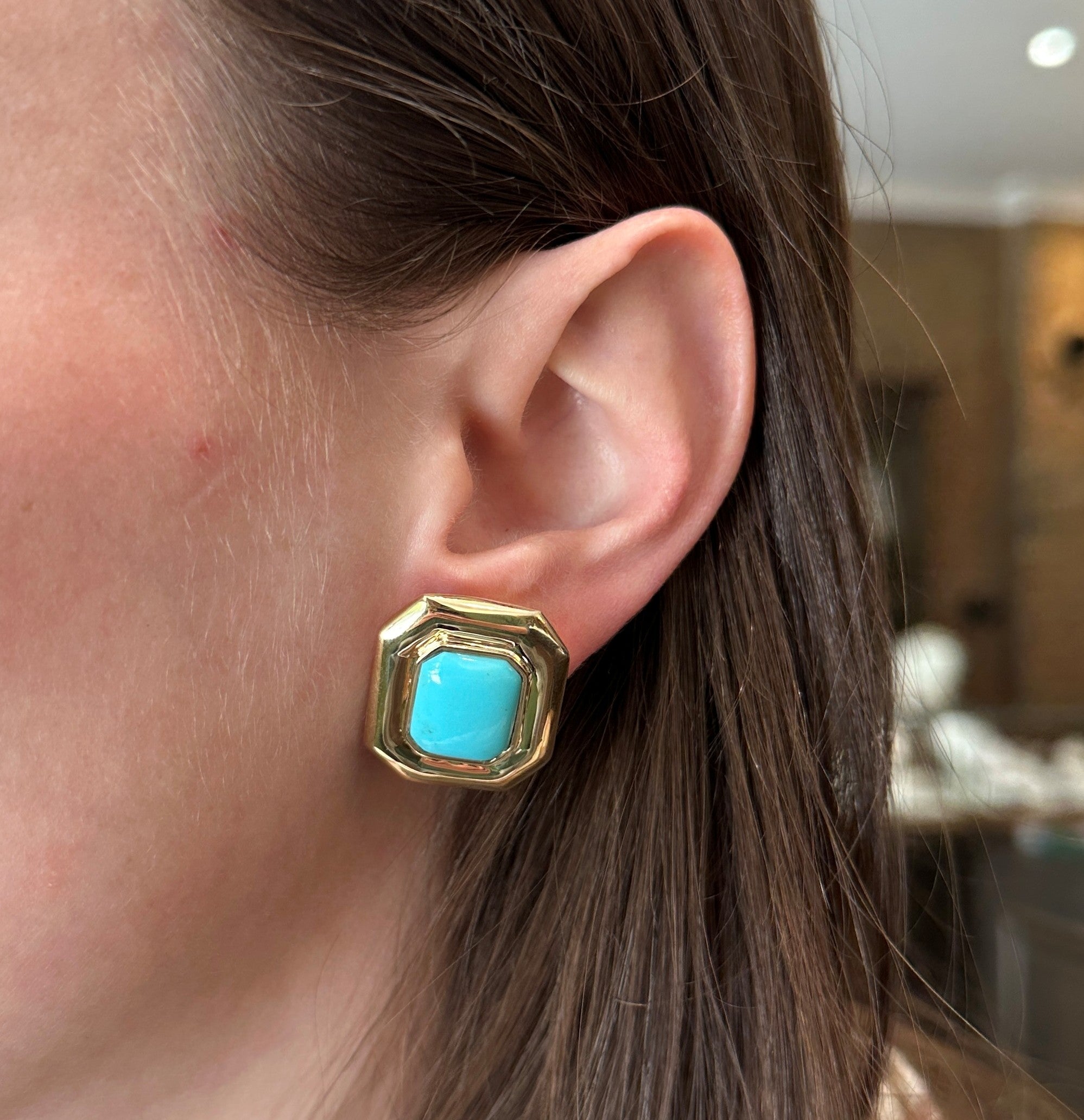 Estate 18K yellow gold and turquoise earrings. These striking octagonal turquoise cabochons are bezel set in a substantial 18K yellow gold frame that highlights the stones' vivid, natural blue hue. The bold geometric shape paired with the smooth cabochon cut creates a lovely, sculptural look. Secured with posts and friction backs, these studs offer an eye-catching pop of color!