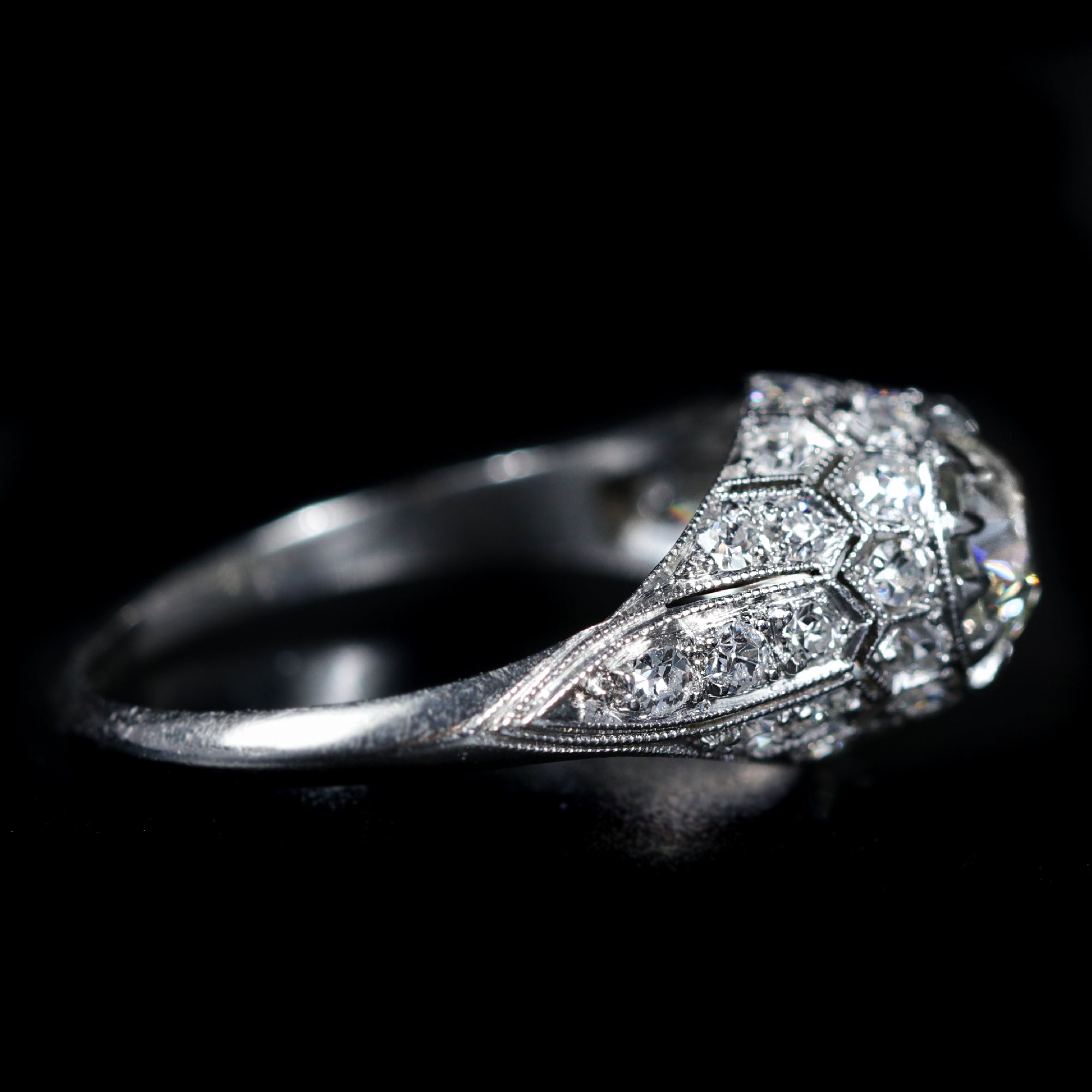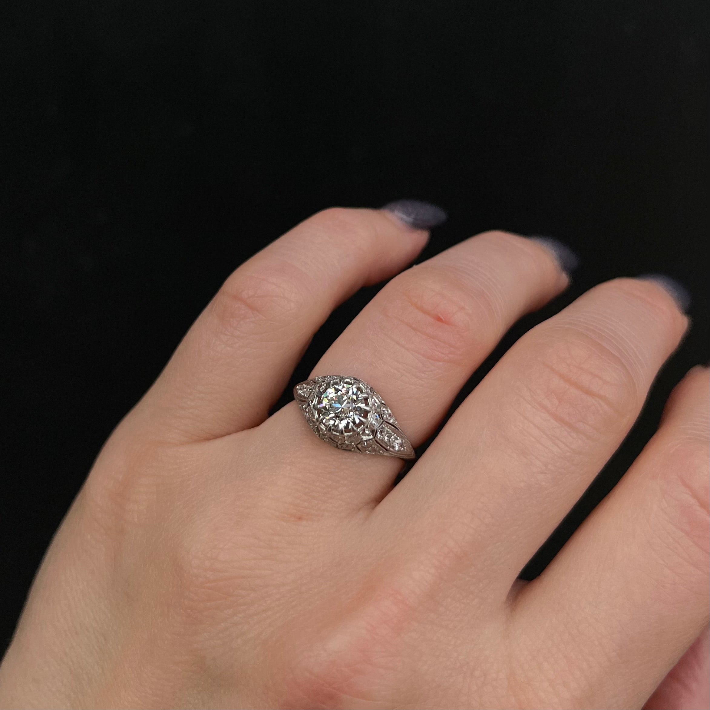 Estate platinum and diamond ring. A gleaming Old European cut diamond radiates at the center of this lovely open work design. The prong-set center is elegantly embellished on all sides by twinkling single cut diamonds, accentuated with delicate wire work, and all finished with fine milgrain detail.