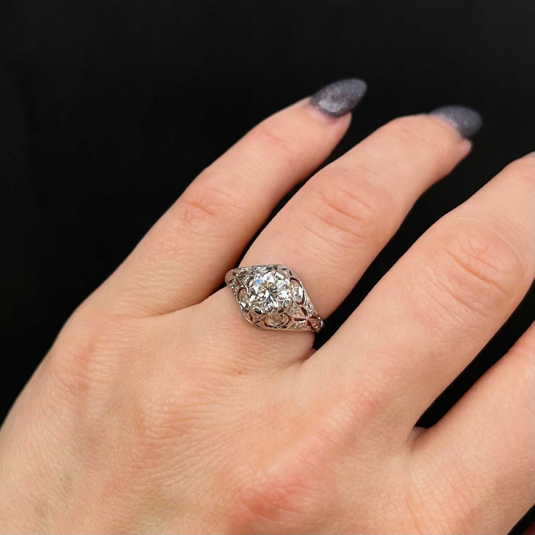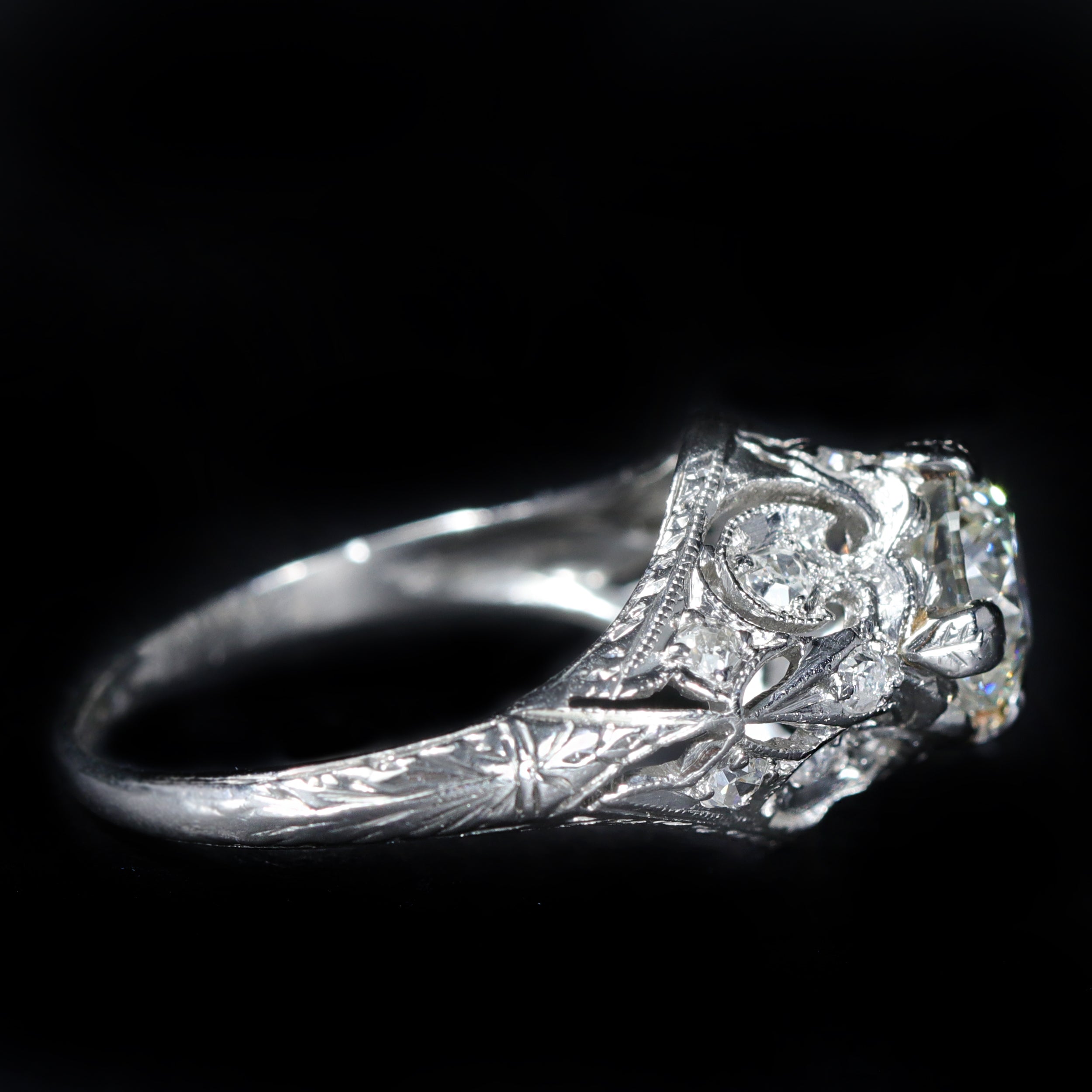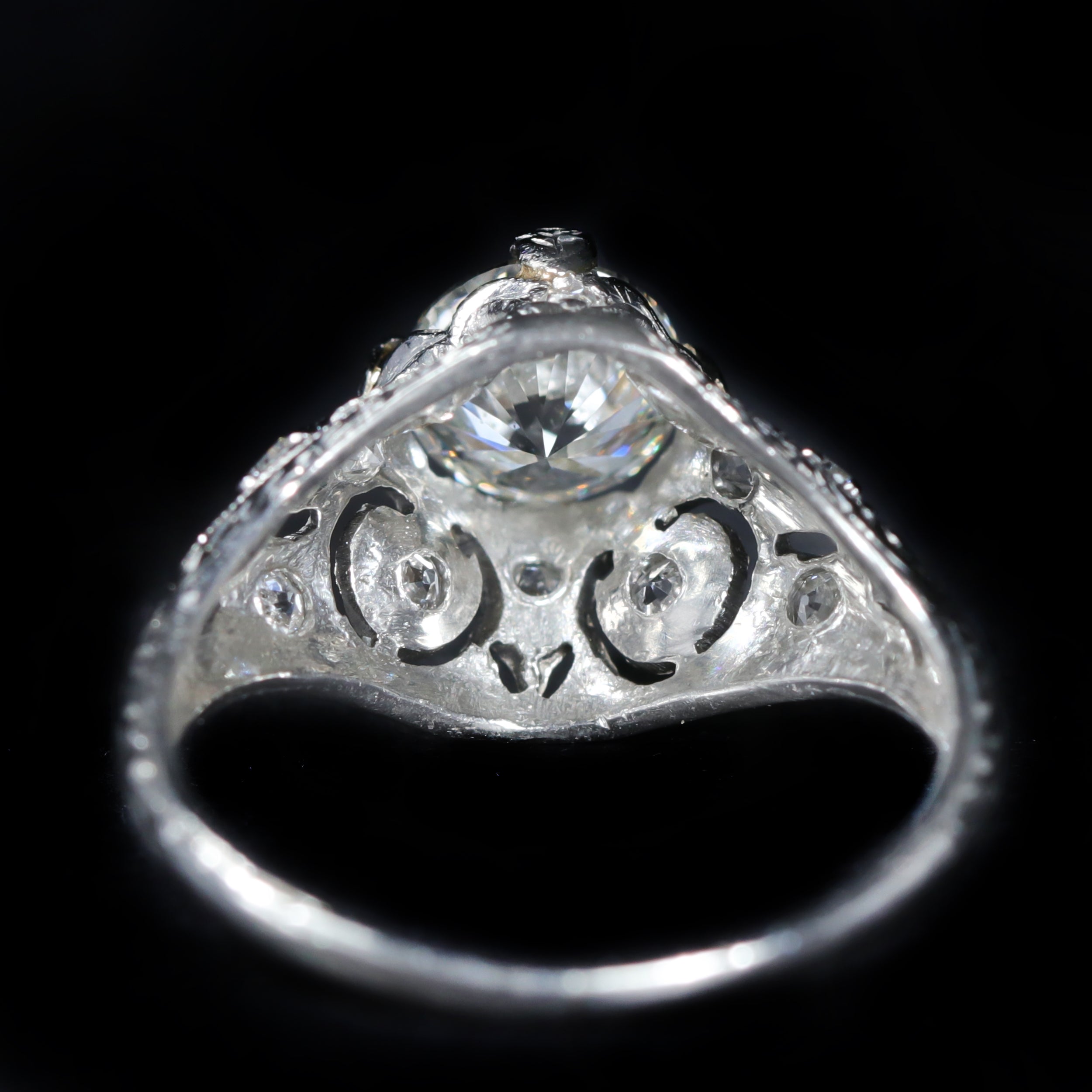 Estate platinum and diamond ring. Skillfully crafted in platinum and intricately detailed throughout, this fabulous ring radiates with a gleaming Round Brilliant cut diamond at the center, bearing a GIA Diamond Report stating: 1.01 carat, I color, SI1 clarity. The elegant platinum mounting glistens with single cut diamonds that trace the open and airy filigree design.