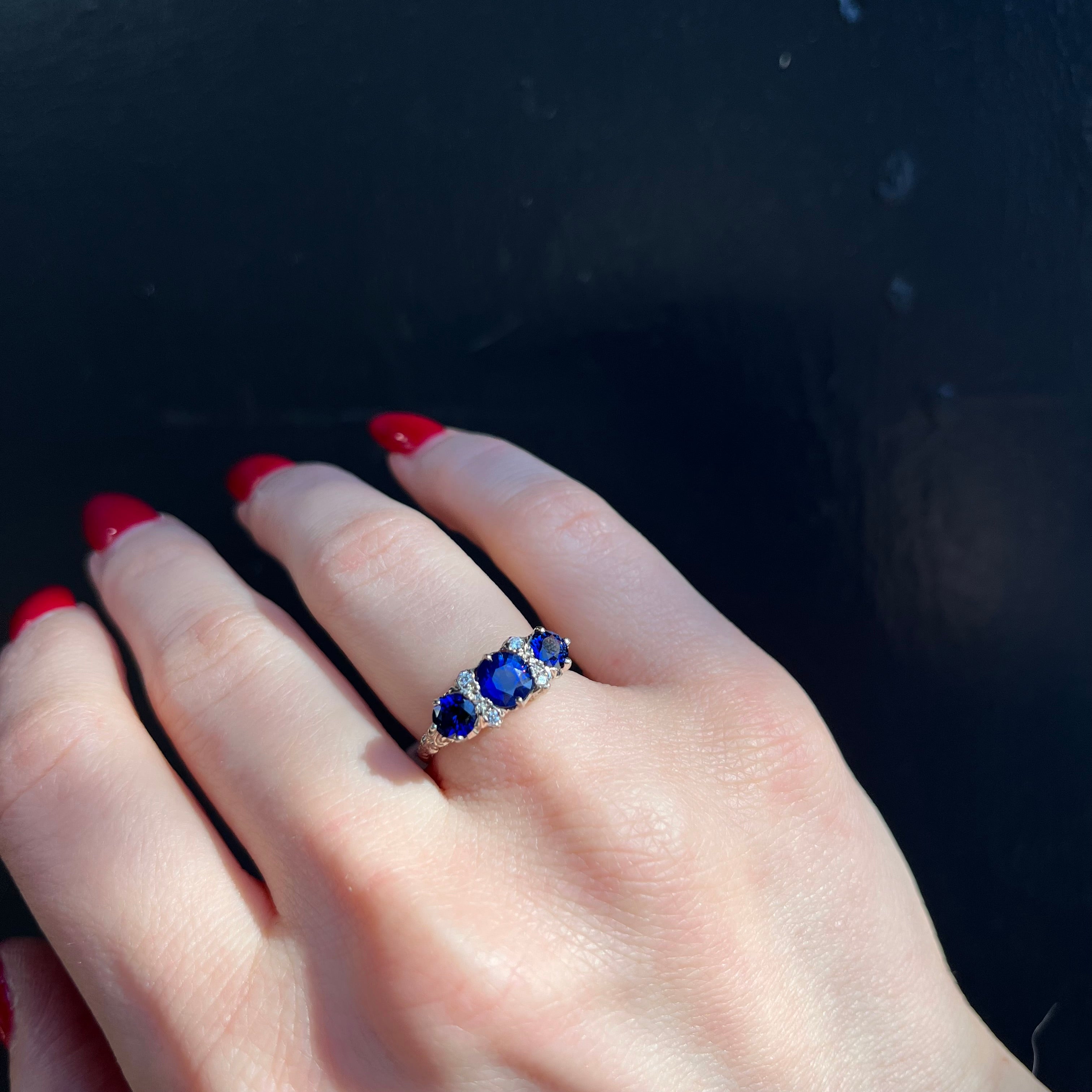 • Center Gem Details: 3 Round Sapphires (approx. 1.65 carats total weight)