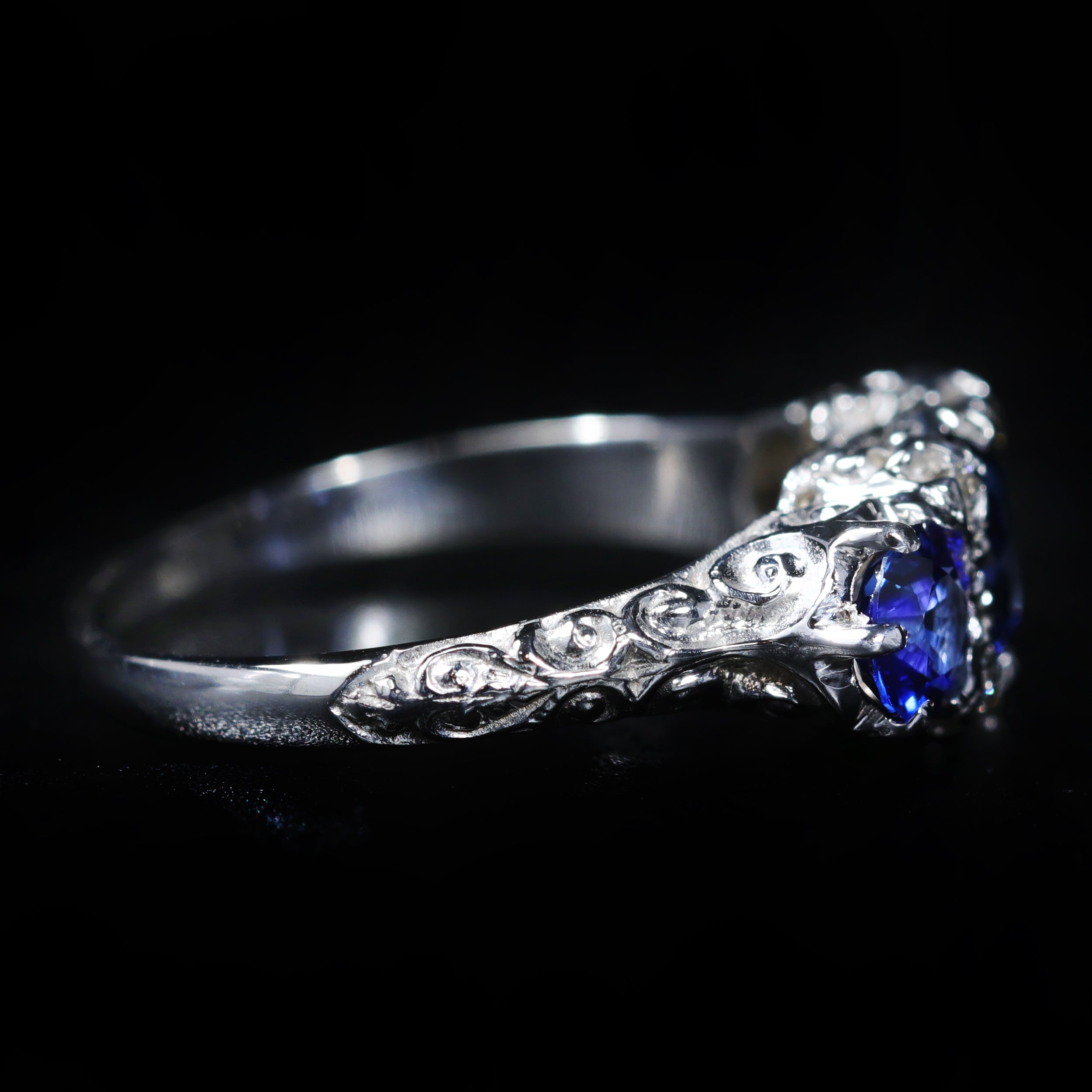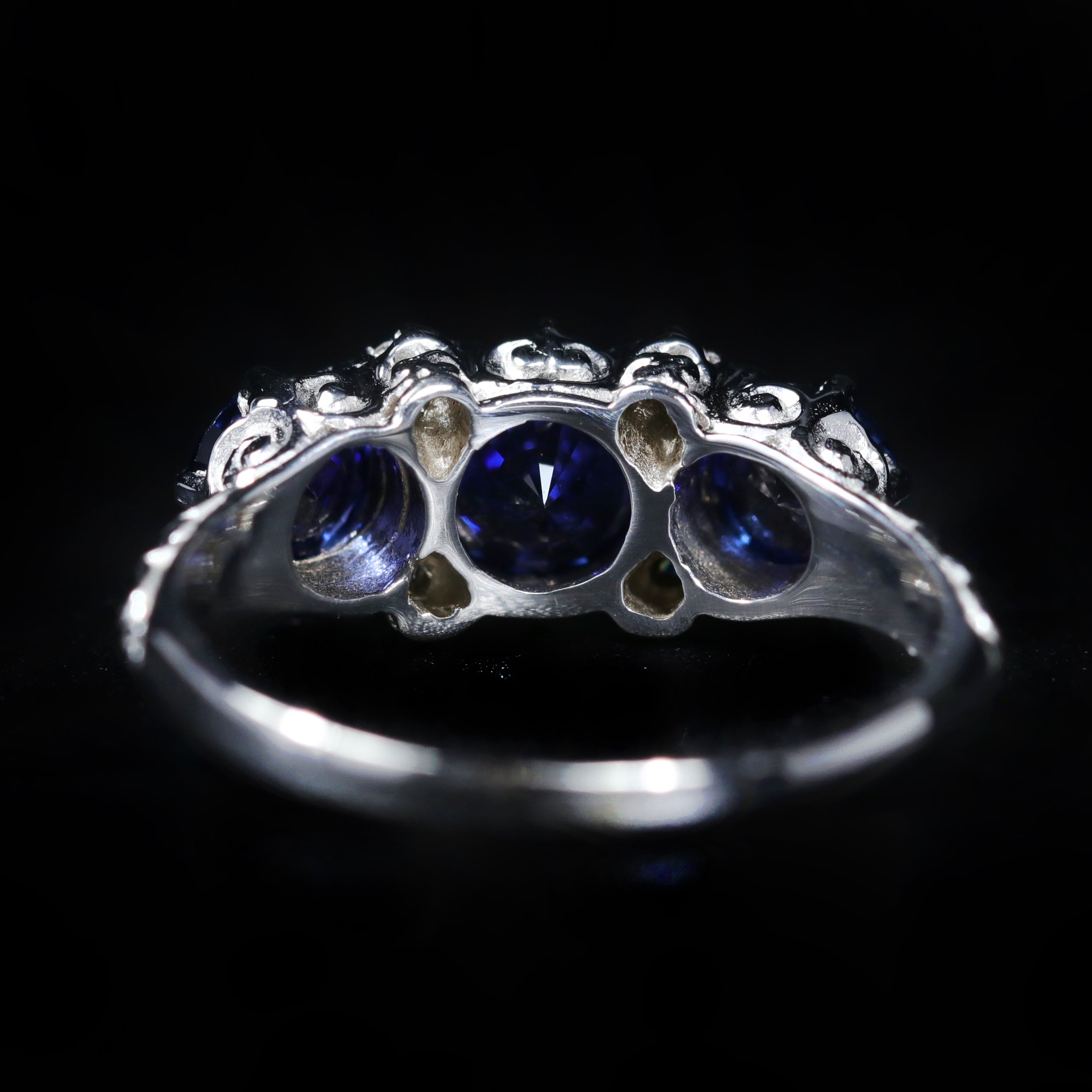 14K white gold sapphire and diamond ring. Inspired by the elegant designs from the Victorian period, this stunning jewel highlights a trio of round-cut blue sapphires, together weighing approximately 1.65 carats. The rich, velvety blue hued gemstones are accented with four twinkling round brilliant cut diamonds mounted in a bright white gold setting and decorated with romantic scrollwork along the profile and shoulders.