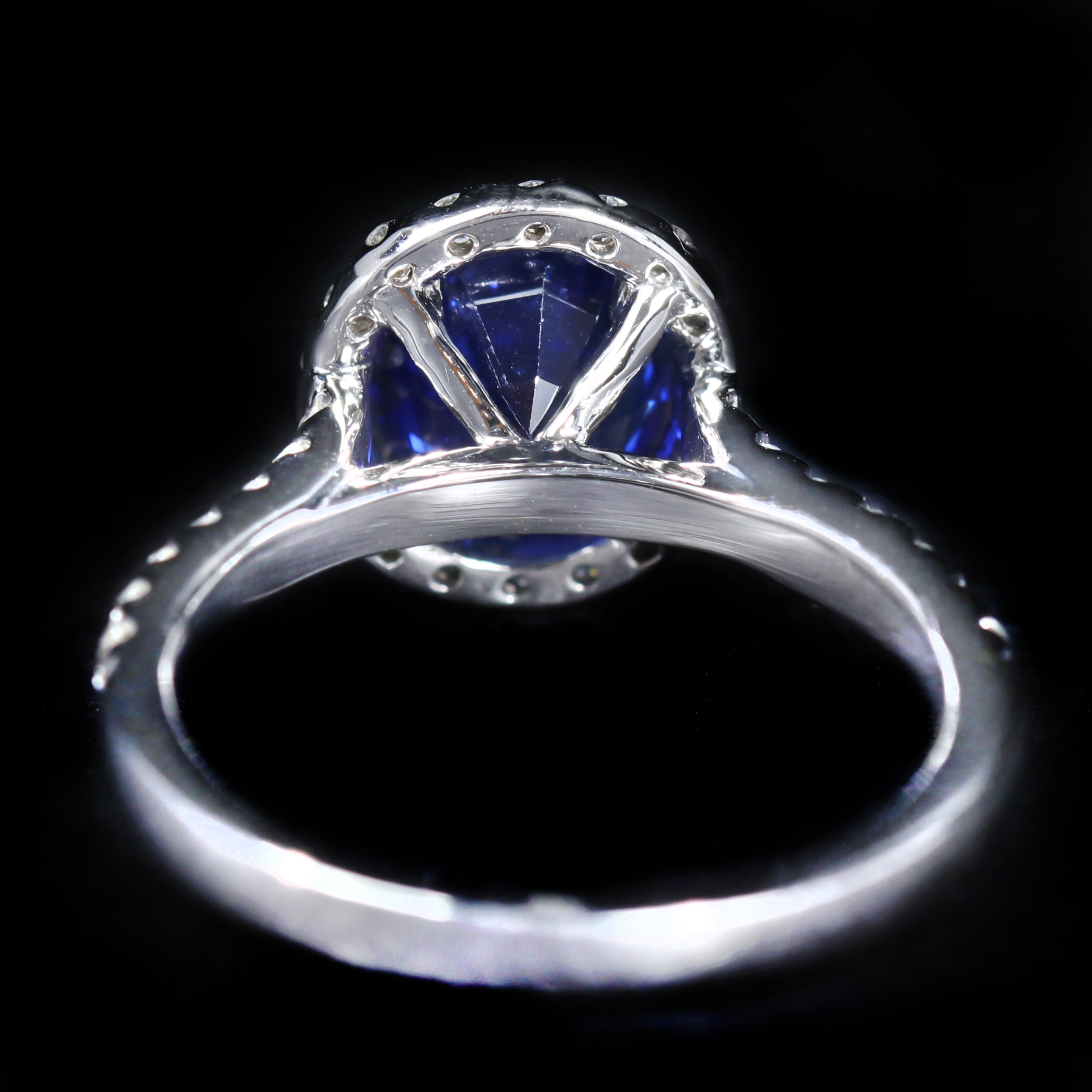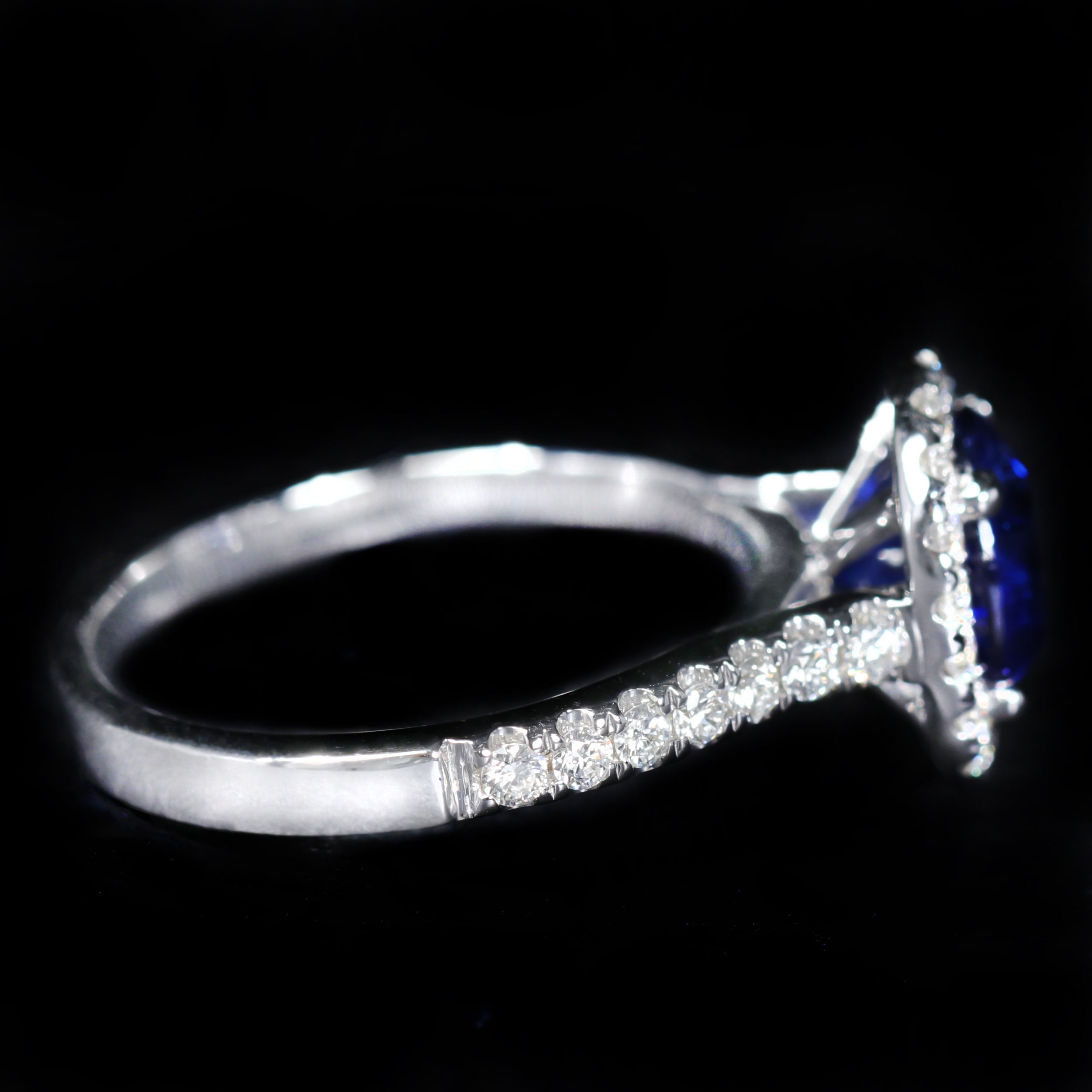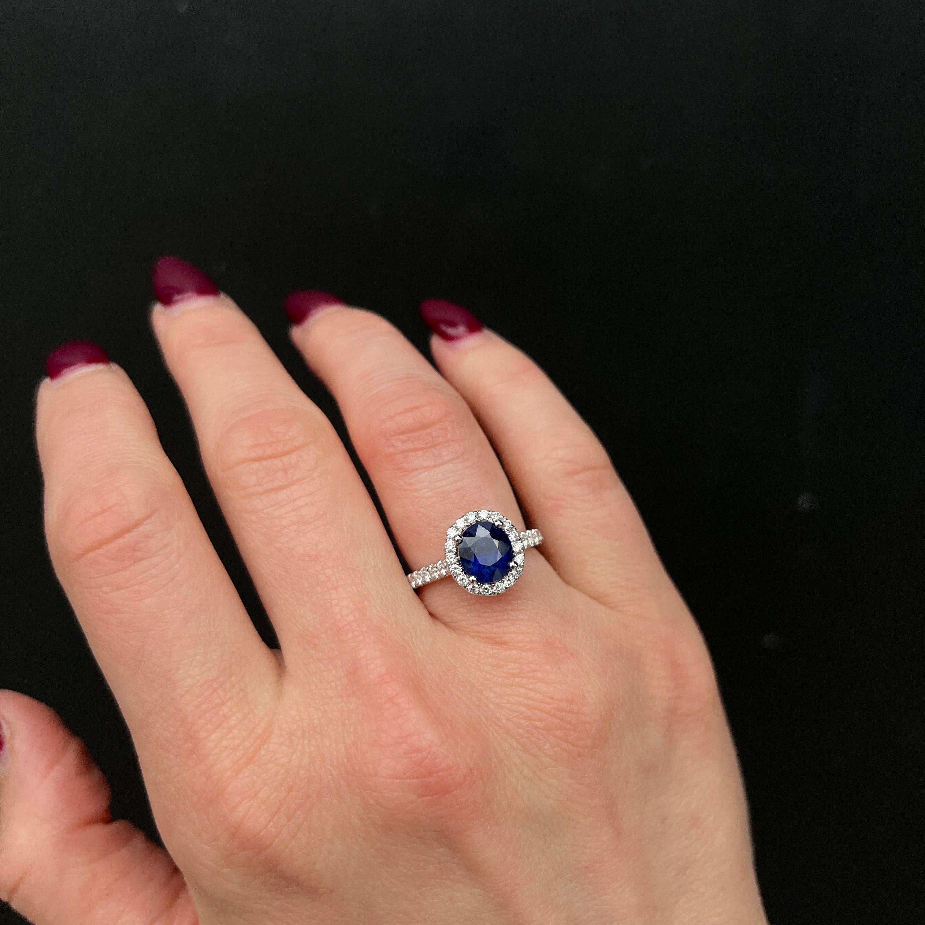 14k white gold, sapphire, and diamond ring. This stunning ring showcases a vibrant oval-cut sapphire, embued with royal blue hues that sparkle with captivating brilliance. The sapphire is prong-set at the center of a classic diamond halo design, which continue along each side of the band to create a seamless flow of sparkle and elegance.