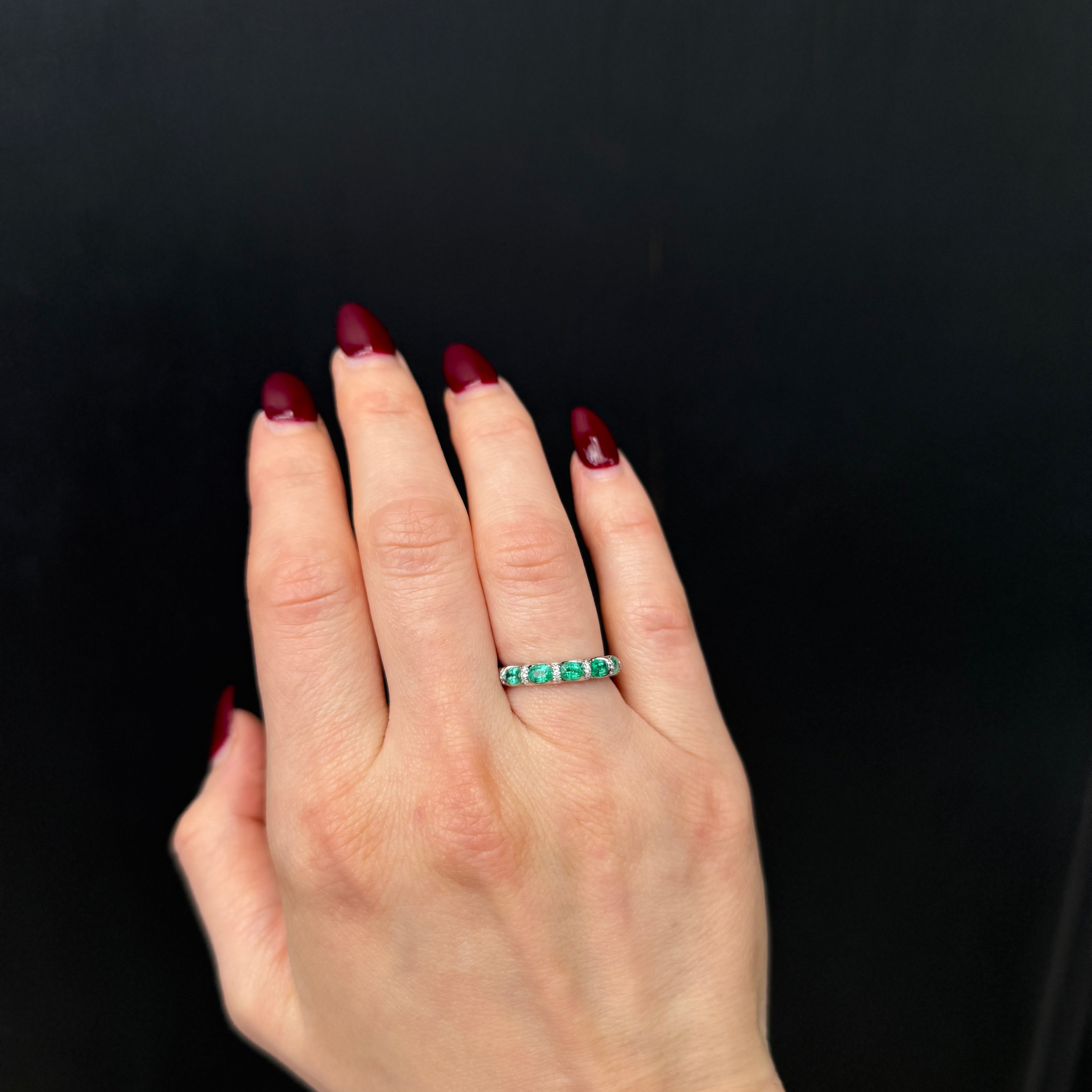14K white gold, emerald, and diamond band. This striking band features five horizontally-set oval cut emeralds arranged across the top in a graceful row. Each vibrant green emerald is nestled between delicate ribbons of three round brilliant cut diamonds, creating a rhythmic pattern of color and sparkle. Crafted in 14K white gold, this elegant design is both timeless and distinctive—perfect for stacking or wearing solo.