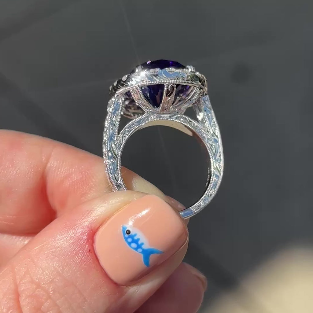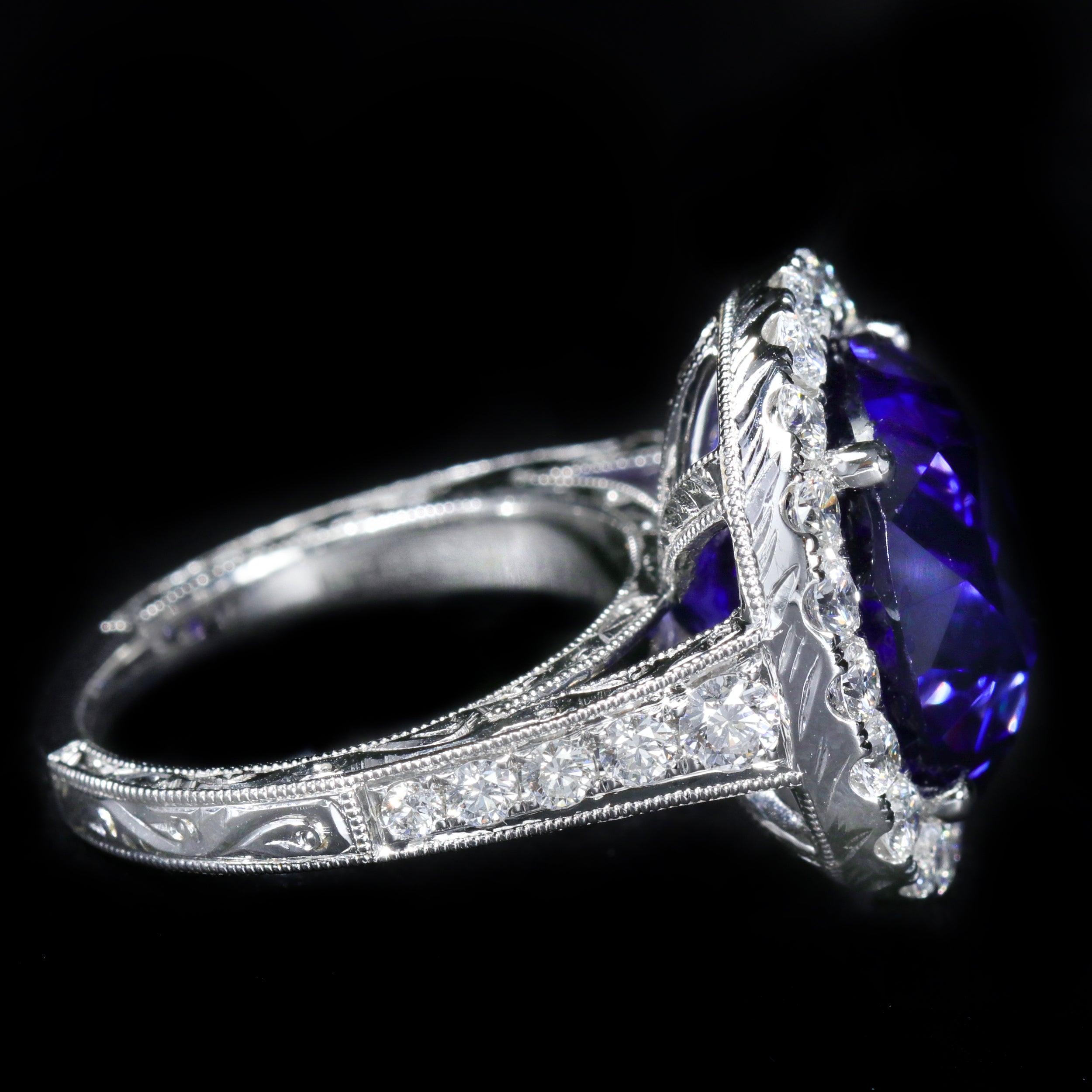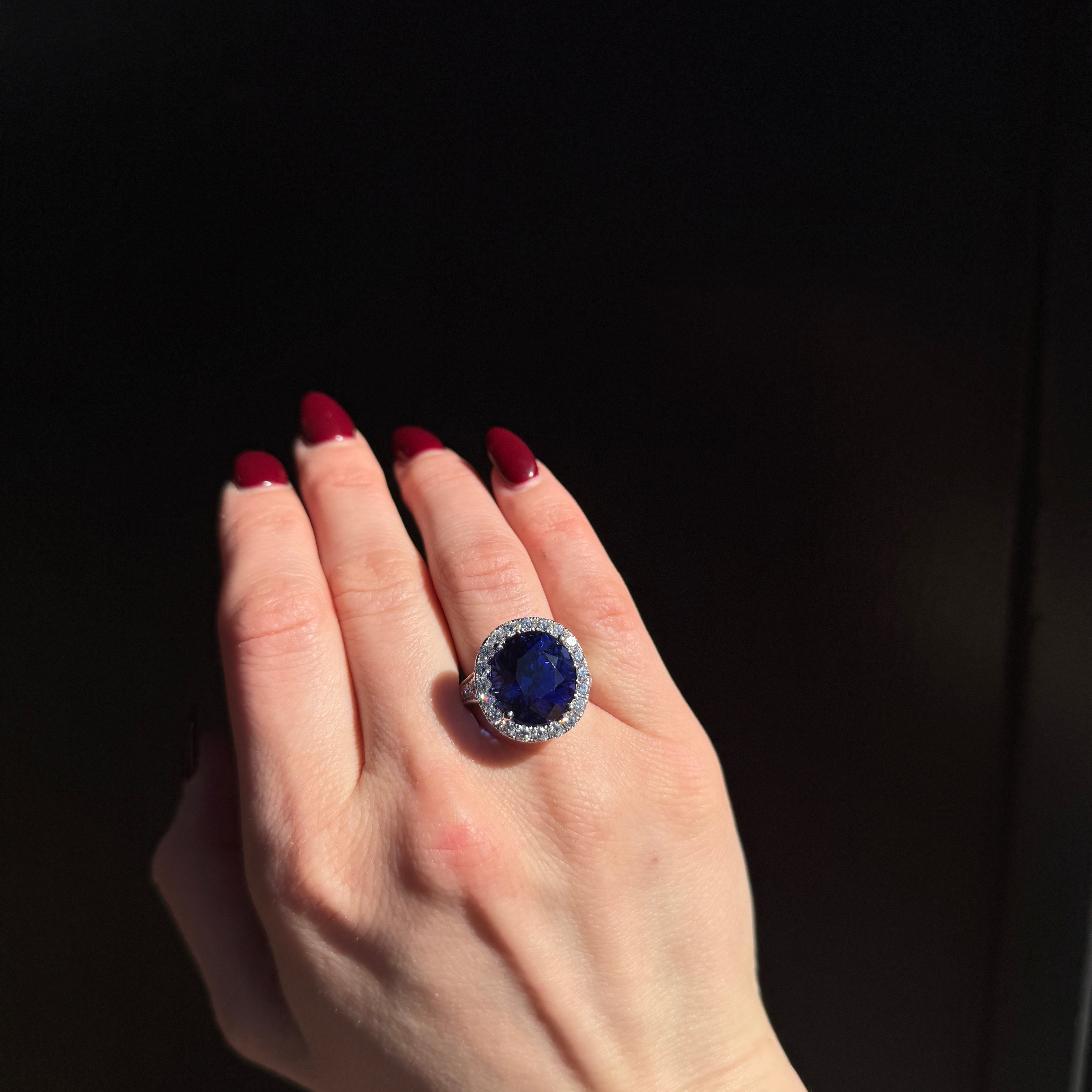 14k white gold, tanzanite, and diamond ring. This striking, stunning, and sizeable cocktail ring highlights a bright and beautiful oval cut tanzanite, weighing over 13 carats. The entrancing gemstone radiates within a dazzling round brilliant cut diamond halo, leading to the sparkling diamond-set shoulders.