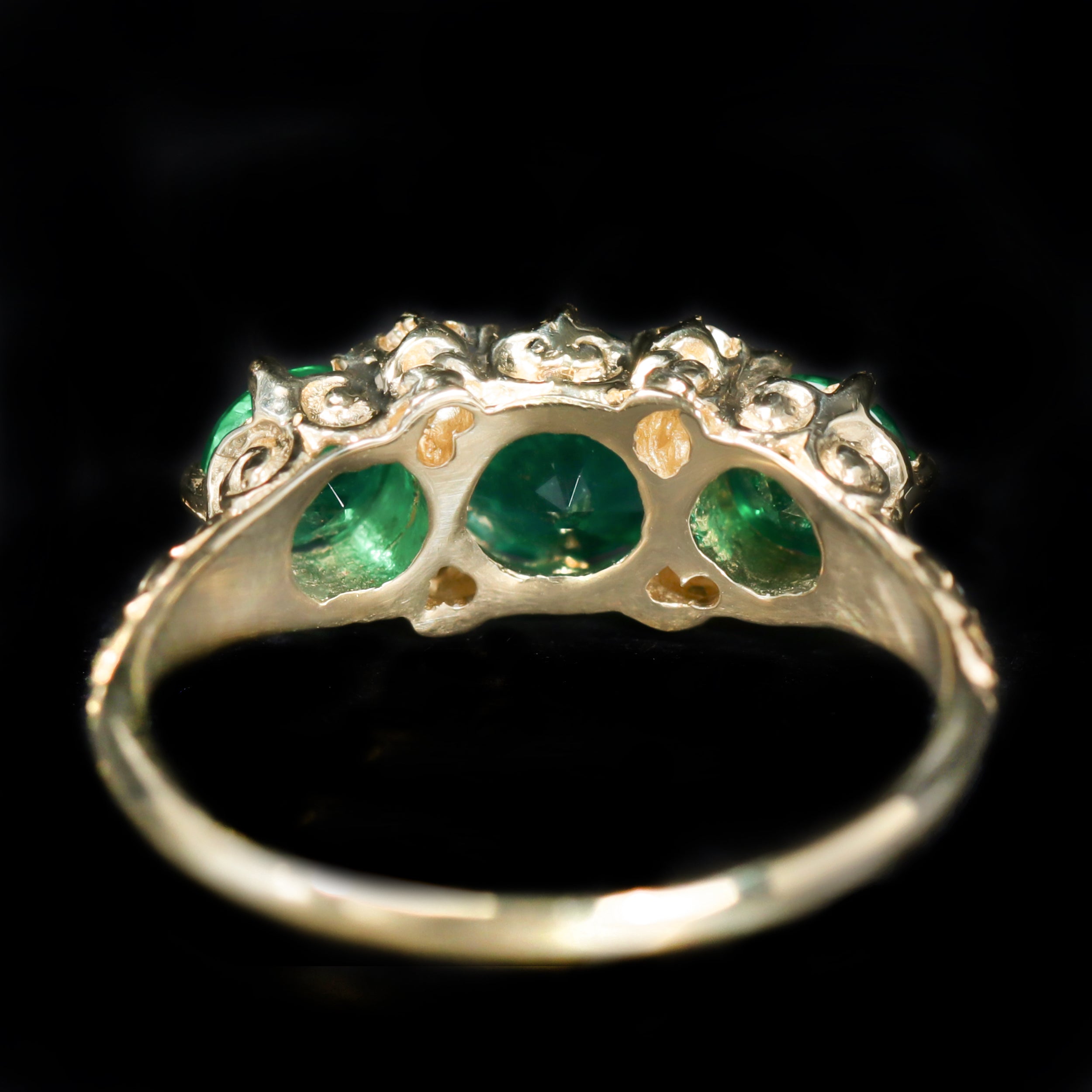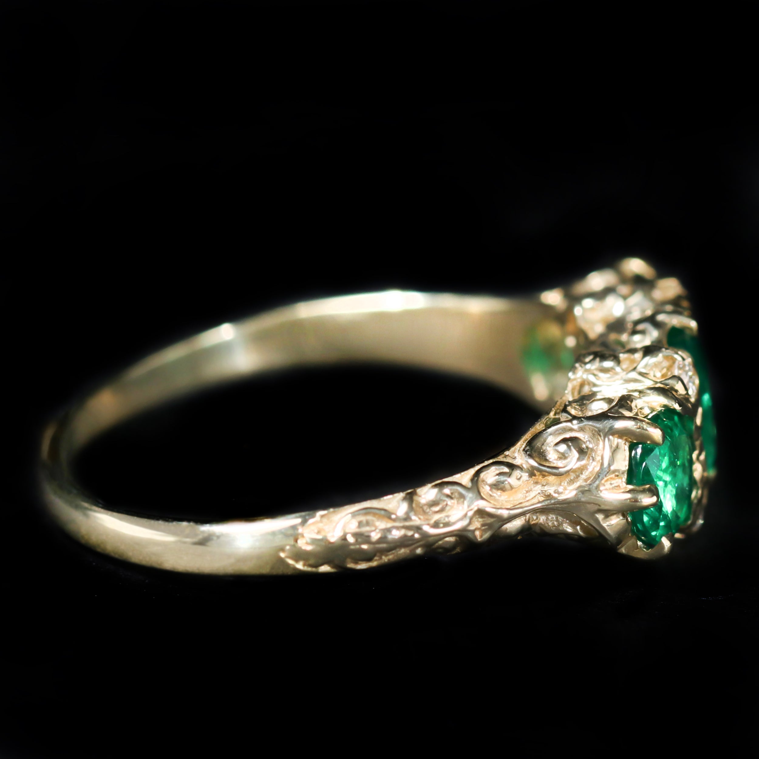 14k yellow gold, emerald, and diamond ring. This elegant 14k yellow gold ring features a timeless three-stone design, showcasing three vibrant green emeralds prong-set across the center. Each emerald is separated by two sparkling diamonds, adding brilliance and contrast to the lush green emeralds. The mounting is adorned with intricate sculptural engraving, lending a lovely vintage charm to the piece.