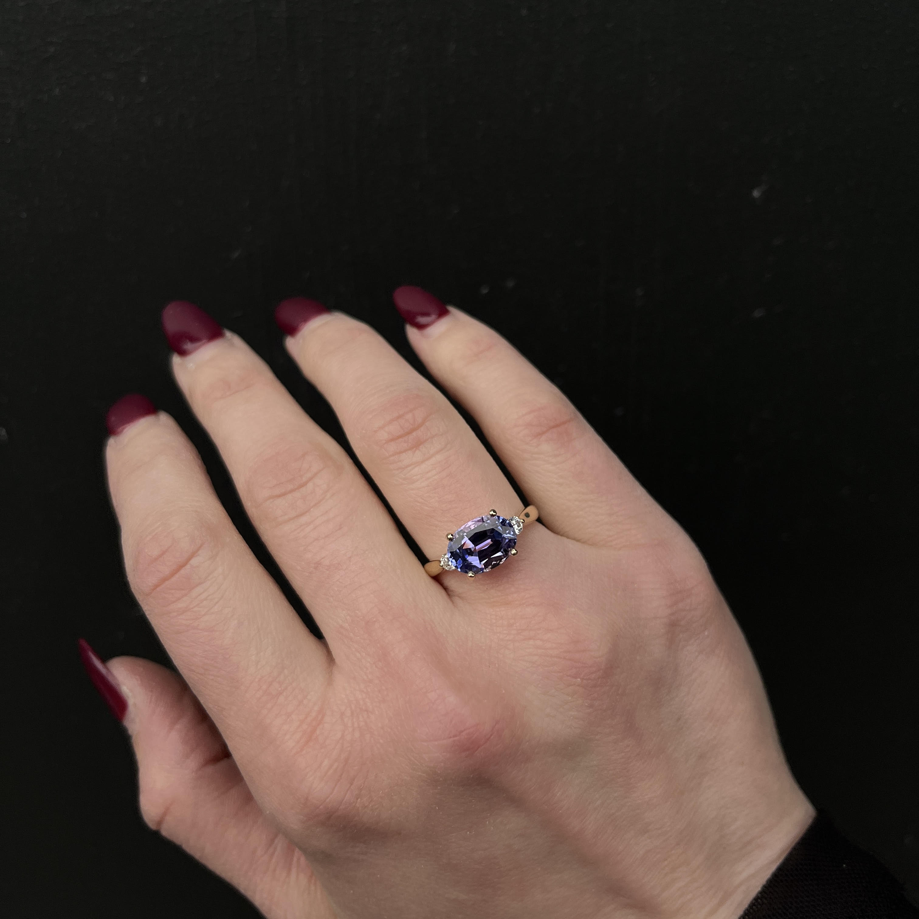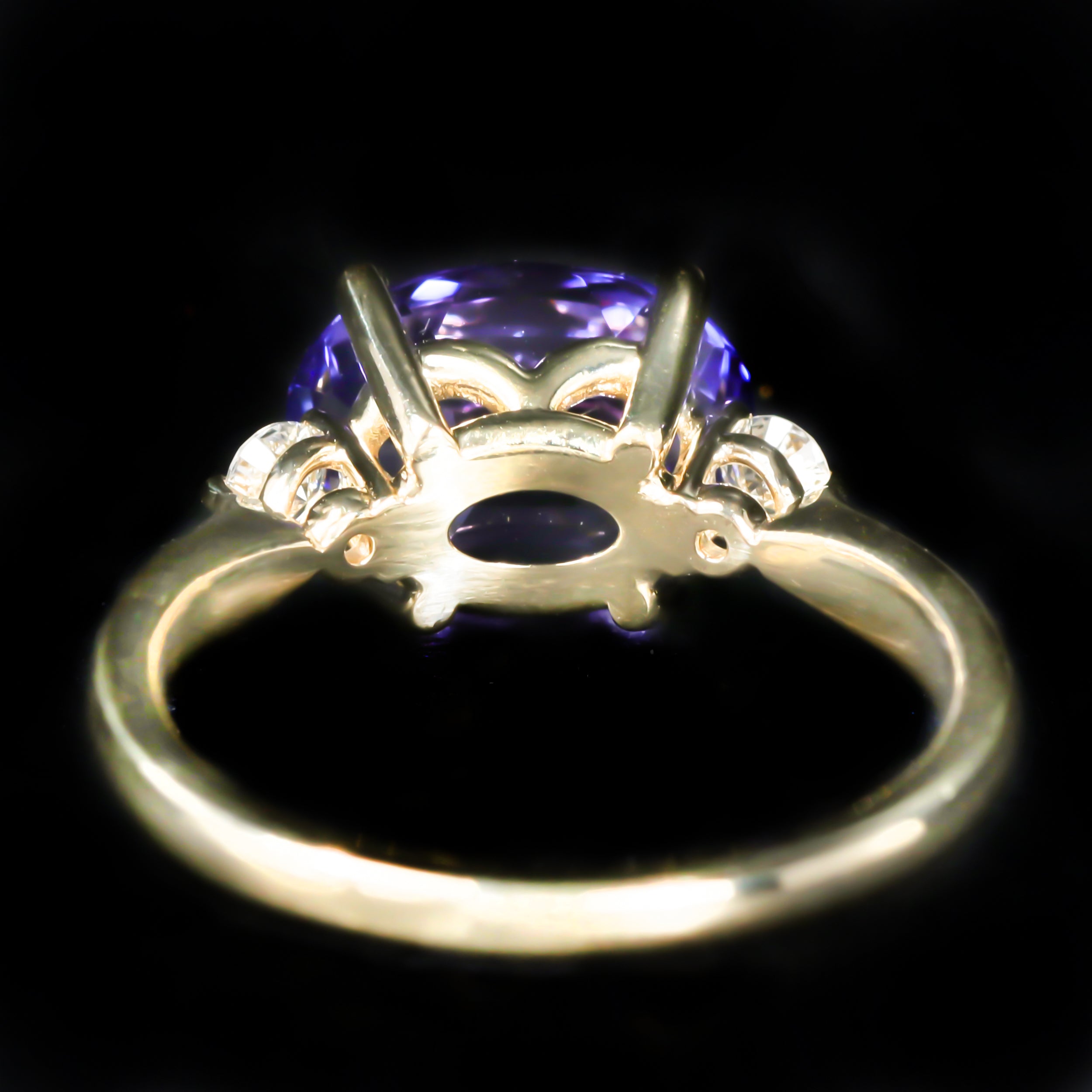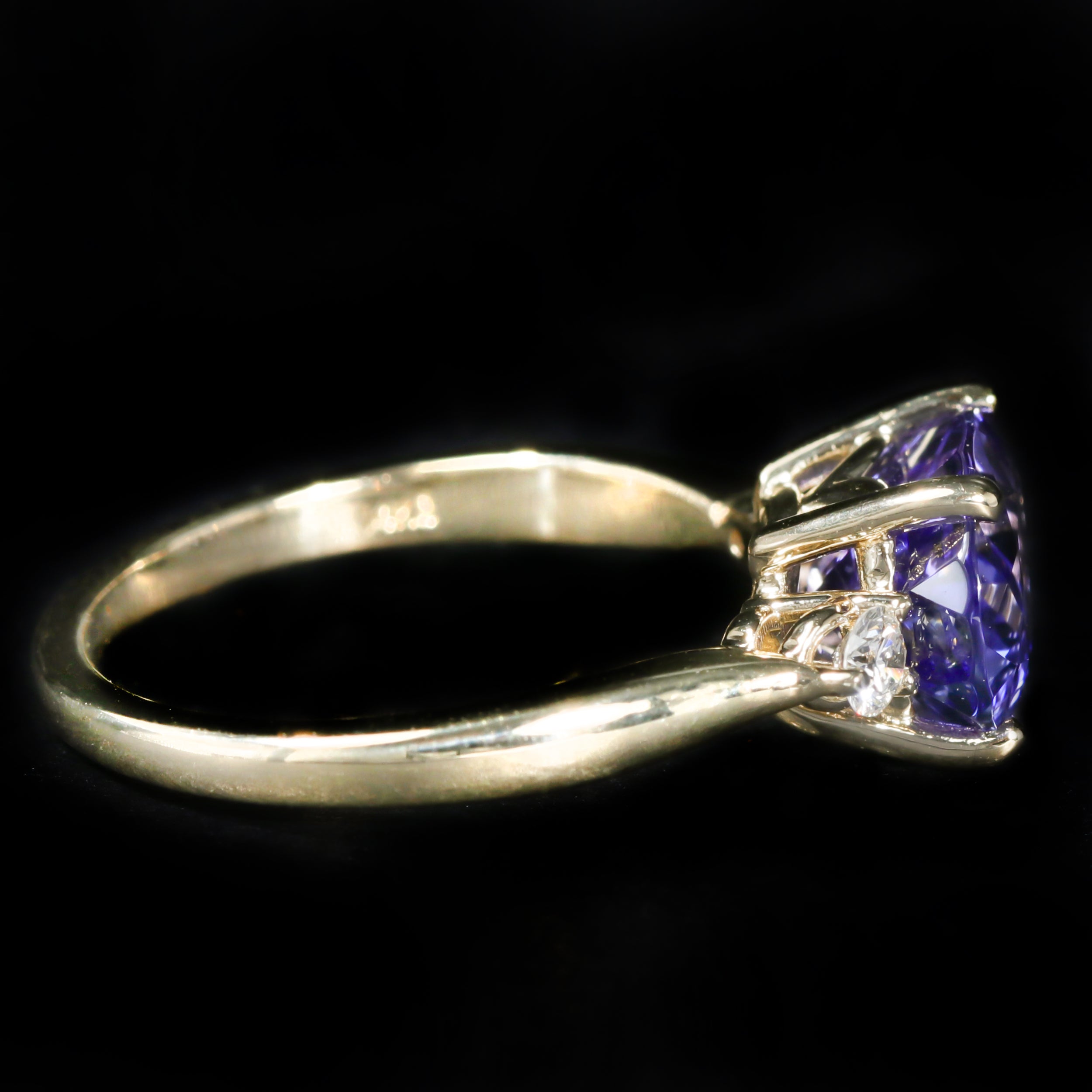 14K yellow gold, tanzanite, and diamond ring. This breathtaking three-stone design, rendered in gleaming yellow gold, highlights a striking oval-cut tanzanite. Casting a vibrant combination of cornflower blue and violet hues, the tanzanite glistens and glows horizontally between two sparkling round brilliant cut diamonds.