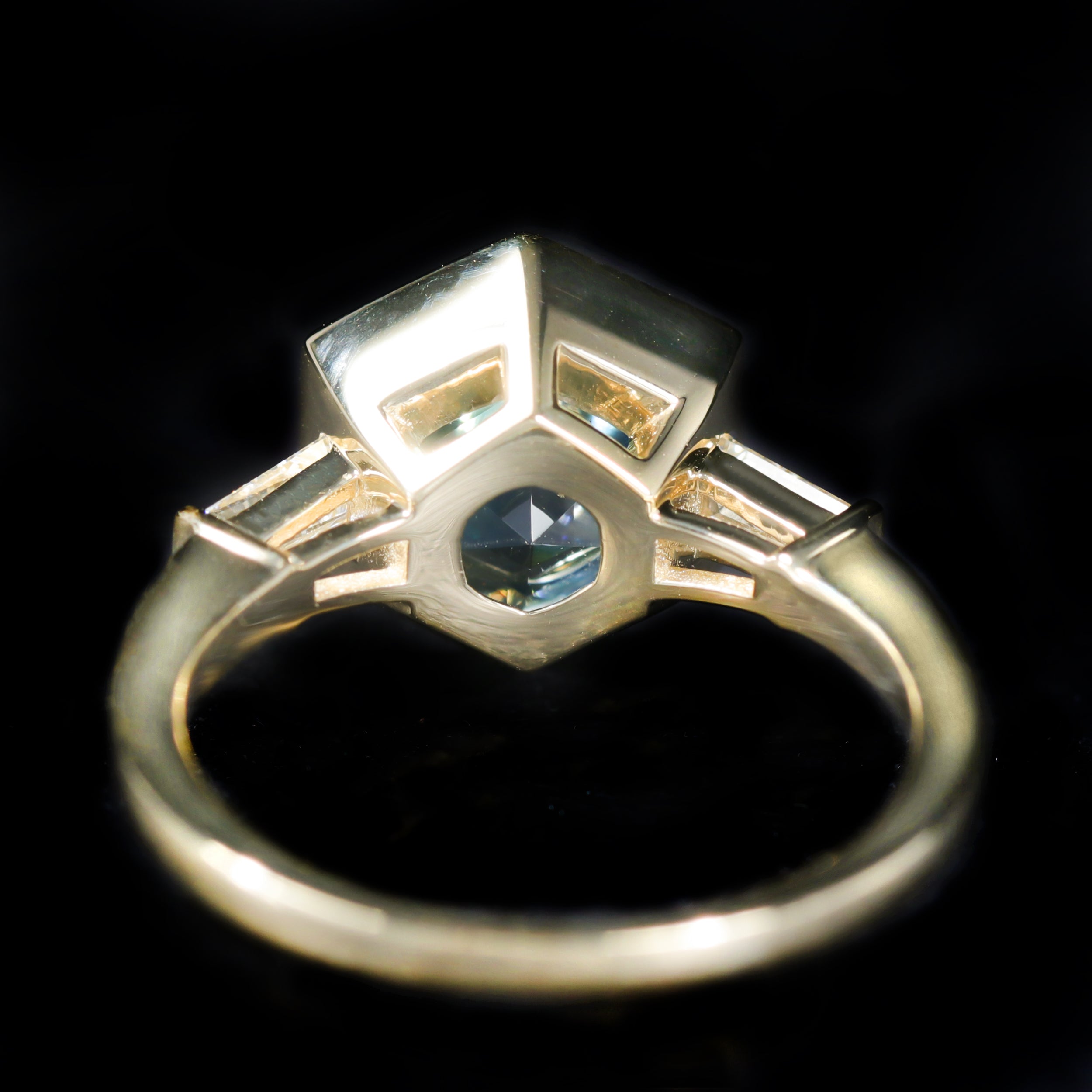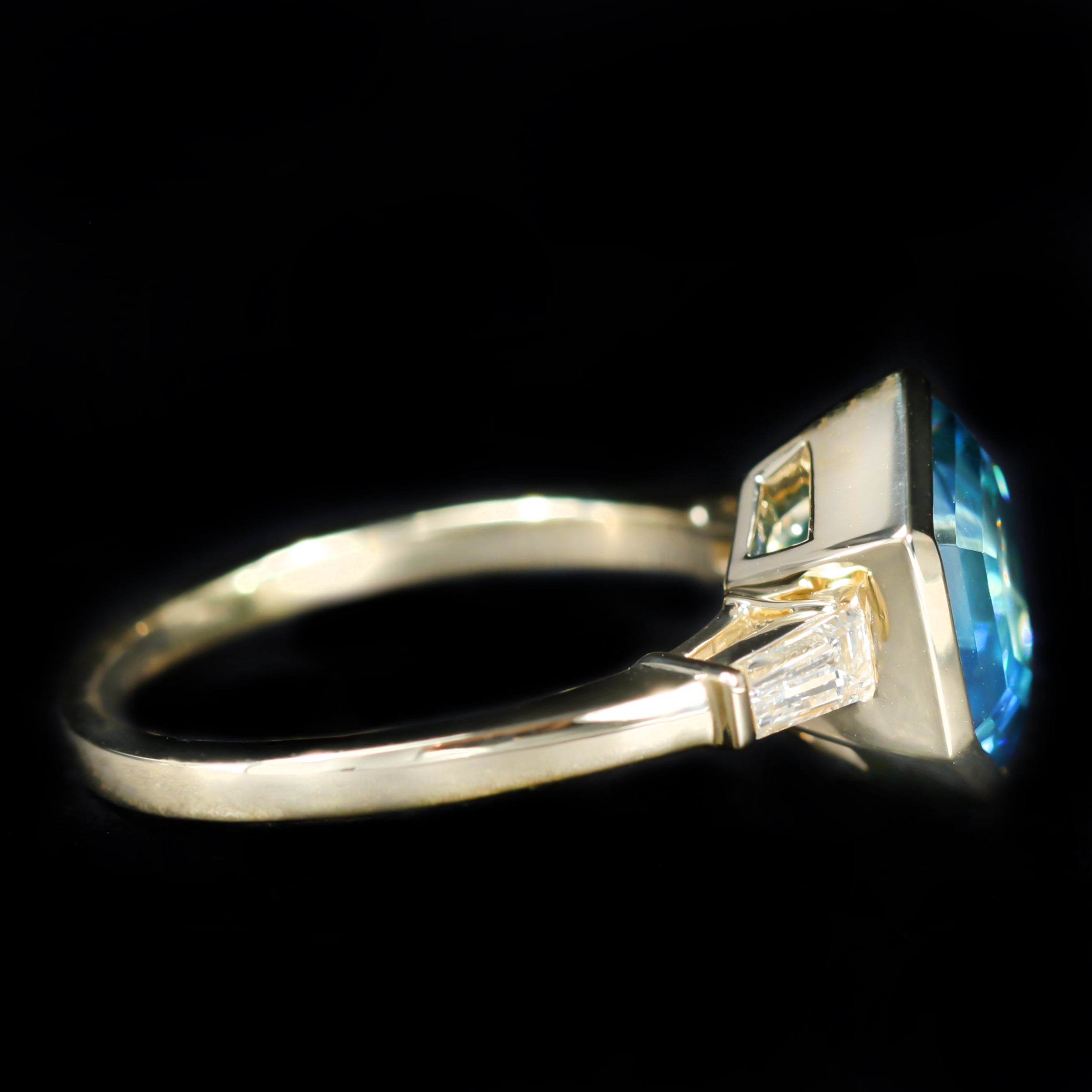 14K yellow gold, zircon, and diamond ring. This 14K yellow gold ring centers a gorgeous hexagon cut blue zircon, bezel set to showcase its vivid brilliance and unique geometry. Framing the center gem are two tapered baguette diamonds, set into the shoulders for a clean, architectural silhouette—an eye-catching piece that feels both distinctive and timeless.